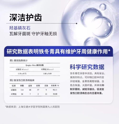 ✅添加活性成分铁冬青提取物 在牙膏中使用可降低牙菌斑的聚集,减轻牙龈炎、修护口腔黏膜、促进口腔溃疡的愈 合,具有清火、凉血止血的护龈作用 ✅添加甘草酸二甲黄金成分,有效抑制口腔炎症因子产生 具有舒缓抗敏、抗炎的作用,修复因炎症引发的牙龈受损和口腔问题 ✅添加羟基磷灰石成分 能够矿化牙齿结构,降低牙菌斑的附着点,通过修复牙釉质 的作用温和改善牙齿外观。