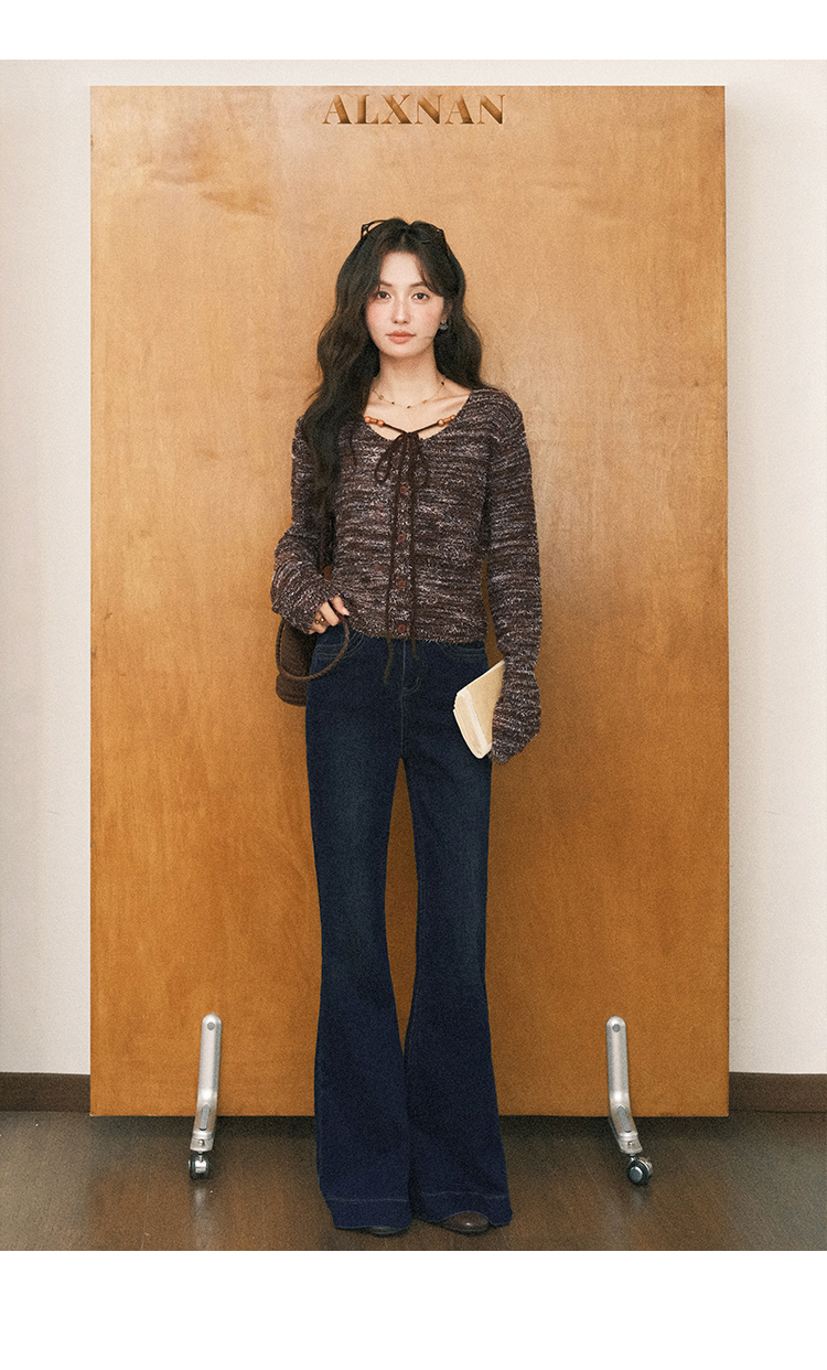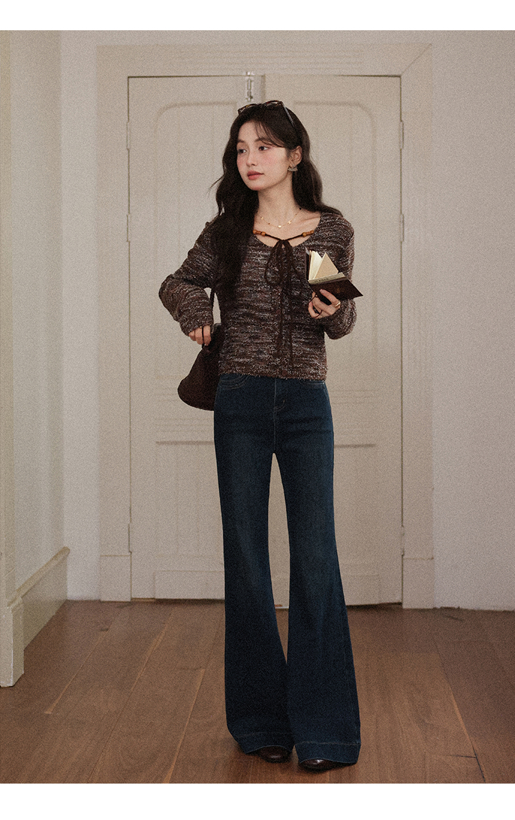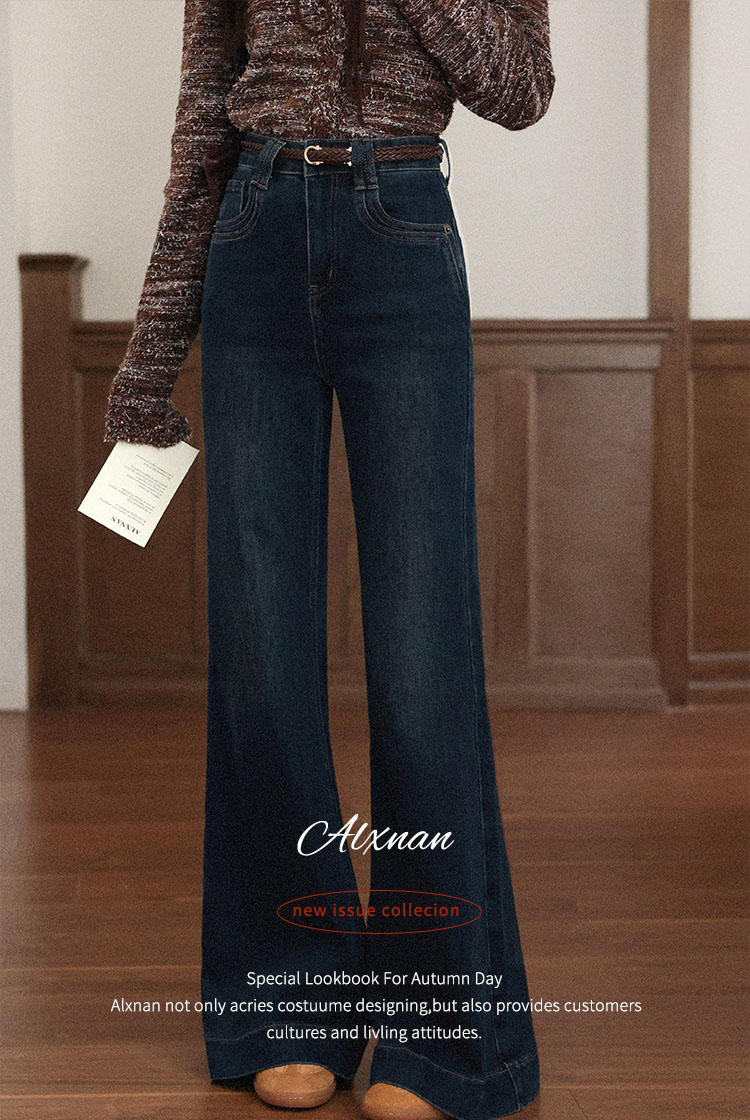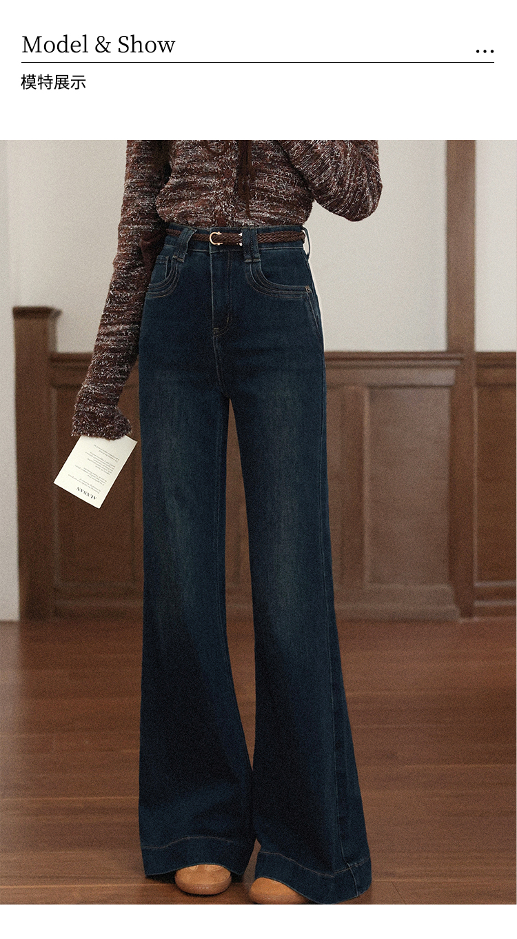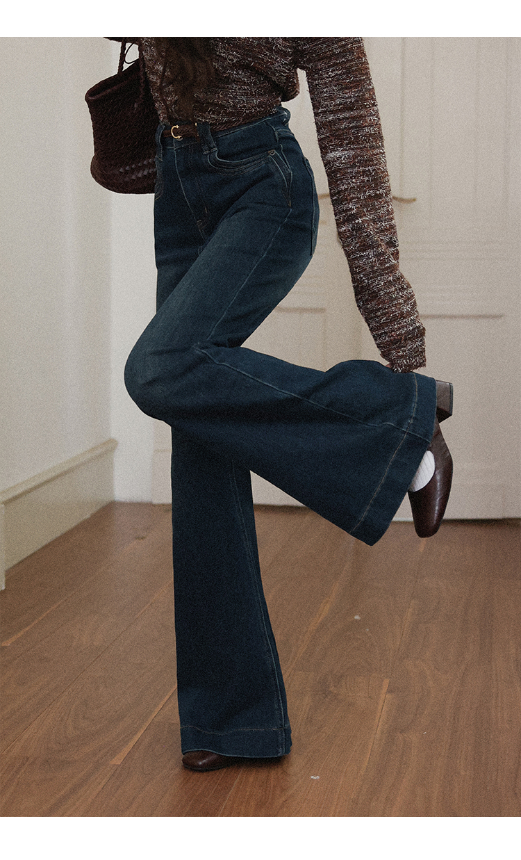 鹿向南「海浪轻吟」深蓝色复古高腰牛仔裤女早秋装新款修身微喇裤