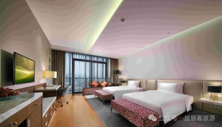 此次入住的豪华城景双床房,空间达 60 平方米,位于 5 至 16 层。房内设有两张宽敞的 1.35 米双人床,每间房均配备窗户与阳台。凭窗远眺,城市繁华尽收眼底,在阳台上休憩,清风拂面,惬意自在。