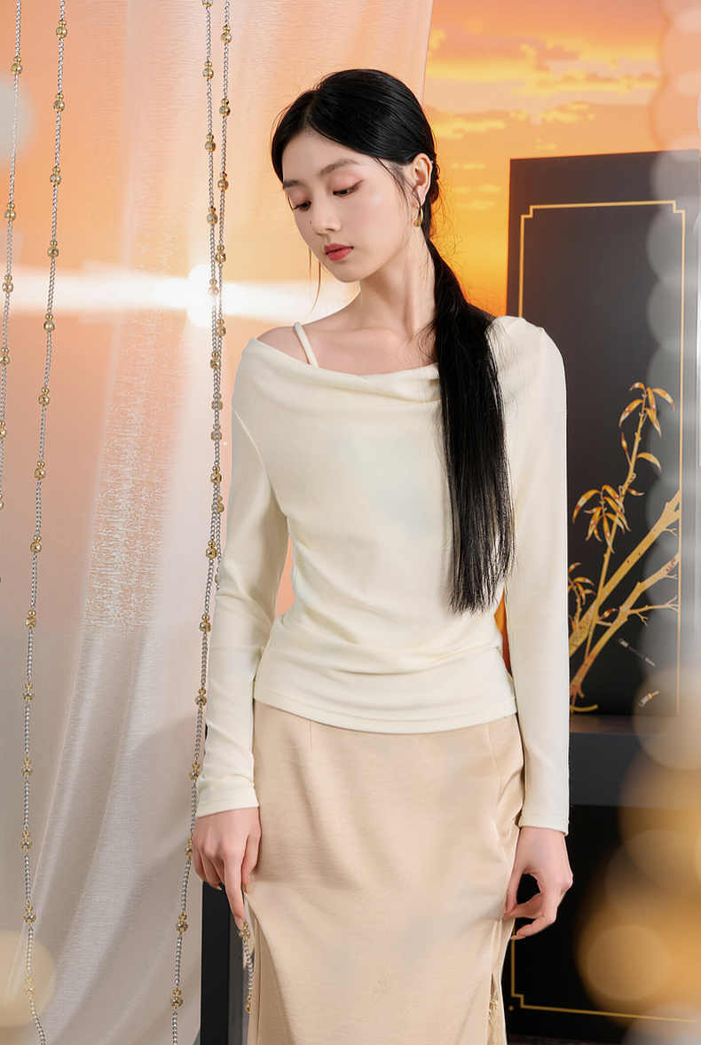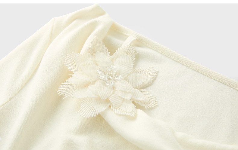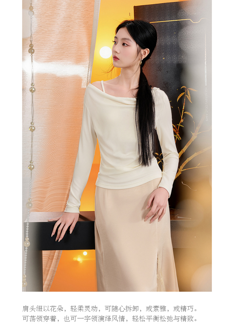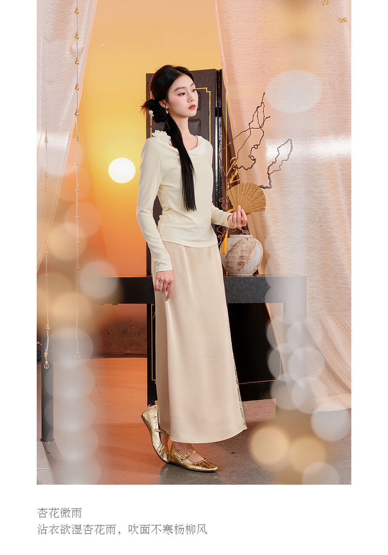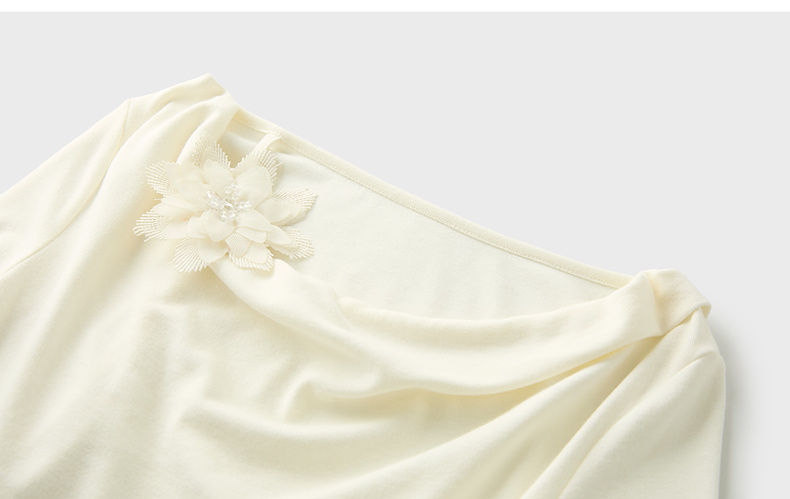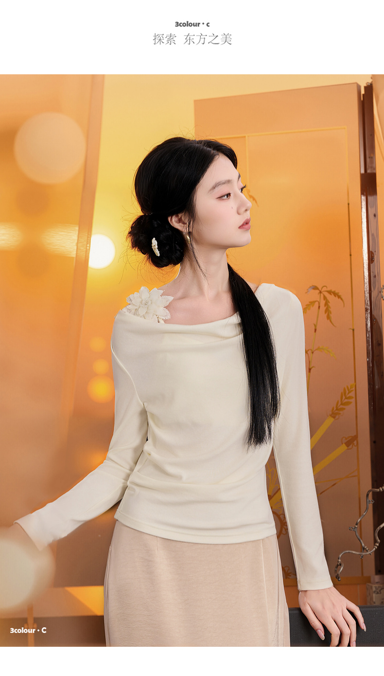 三彩【杏花微雨】2025秋季新款荡领T恤立体花朵长袖修身中式C