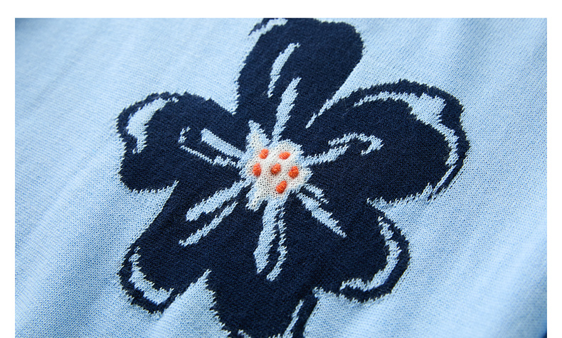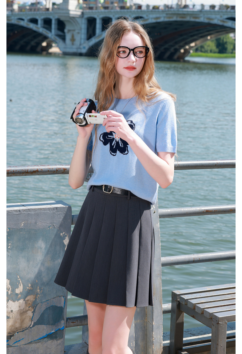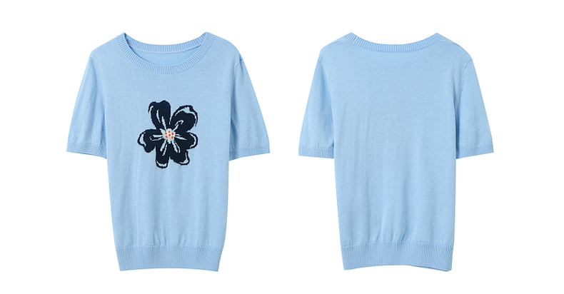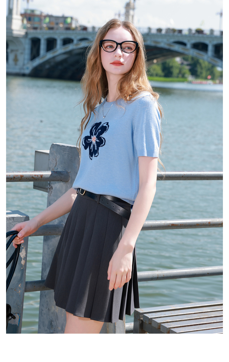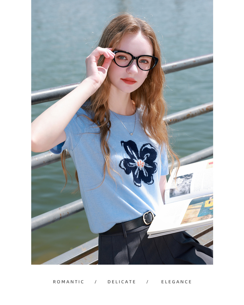 三彩2025秋季新款花朵针织衫圆领短袖毛衫套头衫简约M