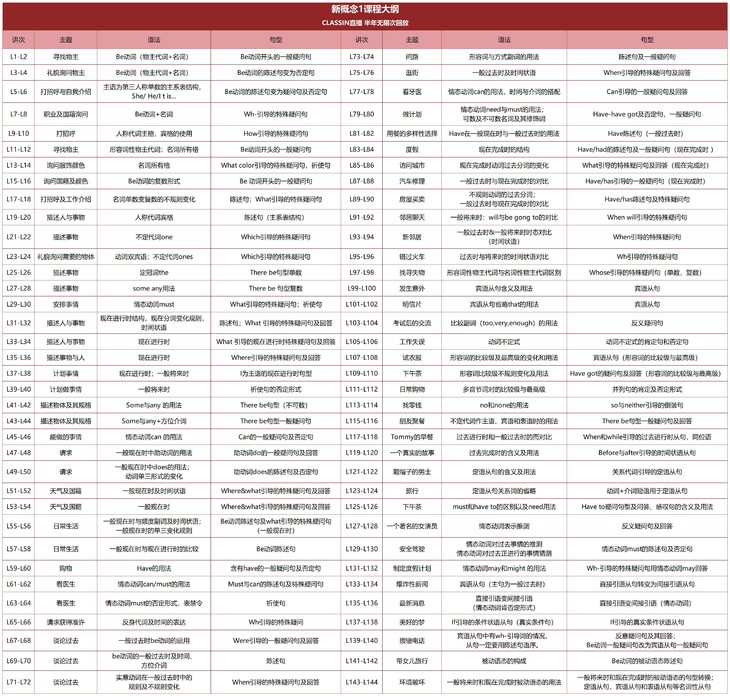 大纲的重难点设计与新概念教材的设计理念保持一致,语法点每12个新授课重复 一次,螺旋式上升。