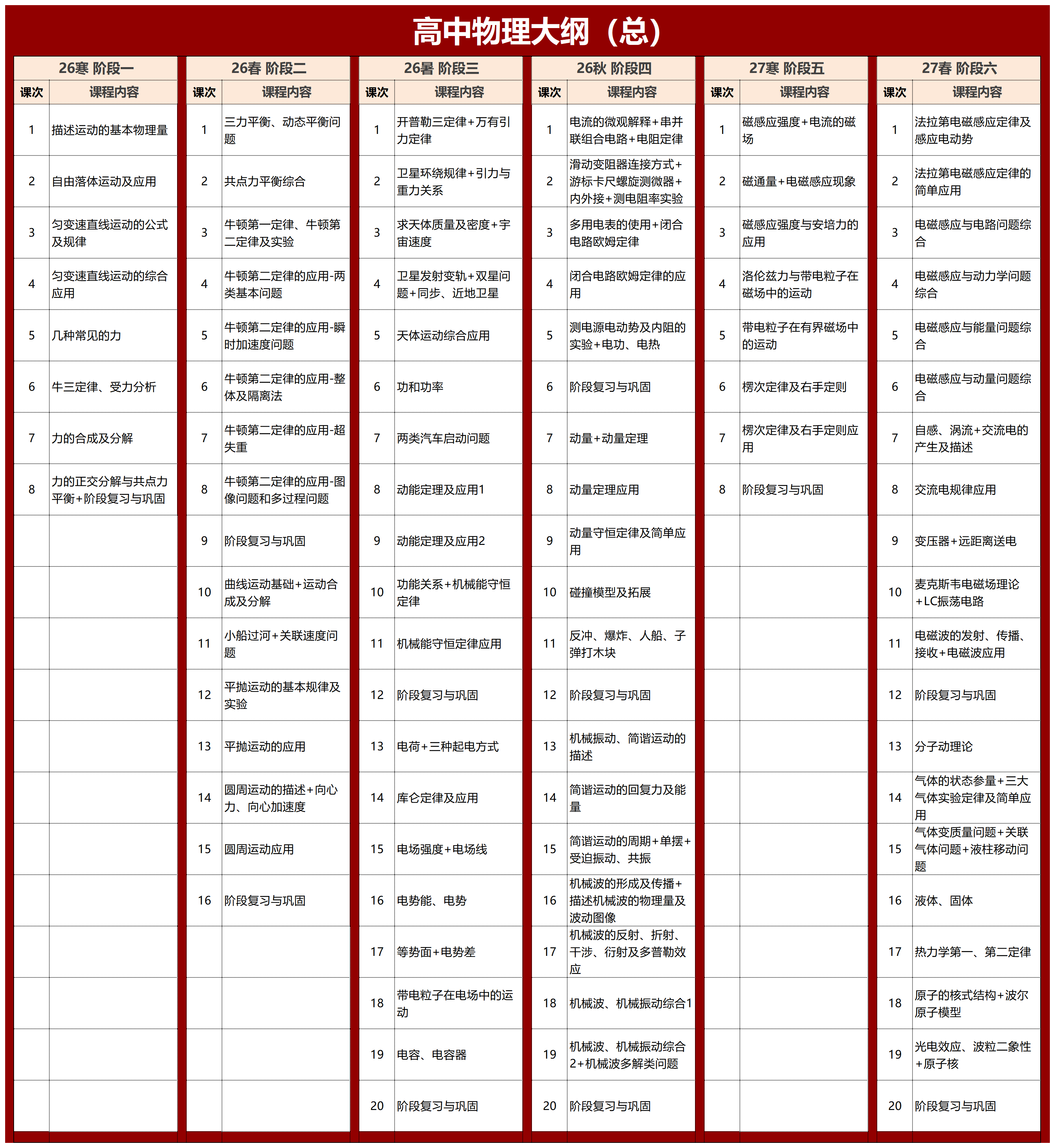 物理方面,要求学过力学、电学部分作为基础(2026寒假、春季课程会涉及力学知识,2026暑期课程内容开始涉及电学)