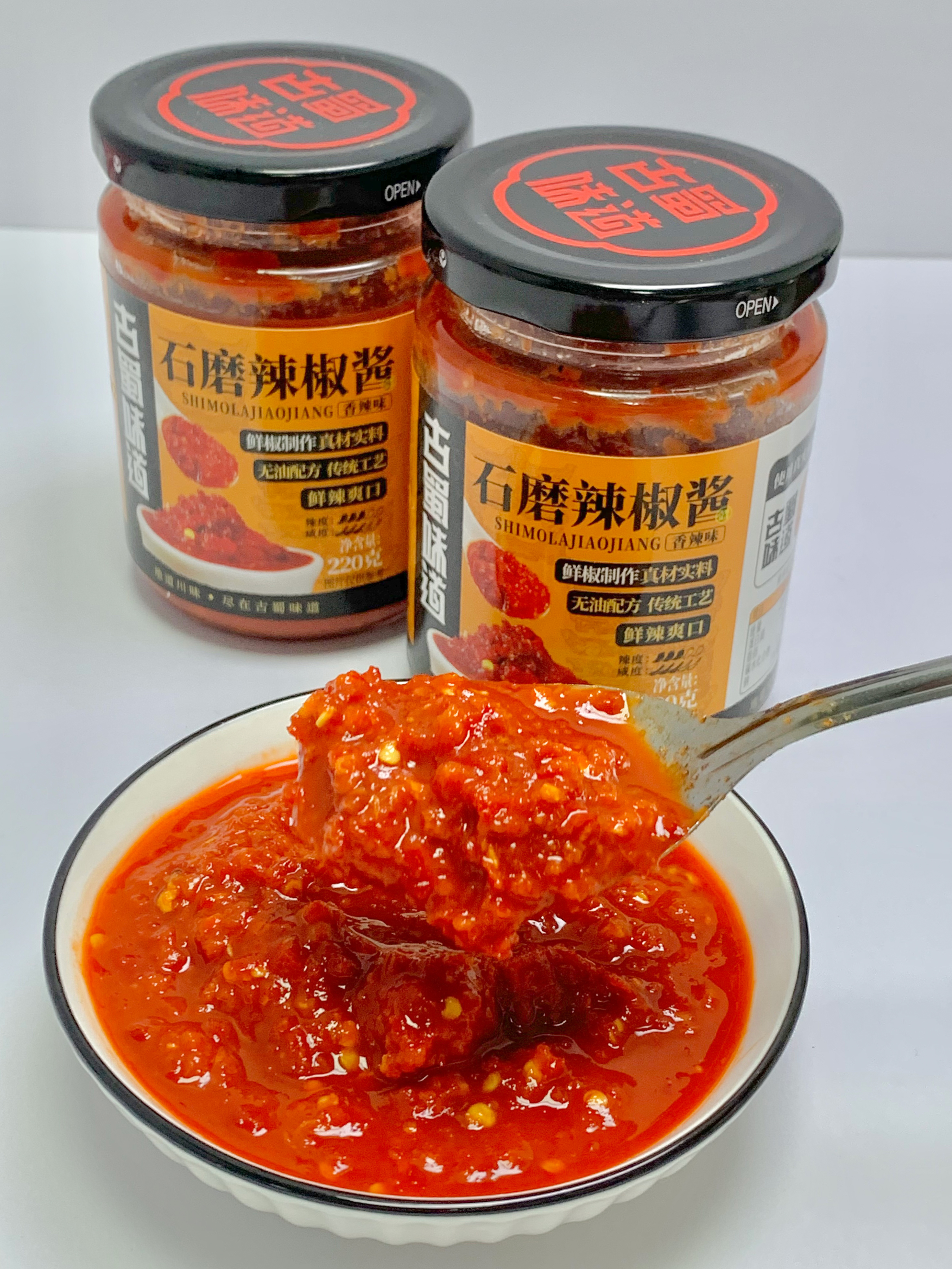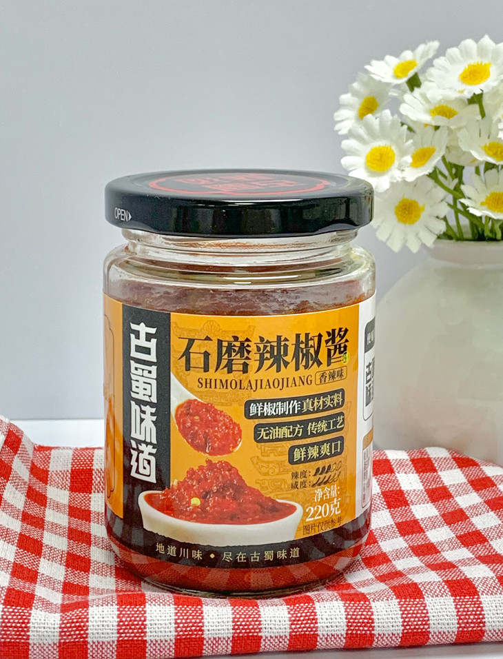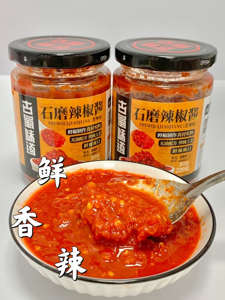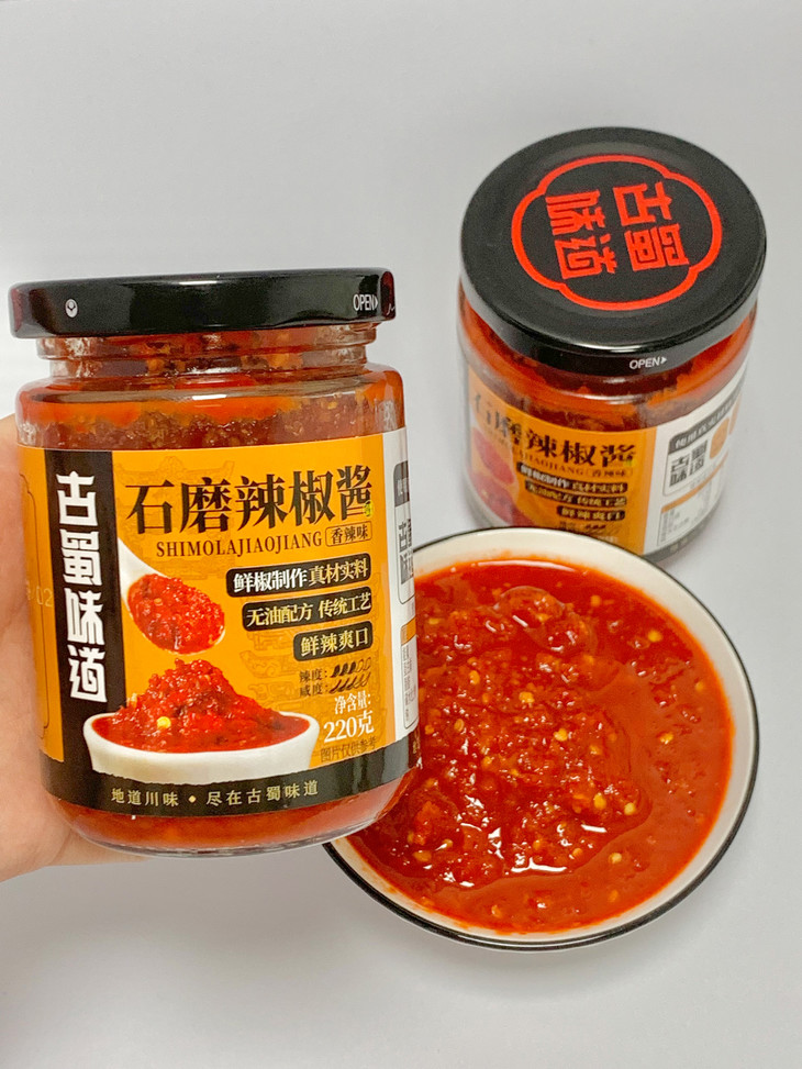 【商品名称】石磨辣椒酱 【品牌】古蜀味道 【上架规格】220g*3罐 【保质期】6个月 【生产日期】近2个月 【储存条件】置于阴凉干燥处保存 【发货地】成都 【生产地】四川 【发货快递】三通一达+极兔随机发货 【不发货地区】新疆、西藏、内蒙、海南 【加运费地区】黑吉辽、青海、甘肃、宁夏、深圳、上海+1元/件,北京+1.5元/件 【发货时效】72小时 【售后规则】 1、食品类不支持7天无理由退换货 2:若收到产品有质量问题或者破损少件,请签收24小时内对产品拍照+快递箱面单照片联系售后处理 3:个人口味问题不在售后范围内