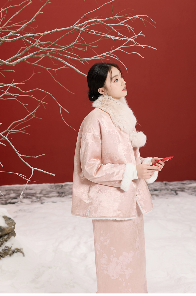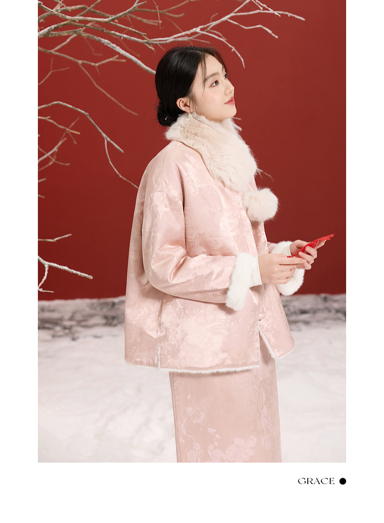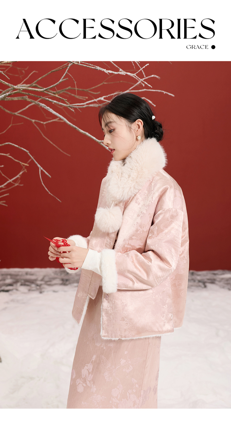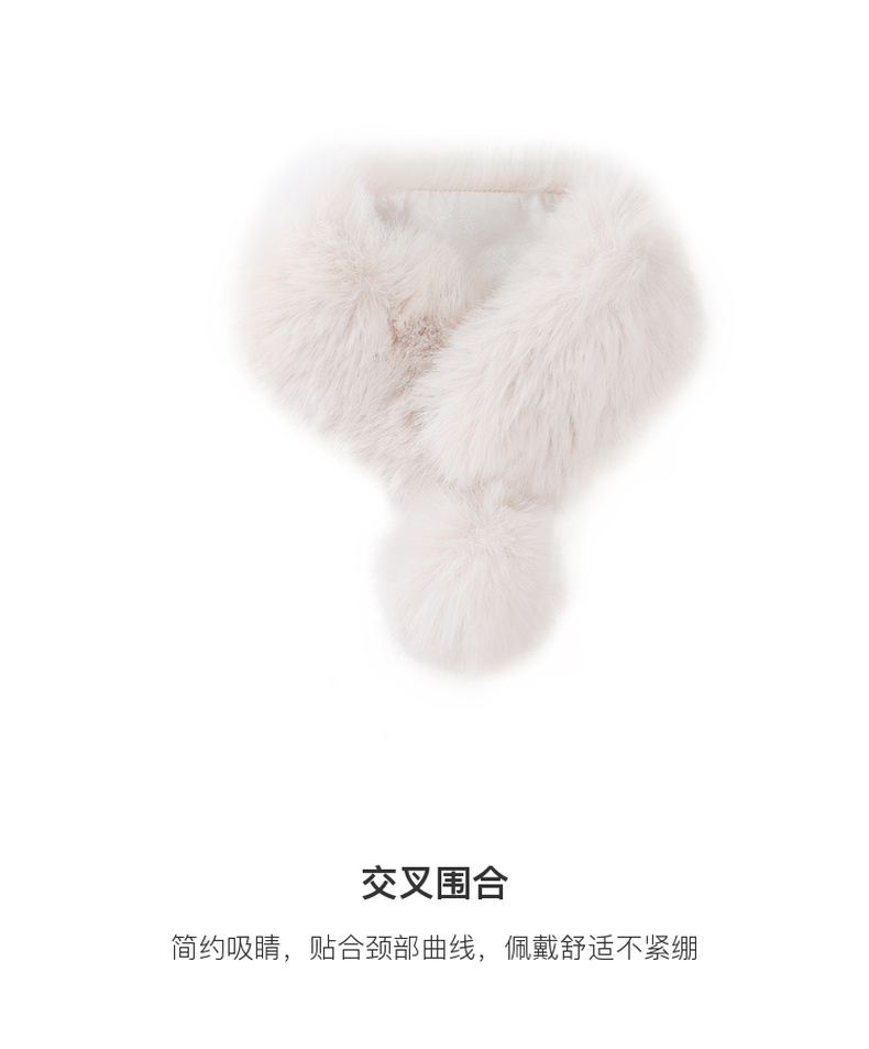 三彩2025新款国风环保皮草毛毛围巾小围脖交叉保暖毛绒球女温柔