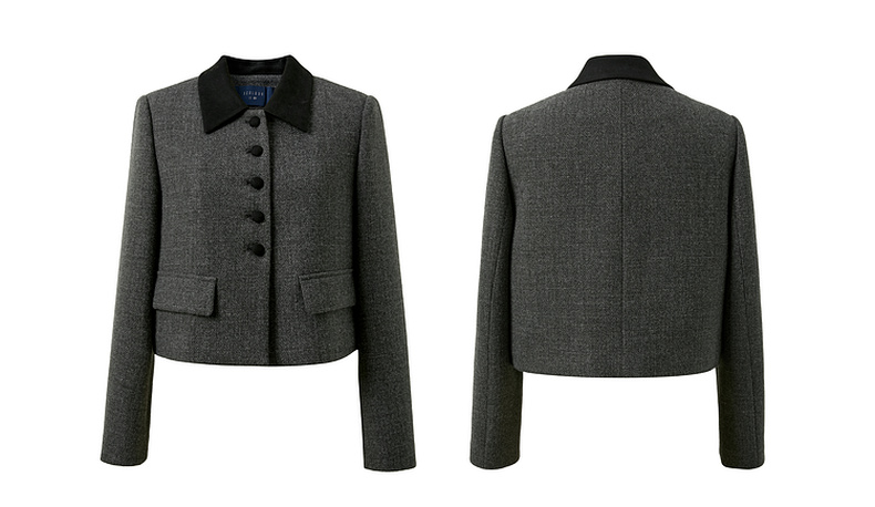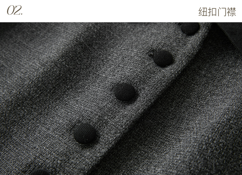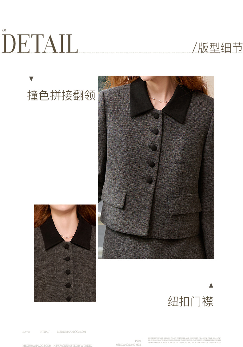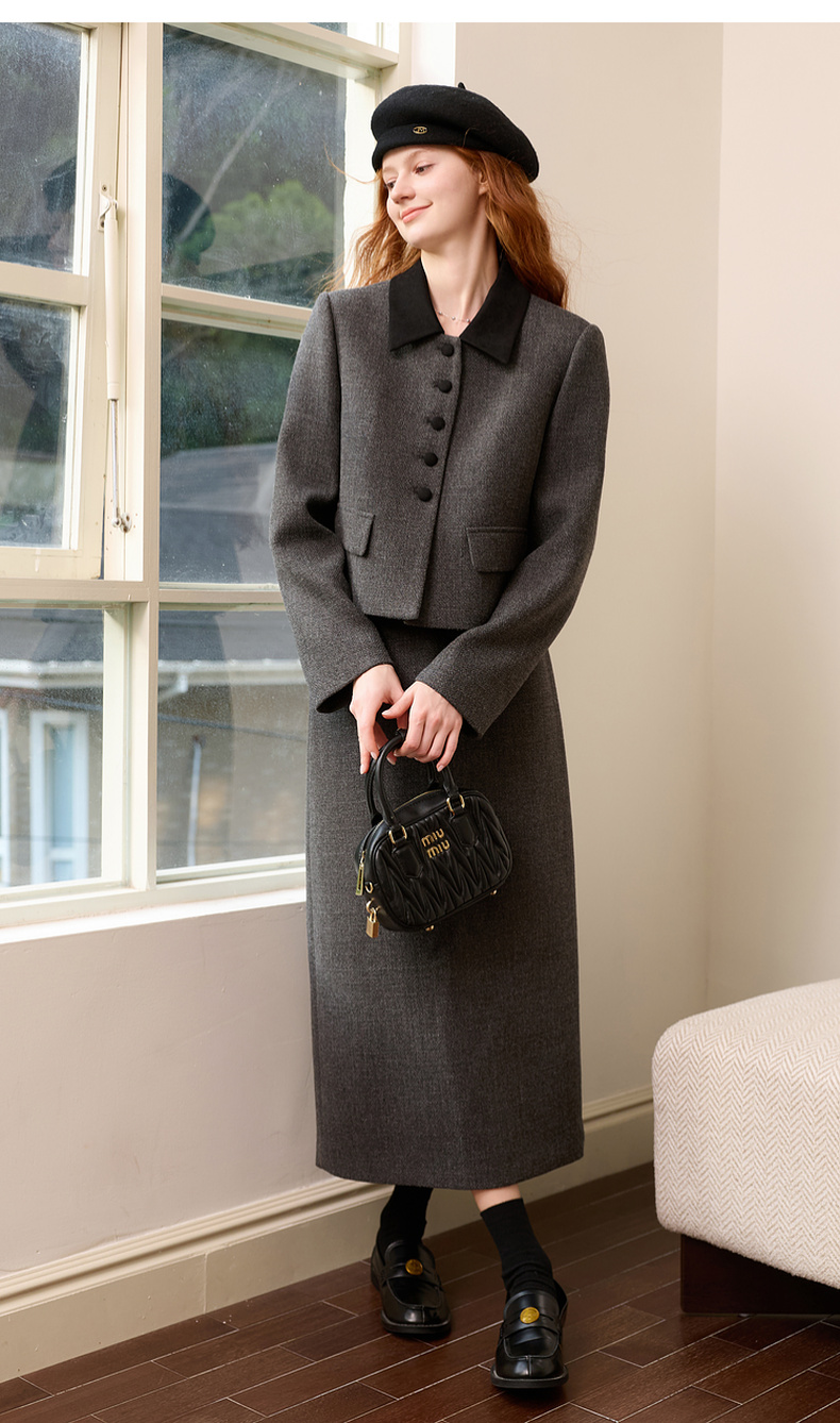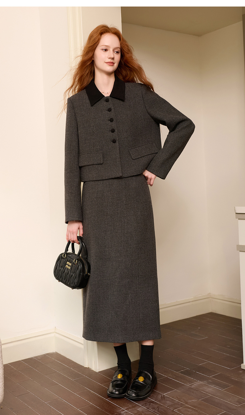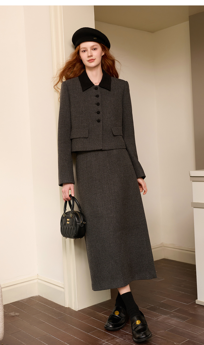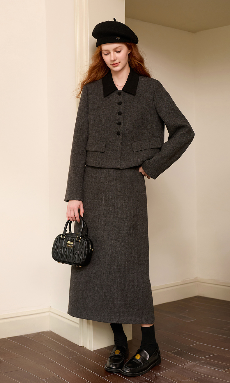 三彩2025冬季新款复古翻领套装香风夹棉外套直筒半身裙两件套M