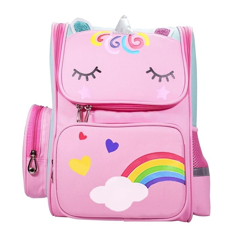可爱的小学背包,雷宝独角兽图案,两个不同的侧袋,一边带拉链可以放硬币或笔记本,另一边可以放水瓶,每个小孩都会喜欢这种英格兰风格。