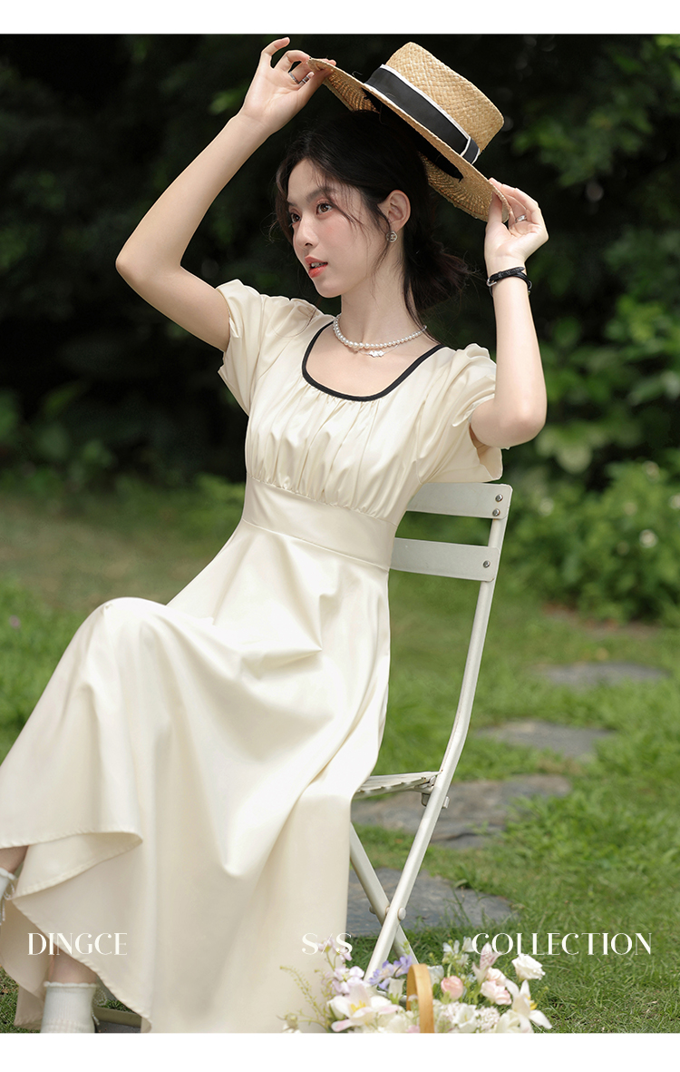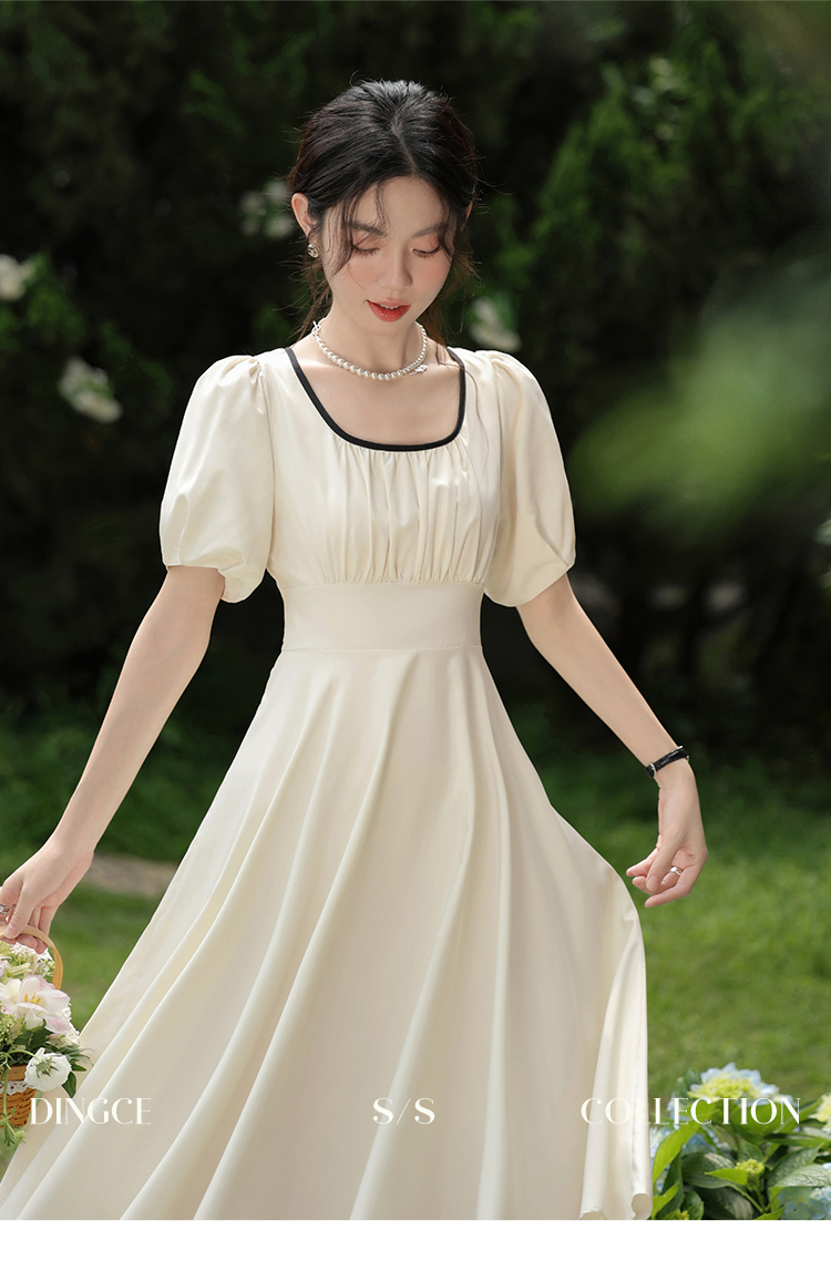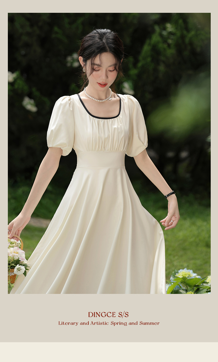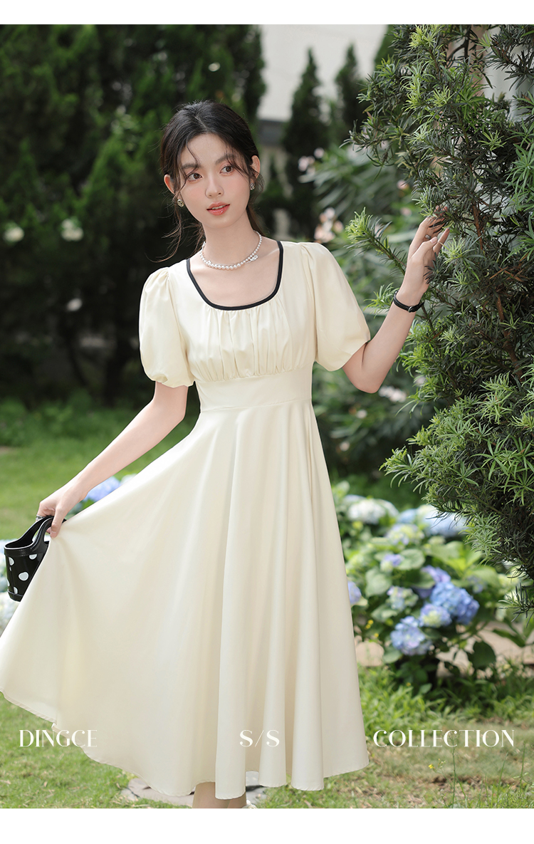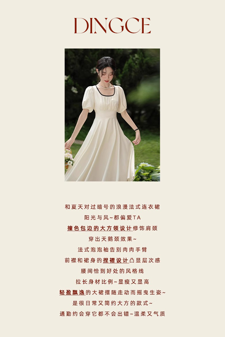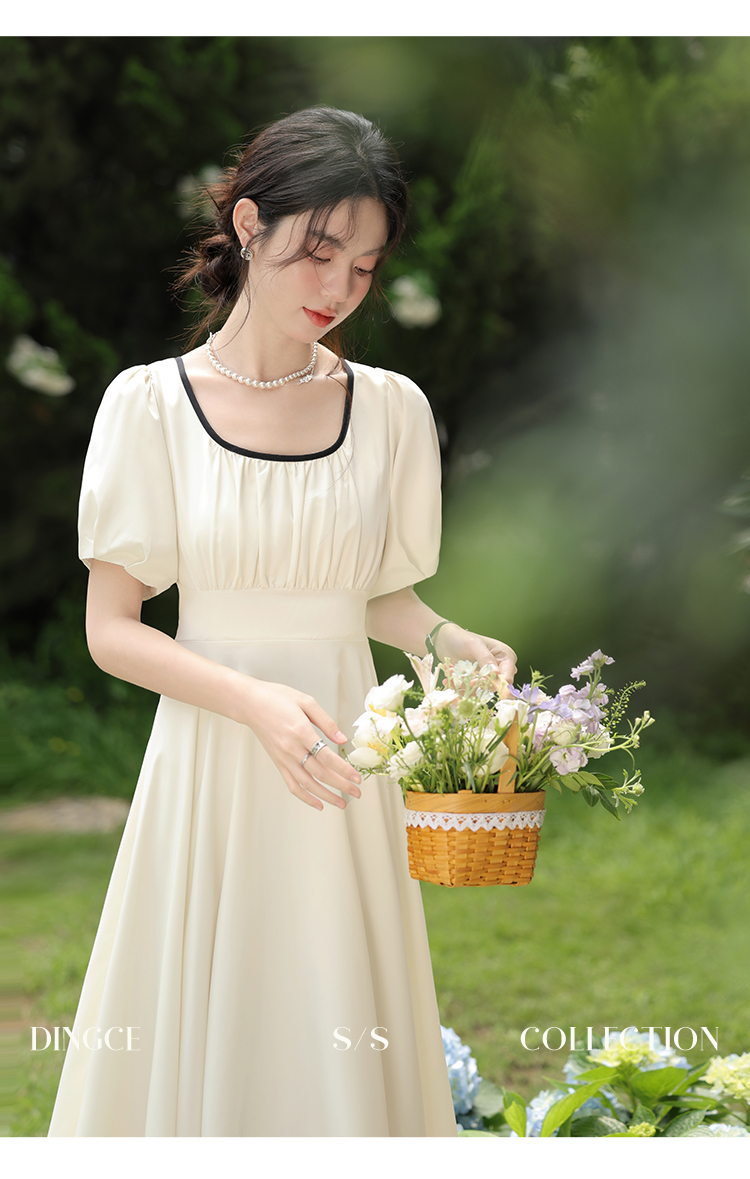 鹿向南 小个子「云上香草」法式方领连衣裙2024新款收腰气质中长裙女