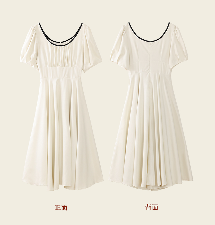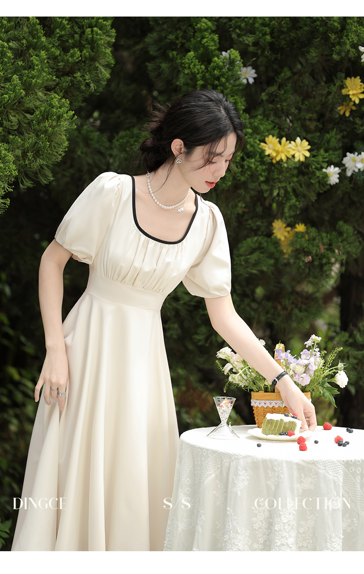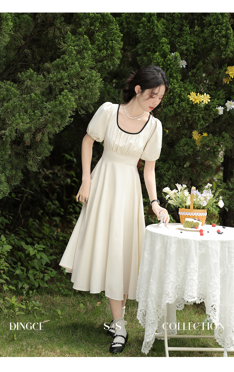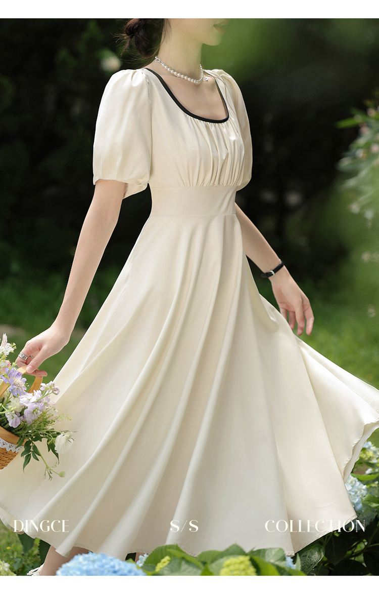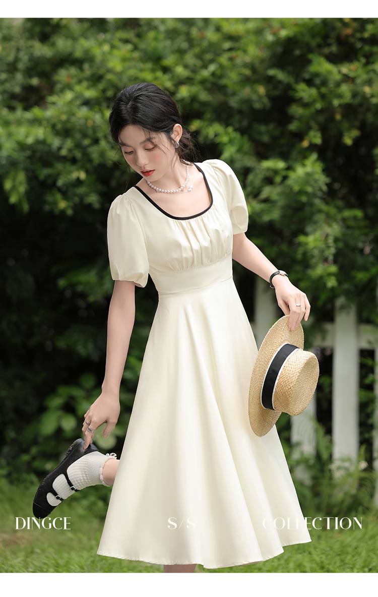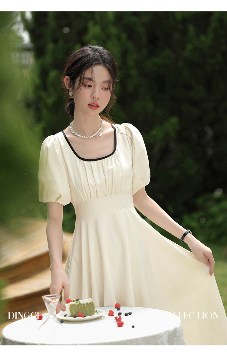 鹿向南 小个子「云上香草」法式方领连衣裙2024新款收腰气质中长裙女