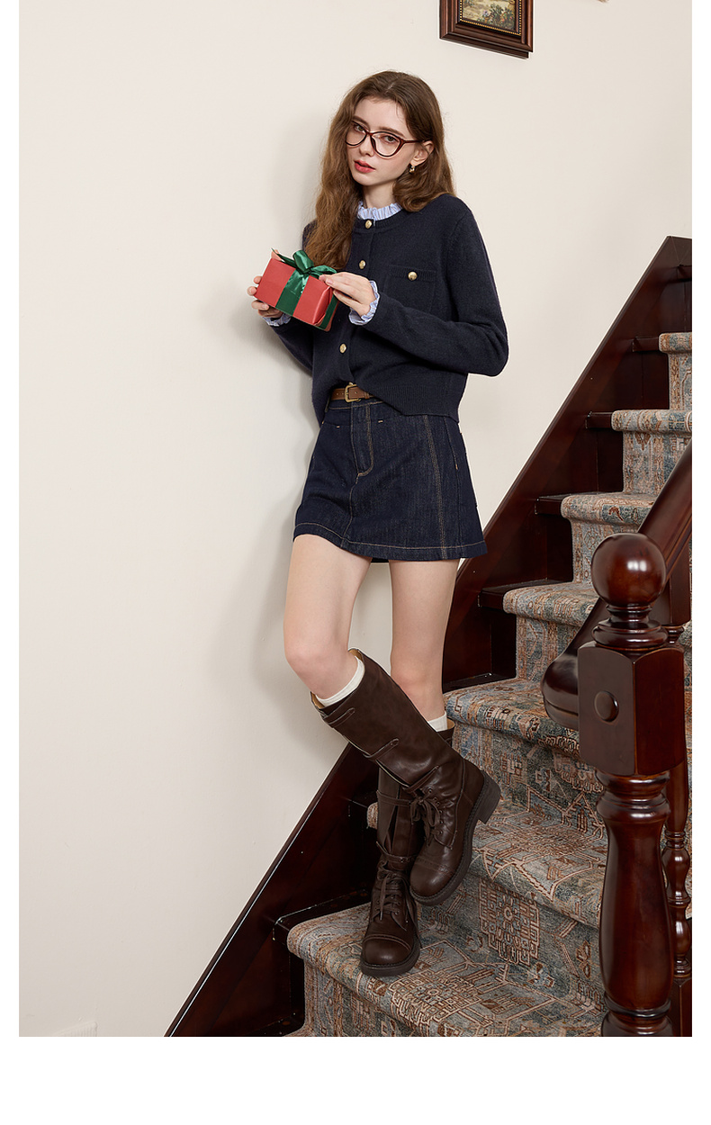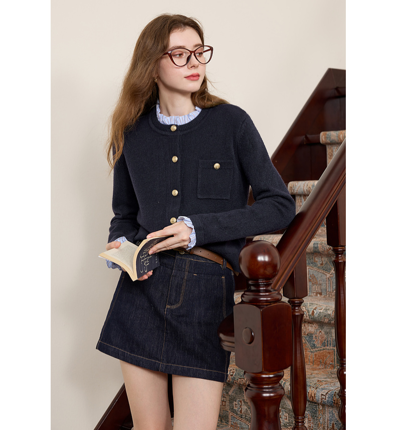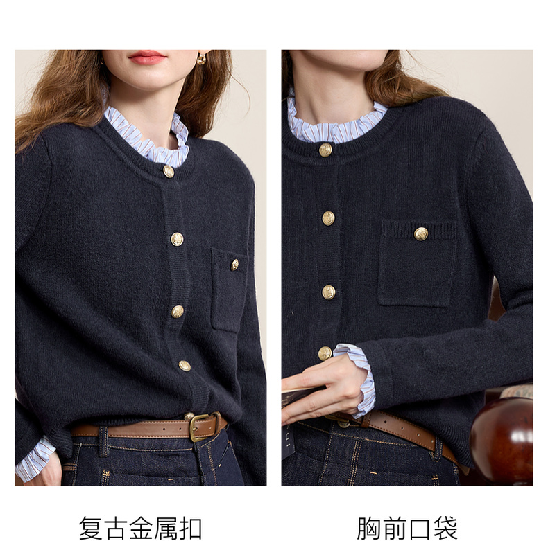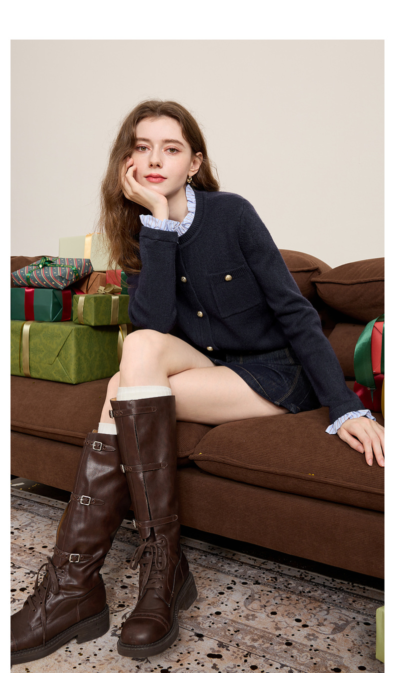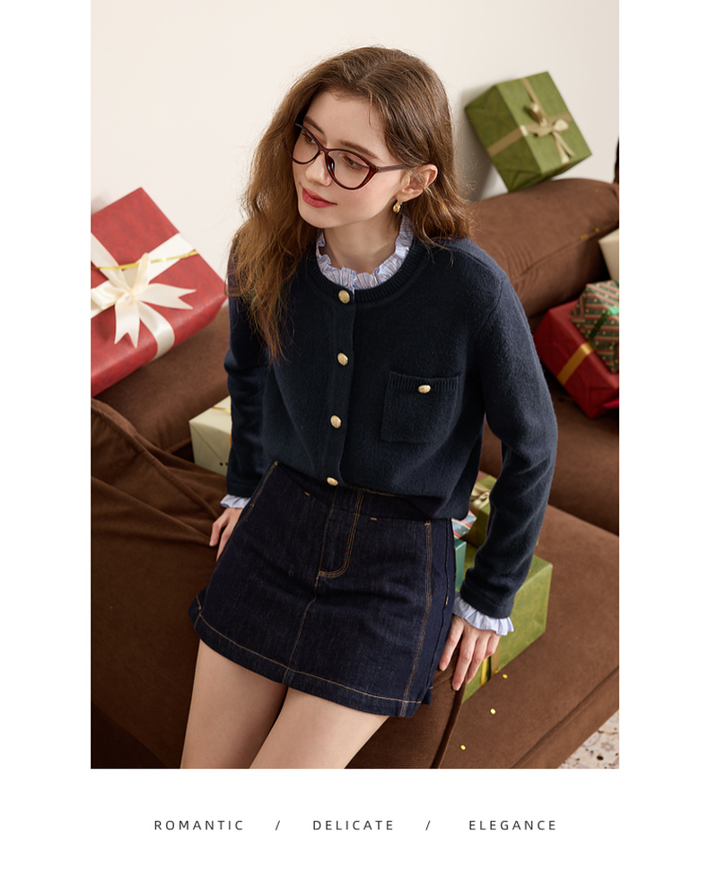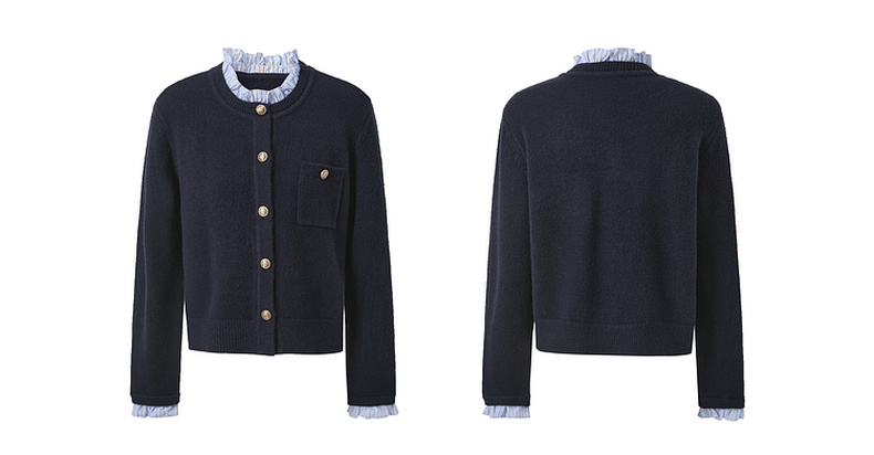 三彩2025冬季新款女假两件针织衫木耳边拼接毛衣开衫甜美减龄M