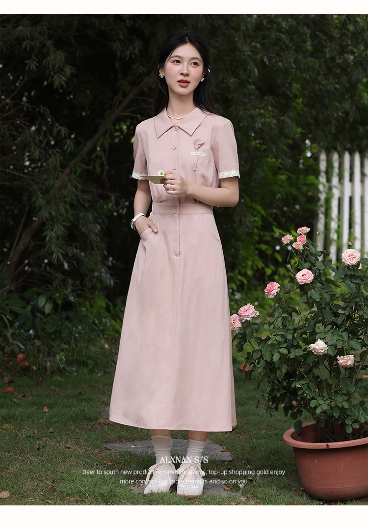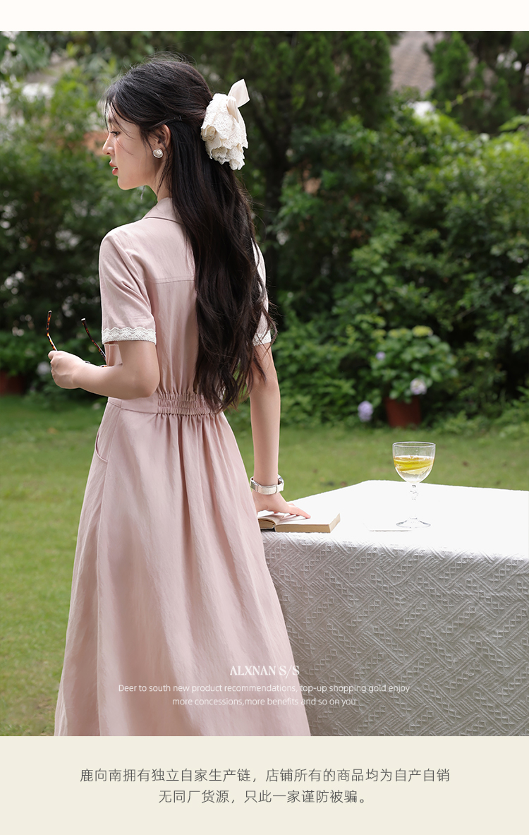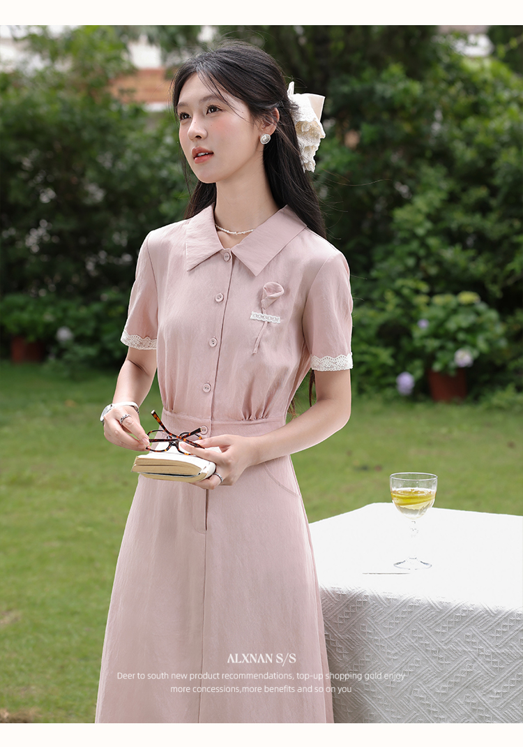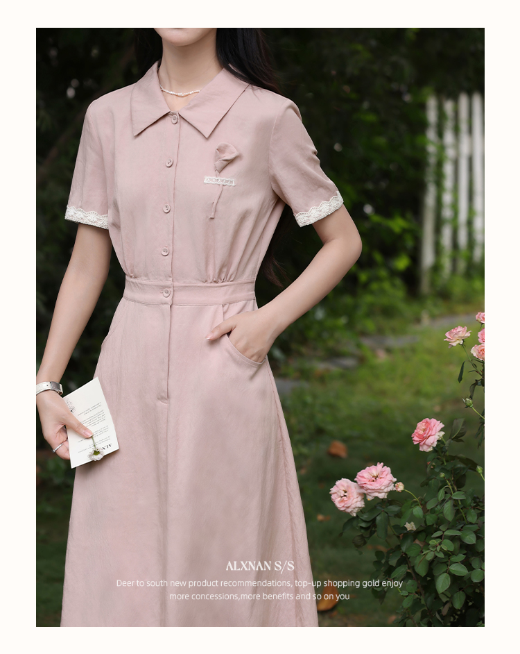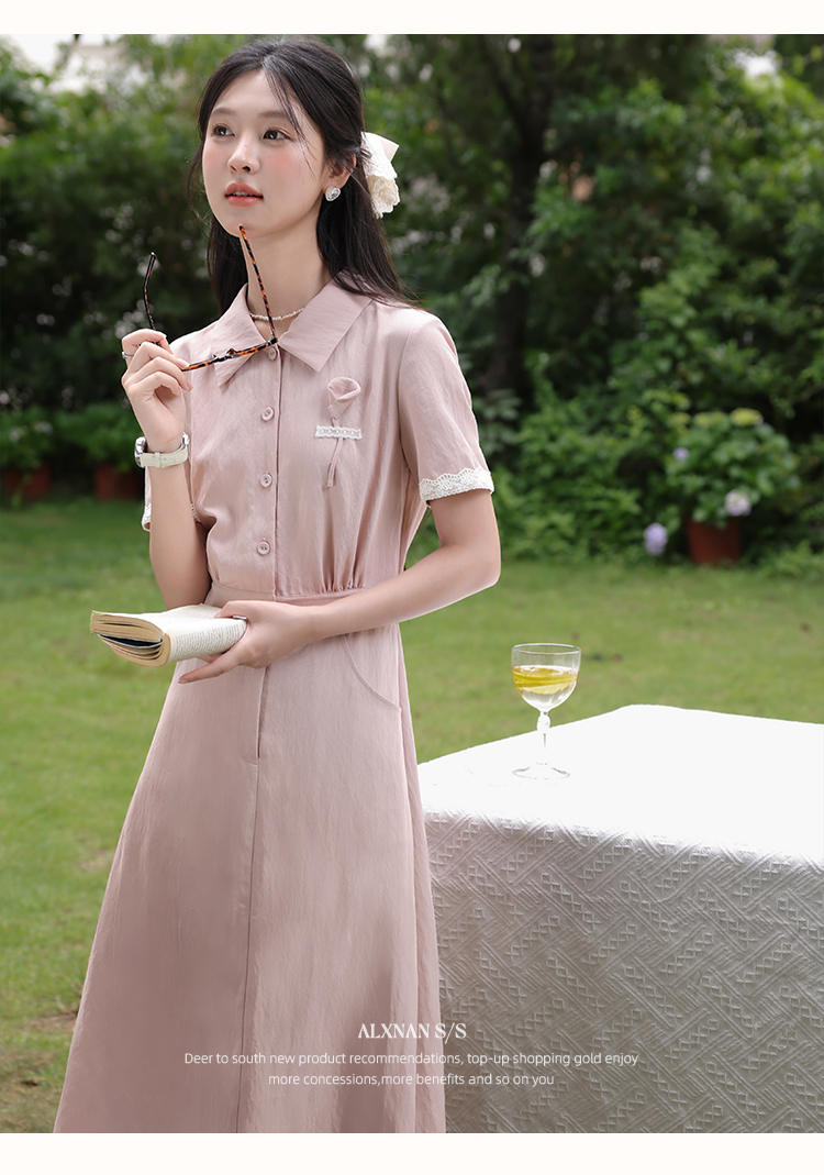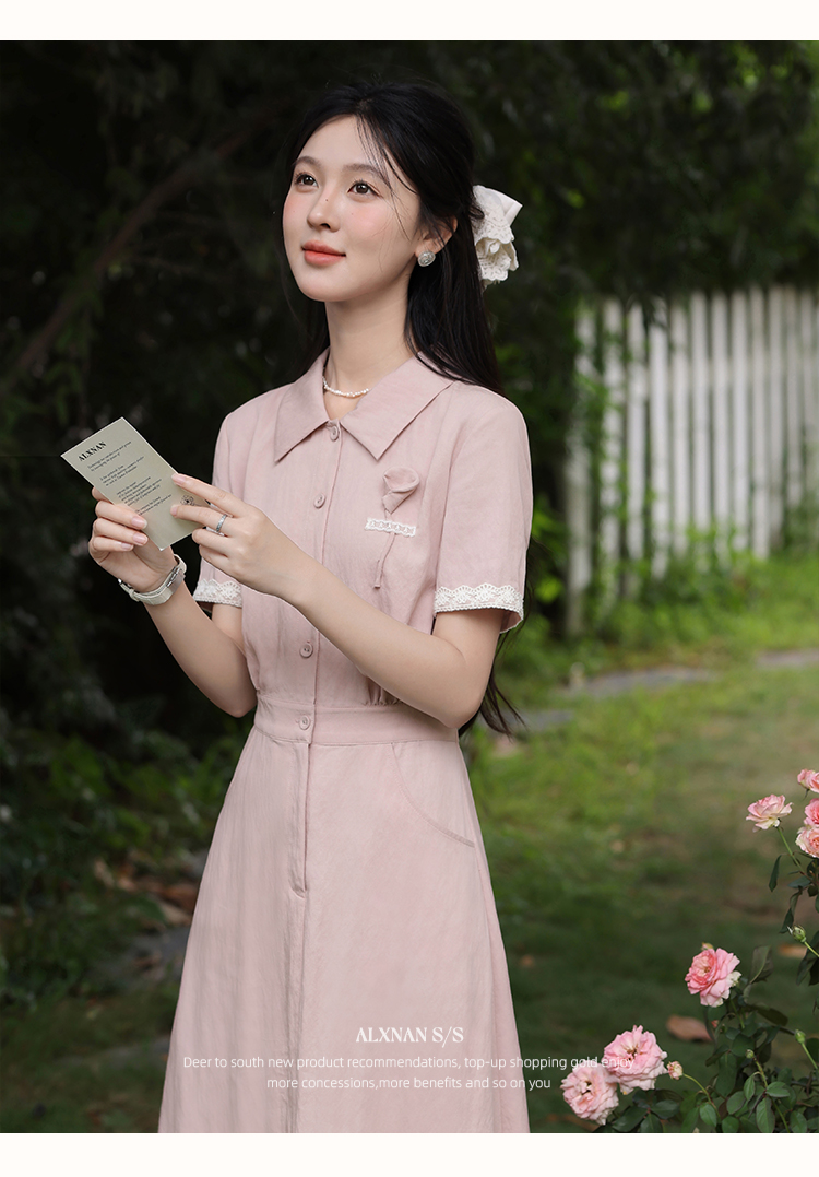 鹿向南「海棠花」法式气质翻领粉色短袖衬衫连衣裙女夏A字长裙子