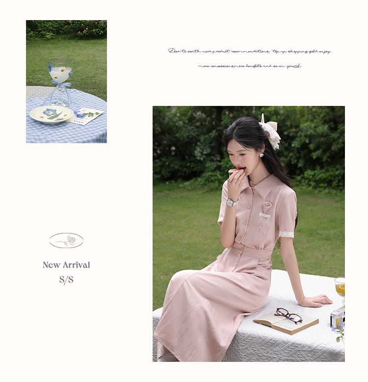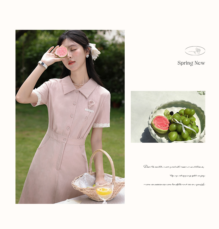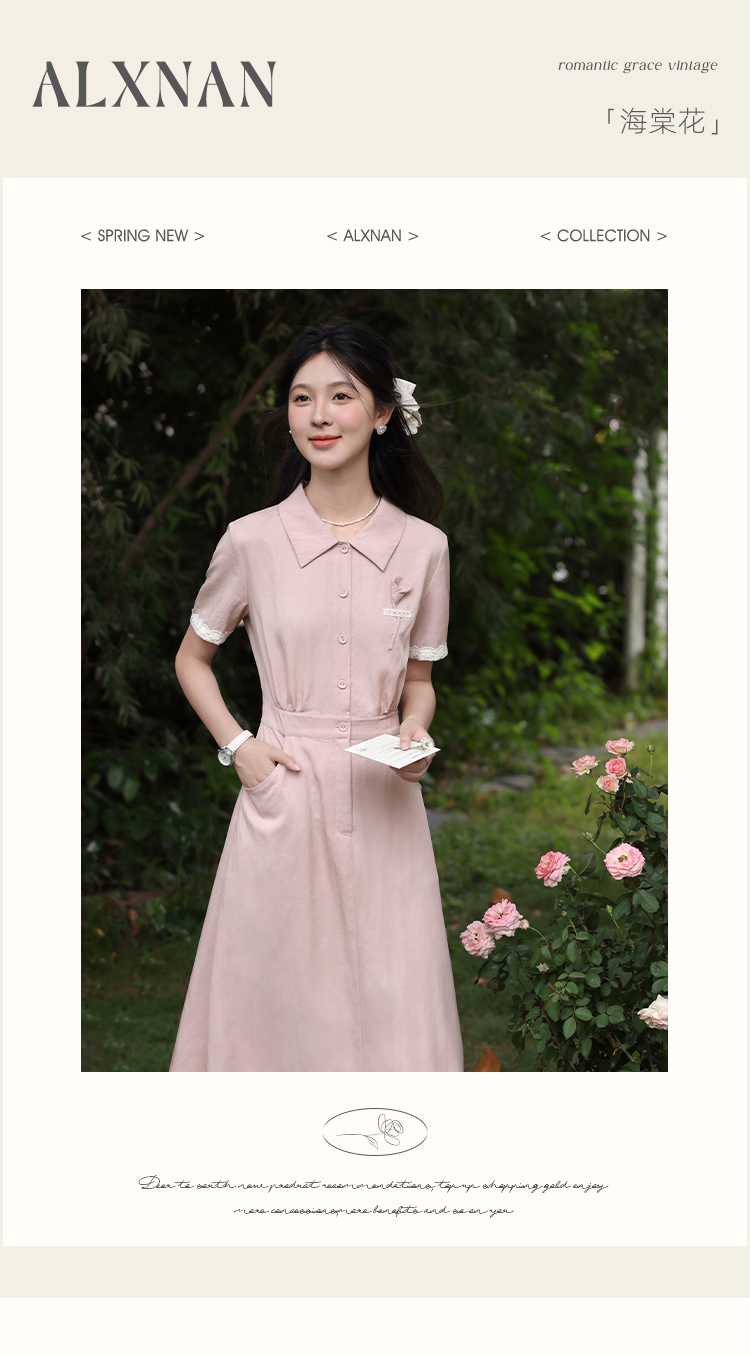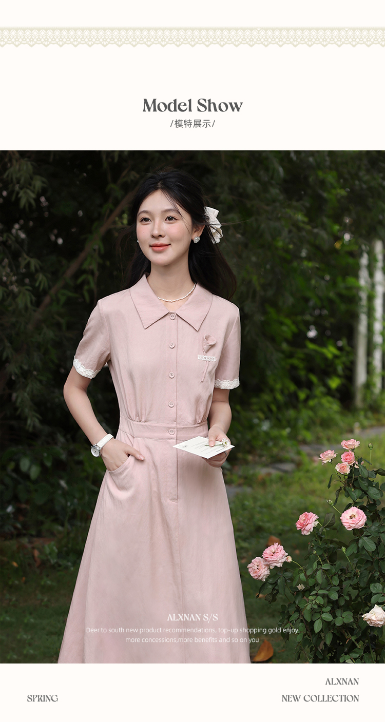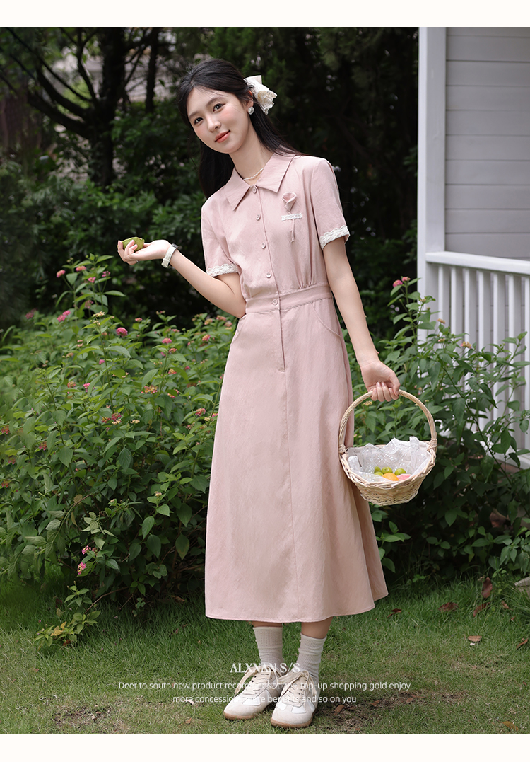鹿向南「海棠花」法式气质翻领粉色短袖衬衫连衣裙女夏A字长裙子