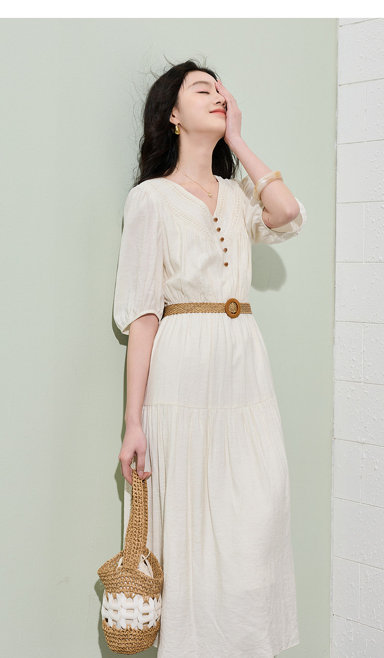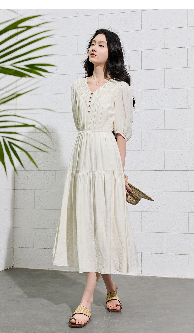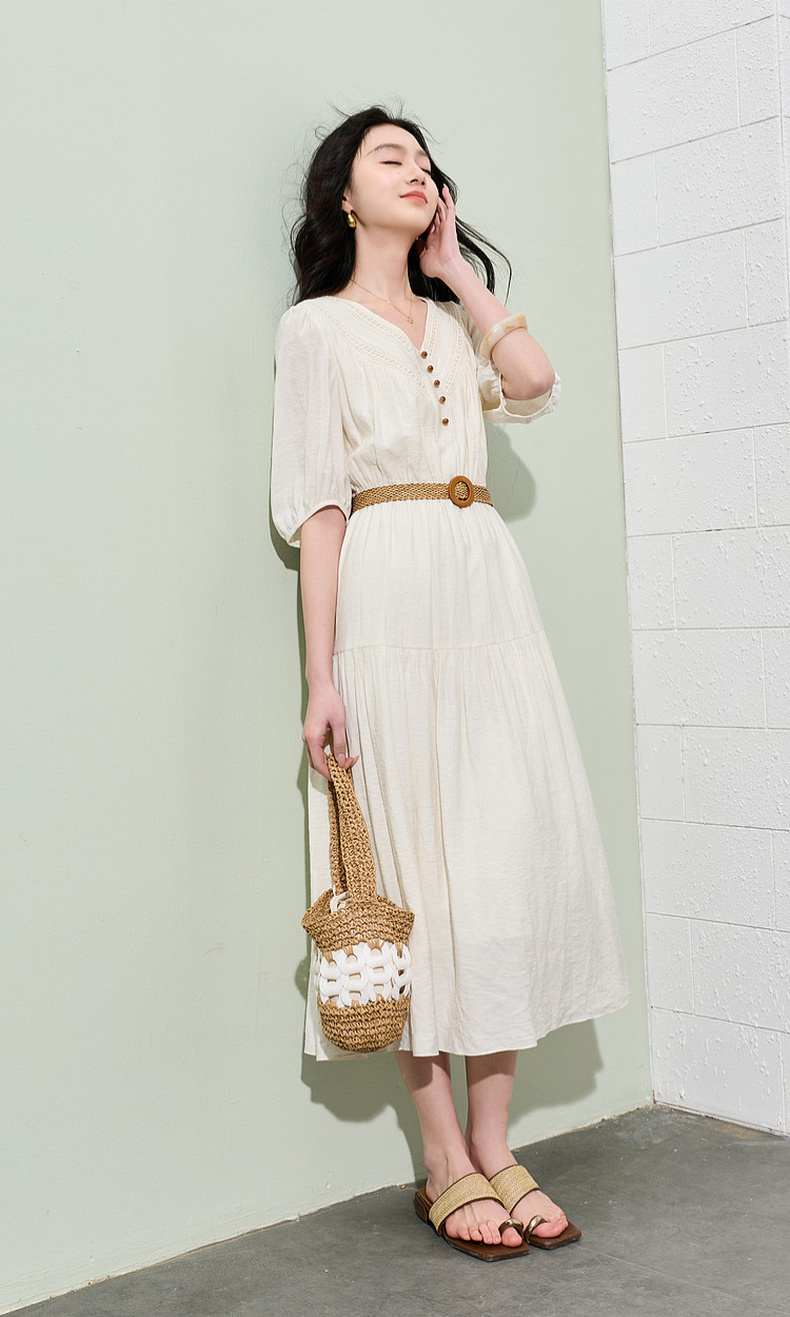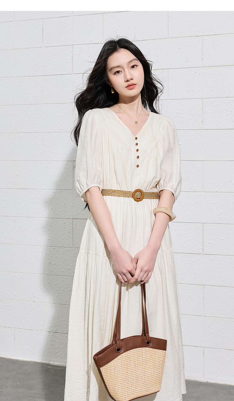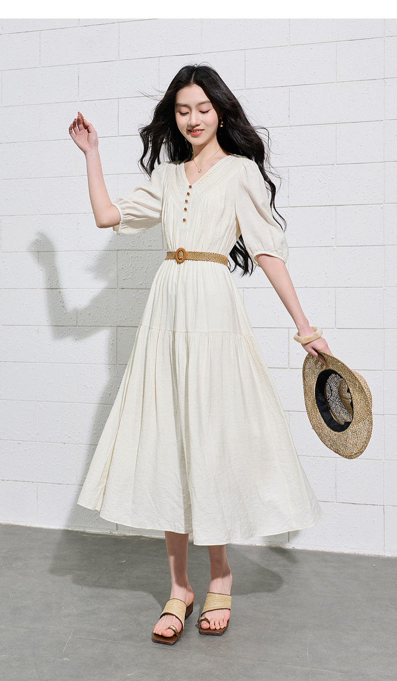 三彩2026夏季新款法式V领高腰中袖A字裙连衣裙大摆长裙简约S
