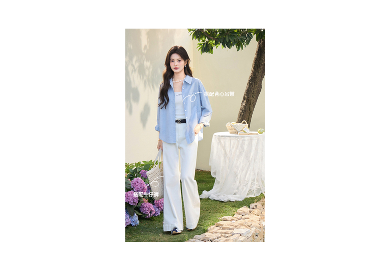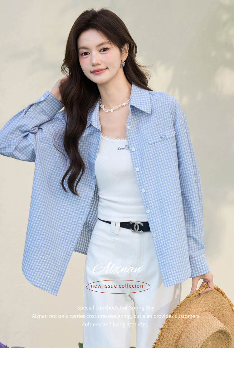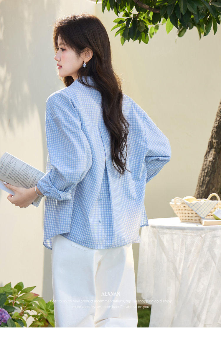鹿向南「蓝风信屿」蓝色格子翻领通勤休闲衬衫女春季叠穿长袖上衣