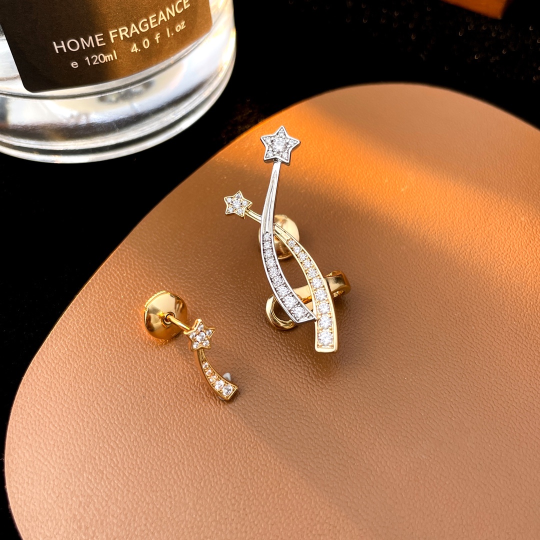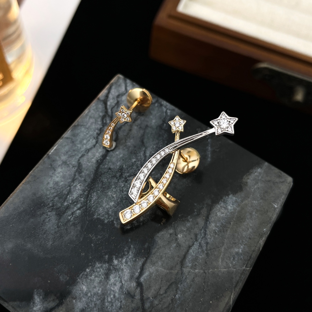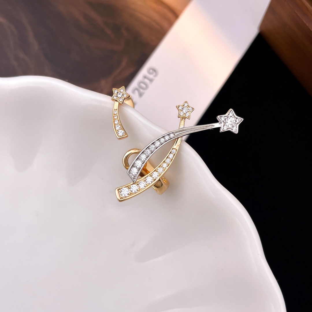 两颗不同颜色的五角星各自带出璀璨的光芒,金色与白金完美结合,寓意抓住机遇,把握机遇。上身优雅有女人味~ Zp定制,采用双色电镀方式,背面镂空,钻石更大程度绽放光芒,纯手镶,不掉石,更璀璨~