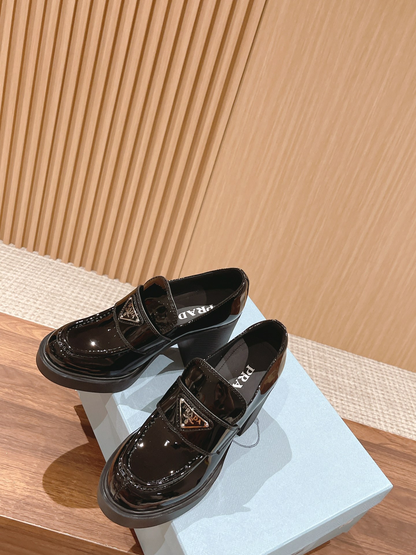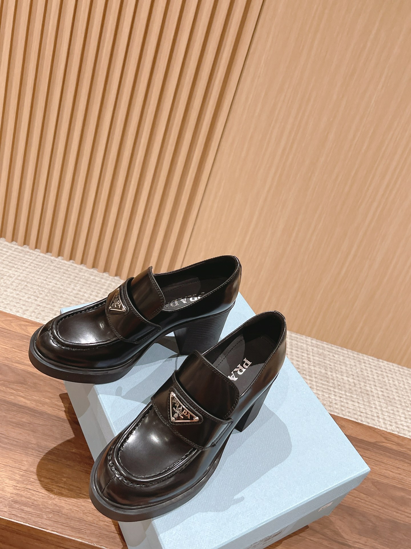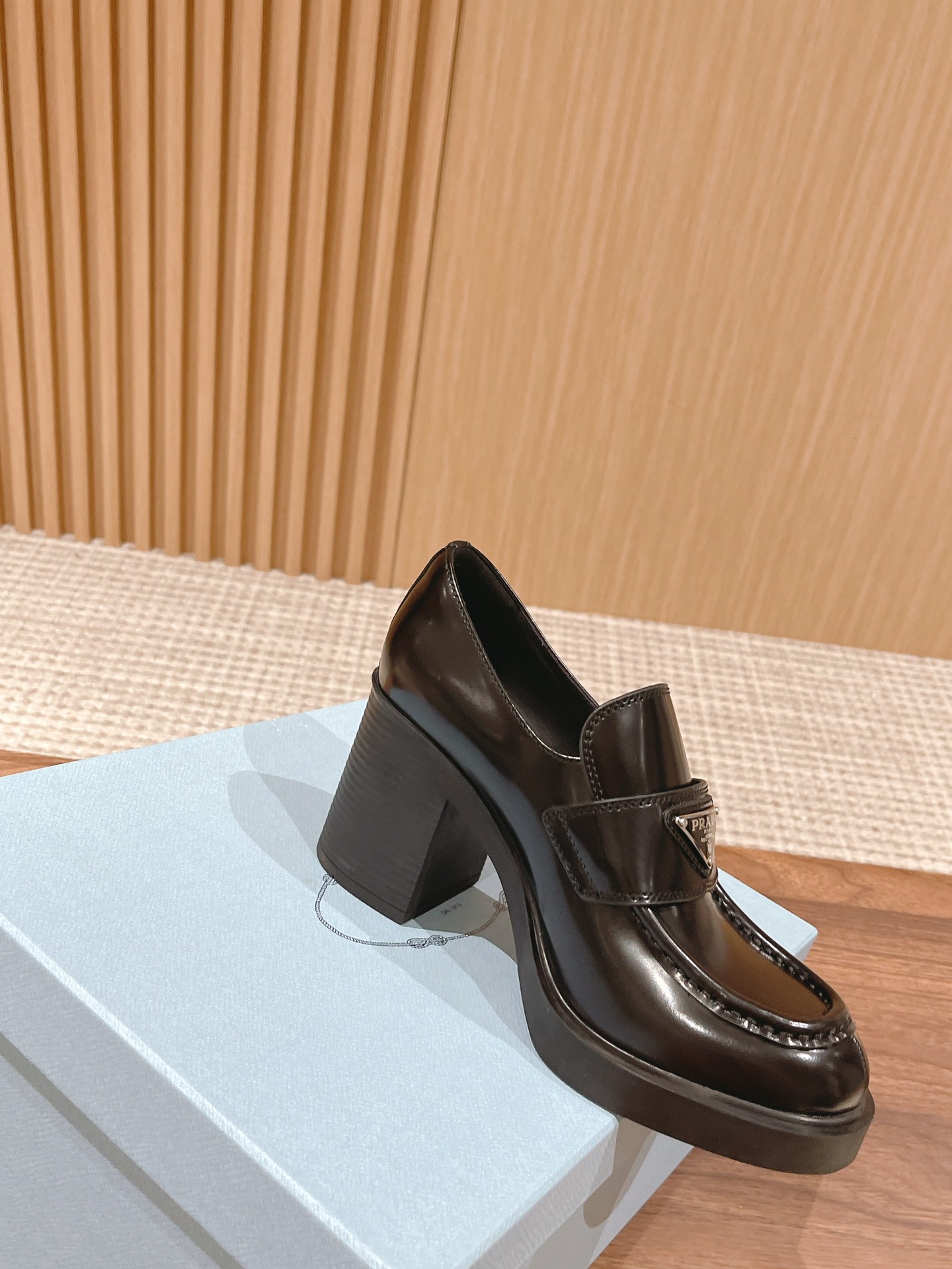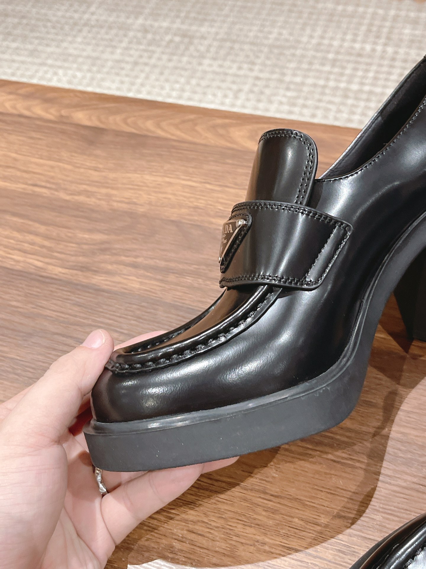 PRADA 普拉达高跟乐福鞋新品 经典三角标乐福鞋,做高跟版本,也着有被惊艳到呀 宽大的鞋型搭配粗高跟造型,很协调哦,并没有半 点笨拙的意思,而且一体成型的鞋底,有运动鞋的舒适 度,穿上立马增高7.5cm