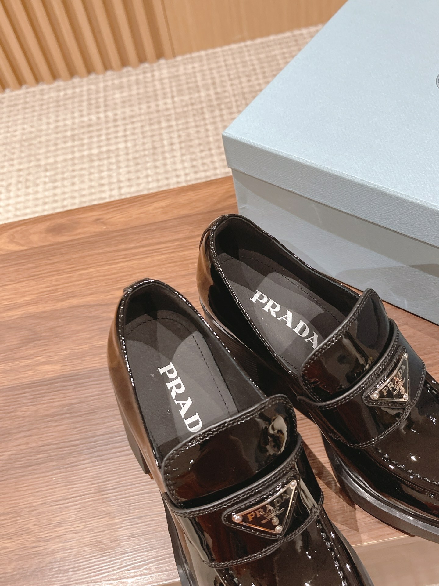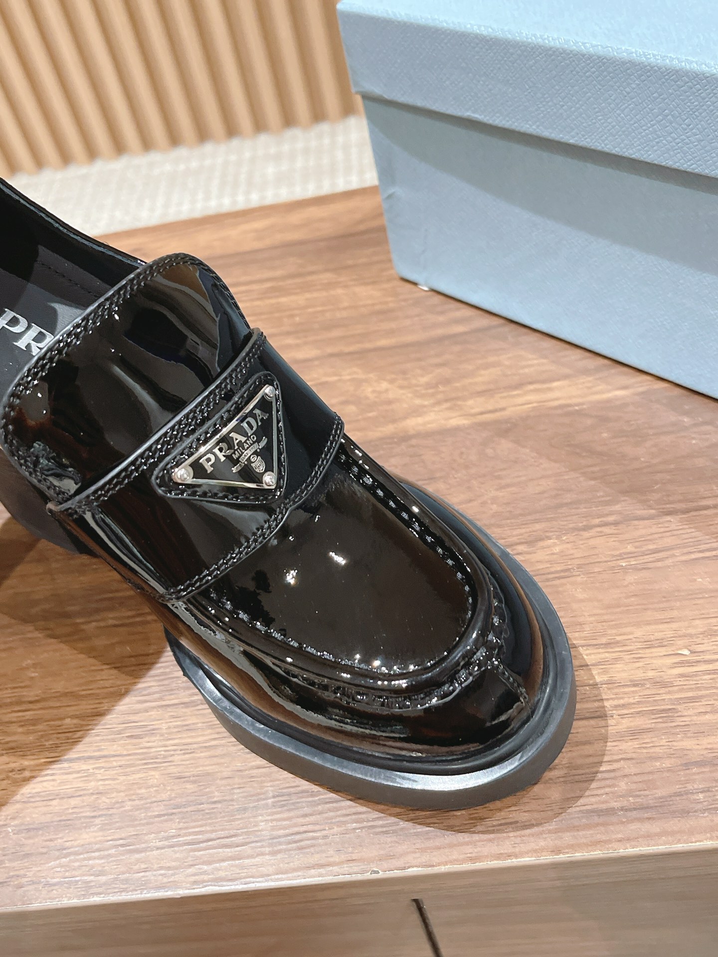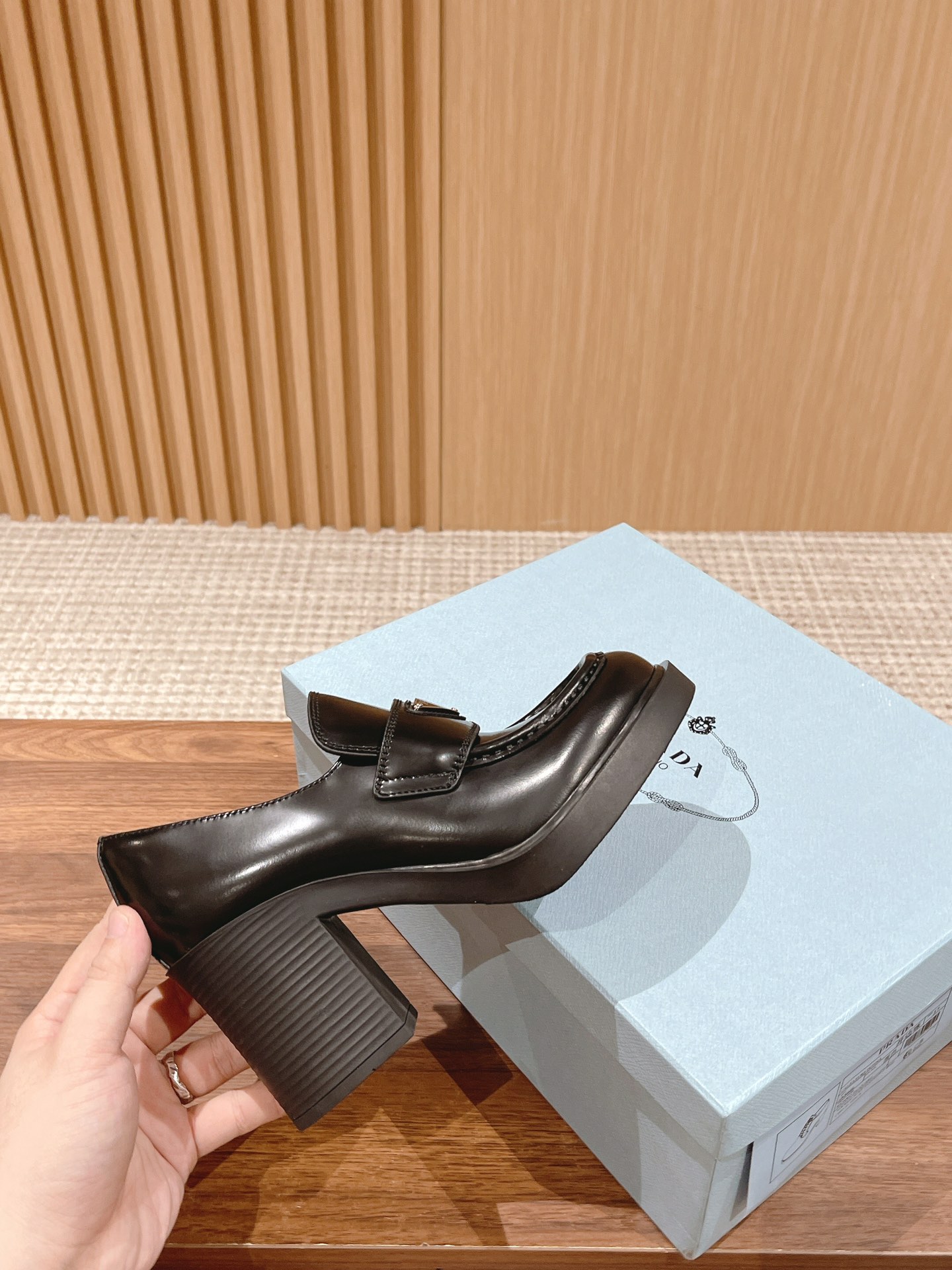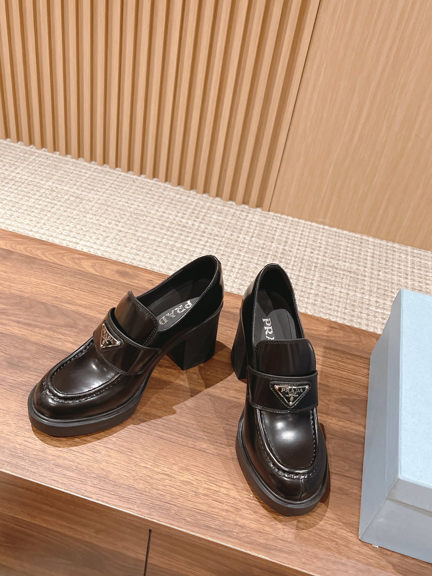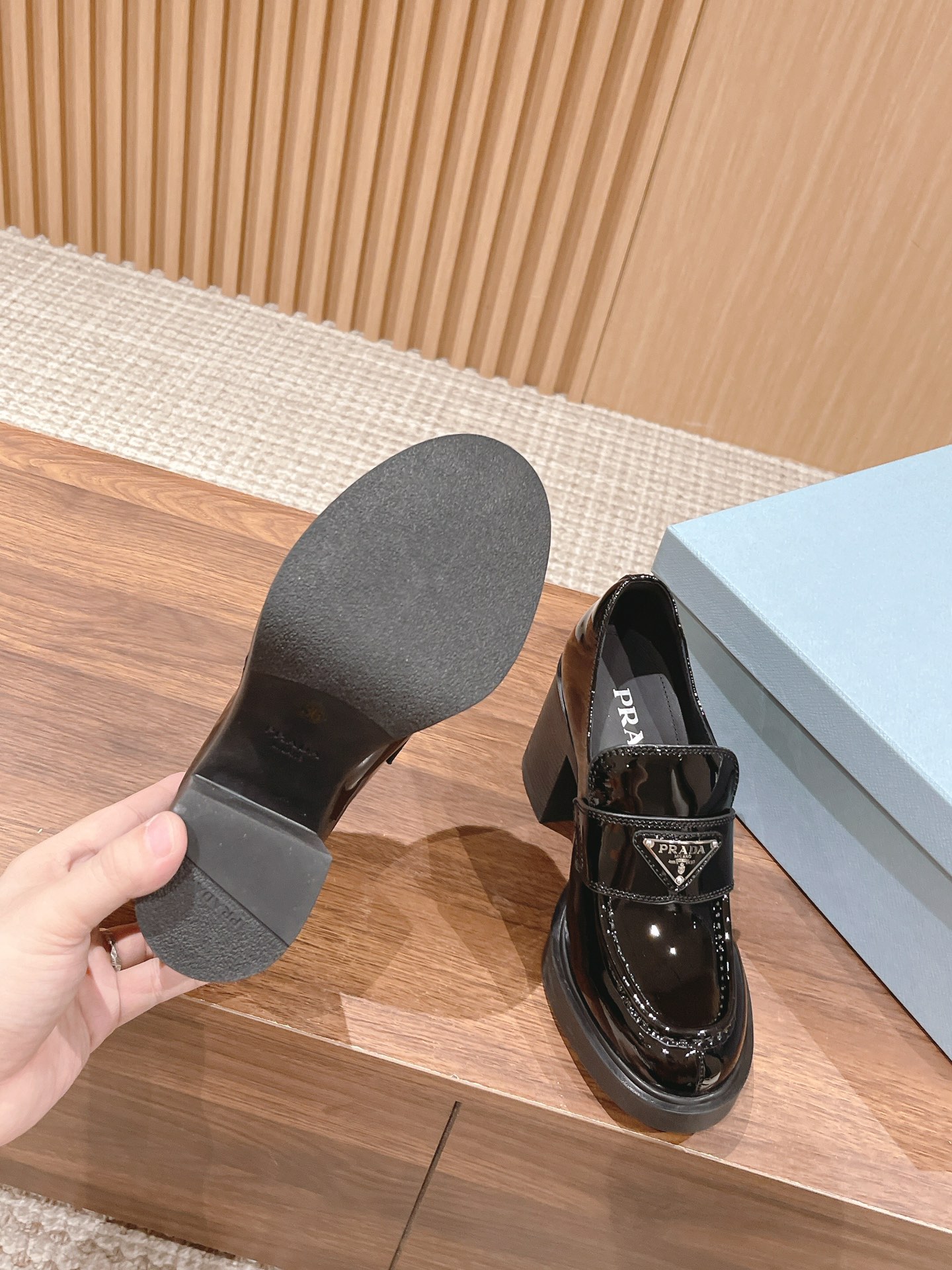 PRADA 普拉达高跟乐福鞋新品 经典三角标乐福鞋,做高跟版本,也着有被惊艳到呀 宽大的鞋型搭配粗高跟造型,很协调哦,并没有半 点笨拙的意思,而且一体成型的鞋底,有运动鞋的舒适 度,穿上立马增高7.5cm