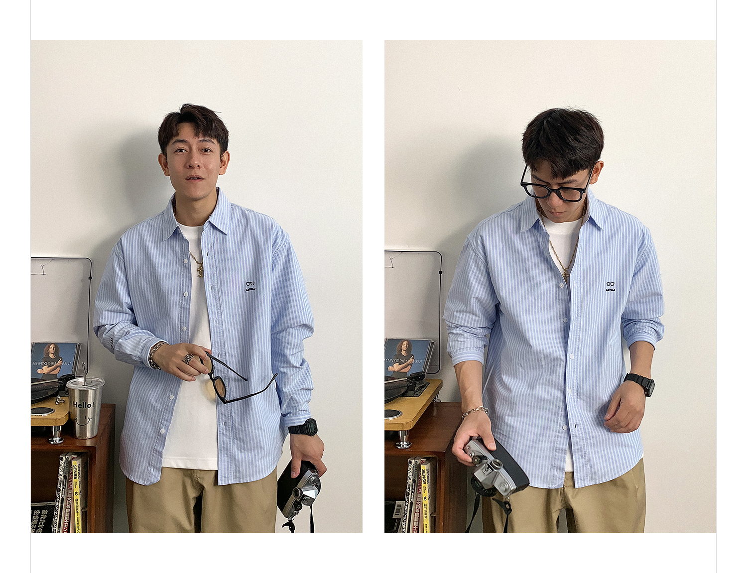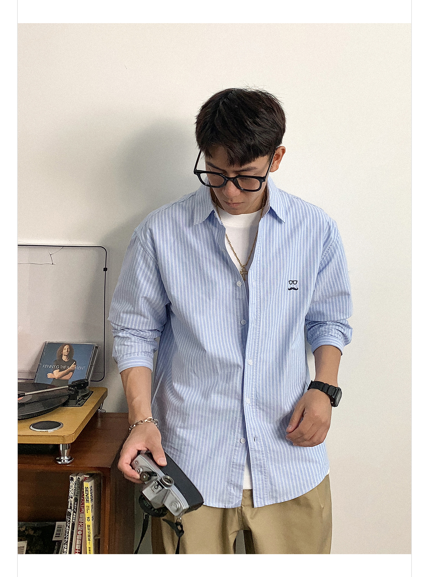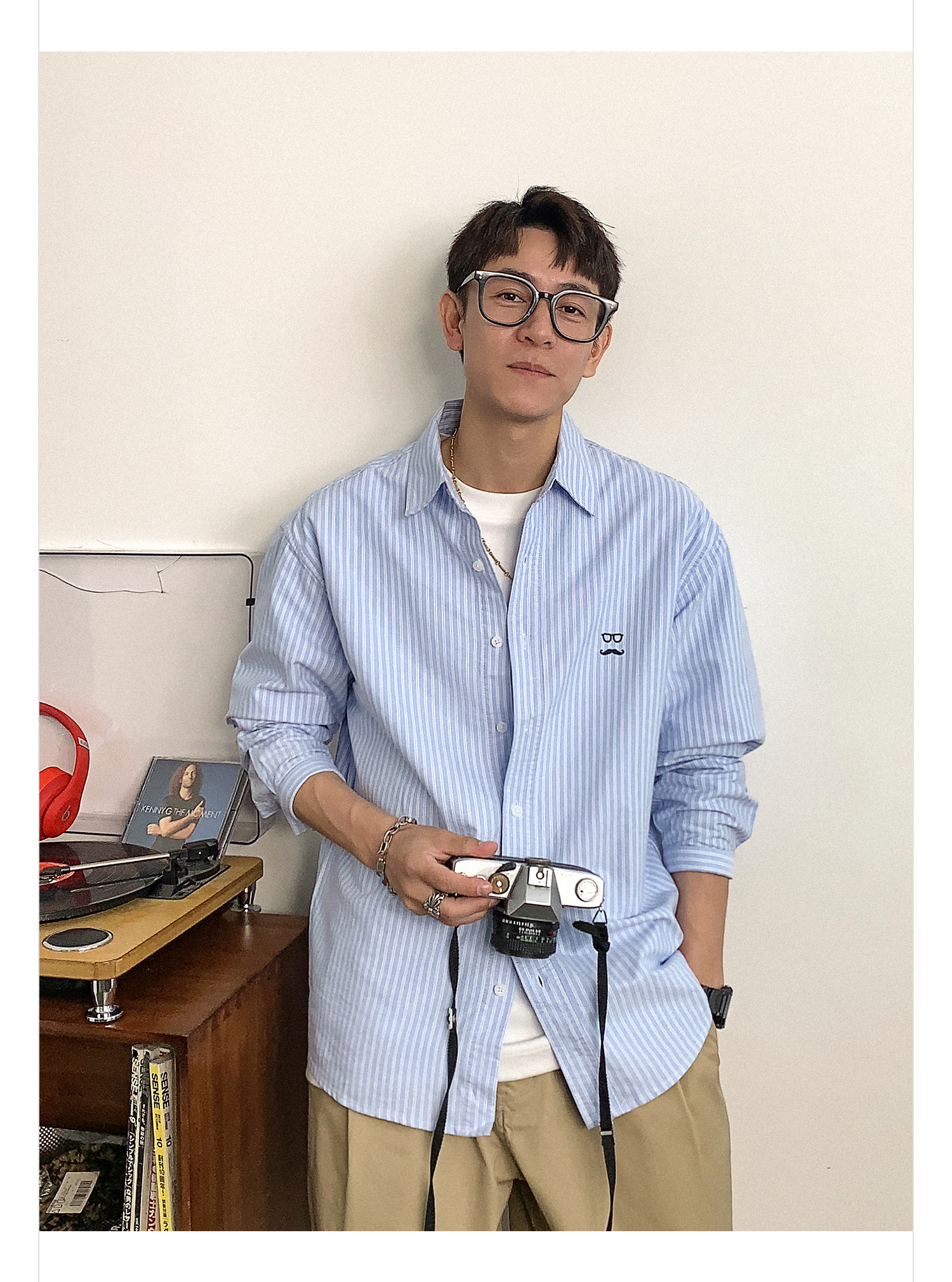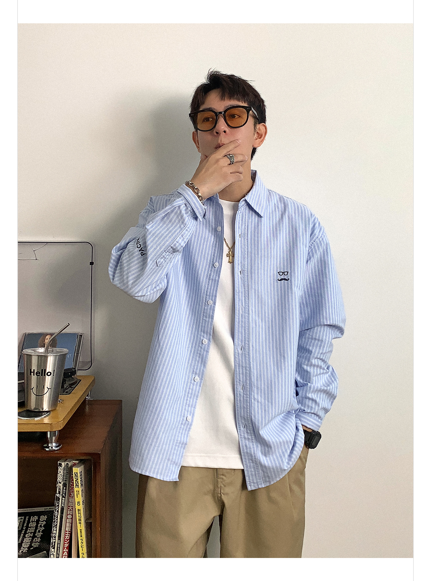 徐太浪蓝色修身条纹长袖衬衫男春秋新款潮牌男装宽松休闲衬衣外套