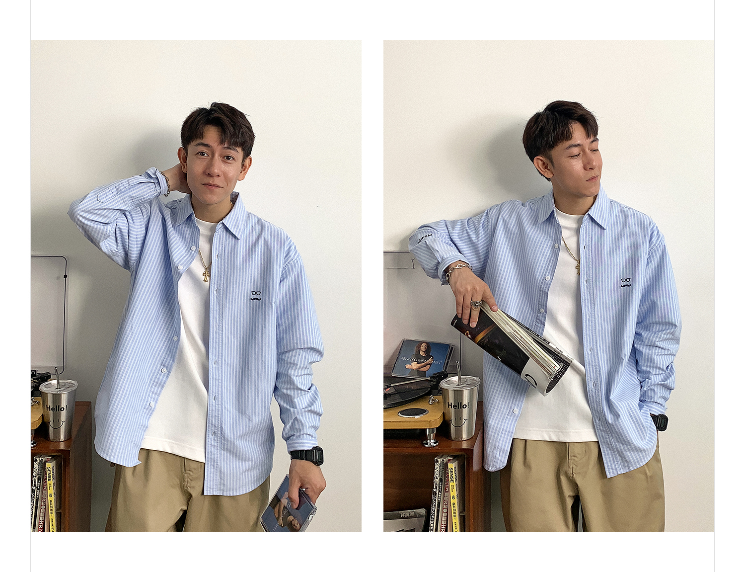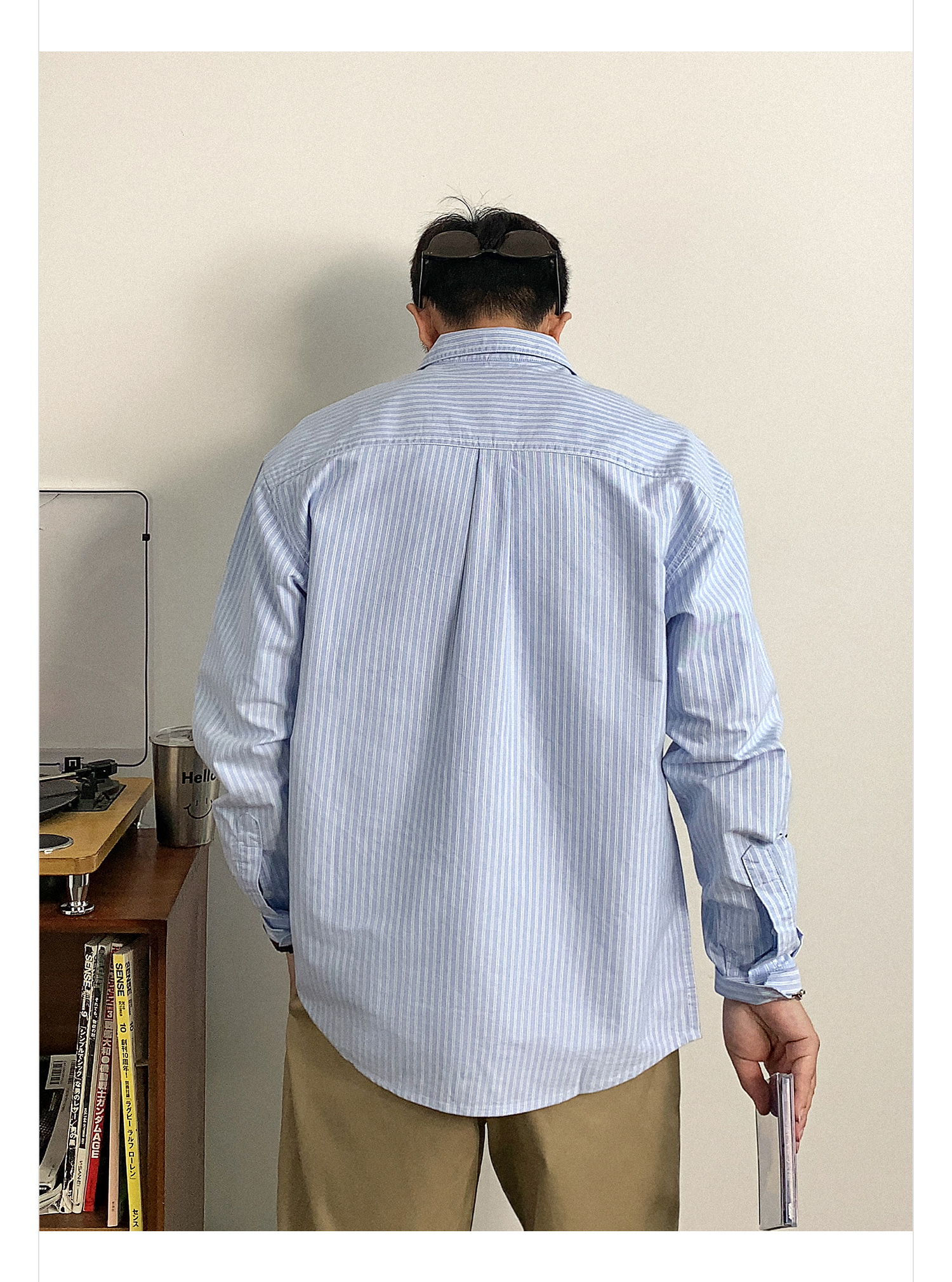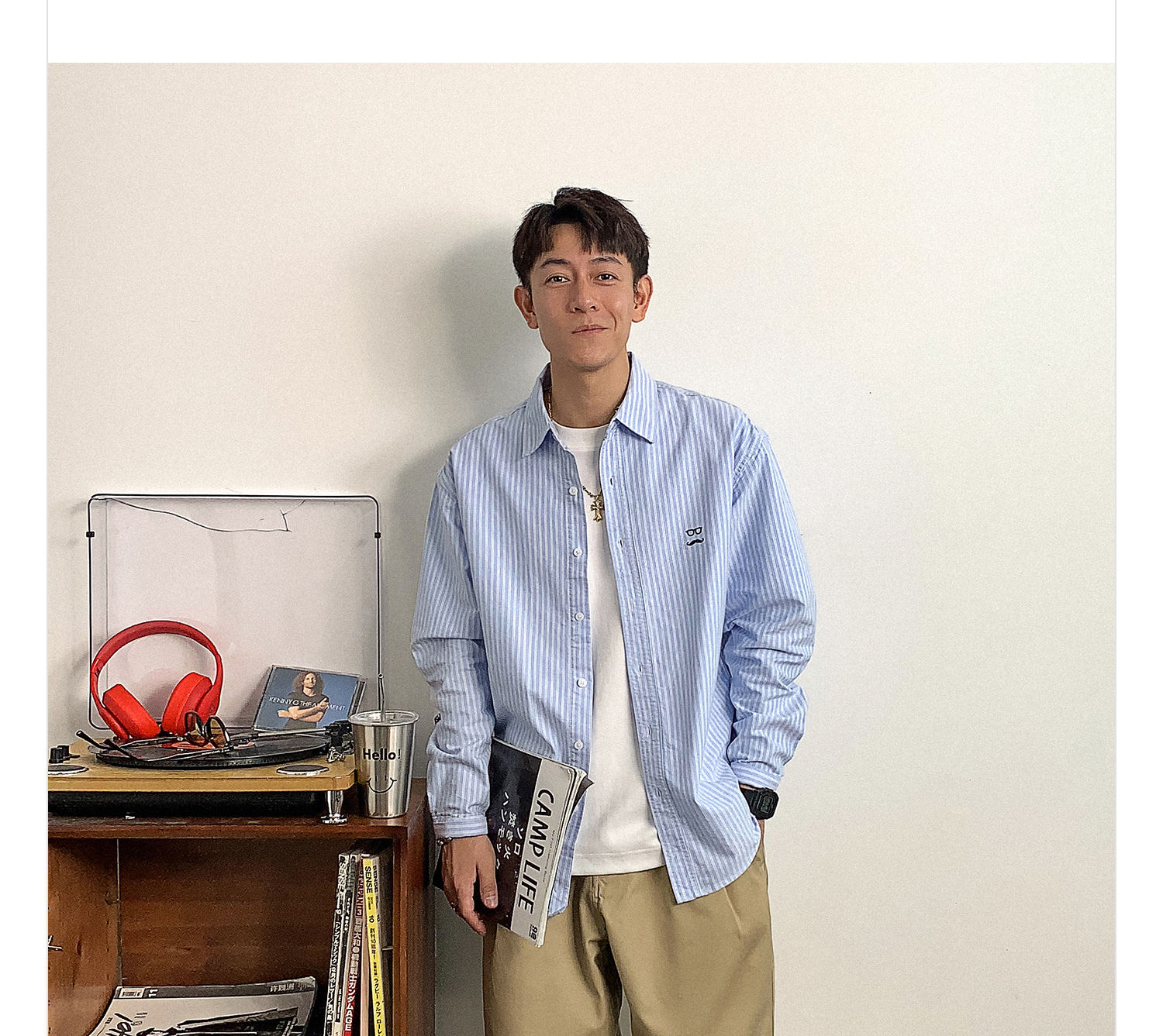 徐太浪蓝色修身条纹长袖衬衫男春秋新款潮牌男装宽松休闲衬衣外套