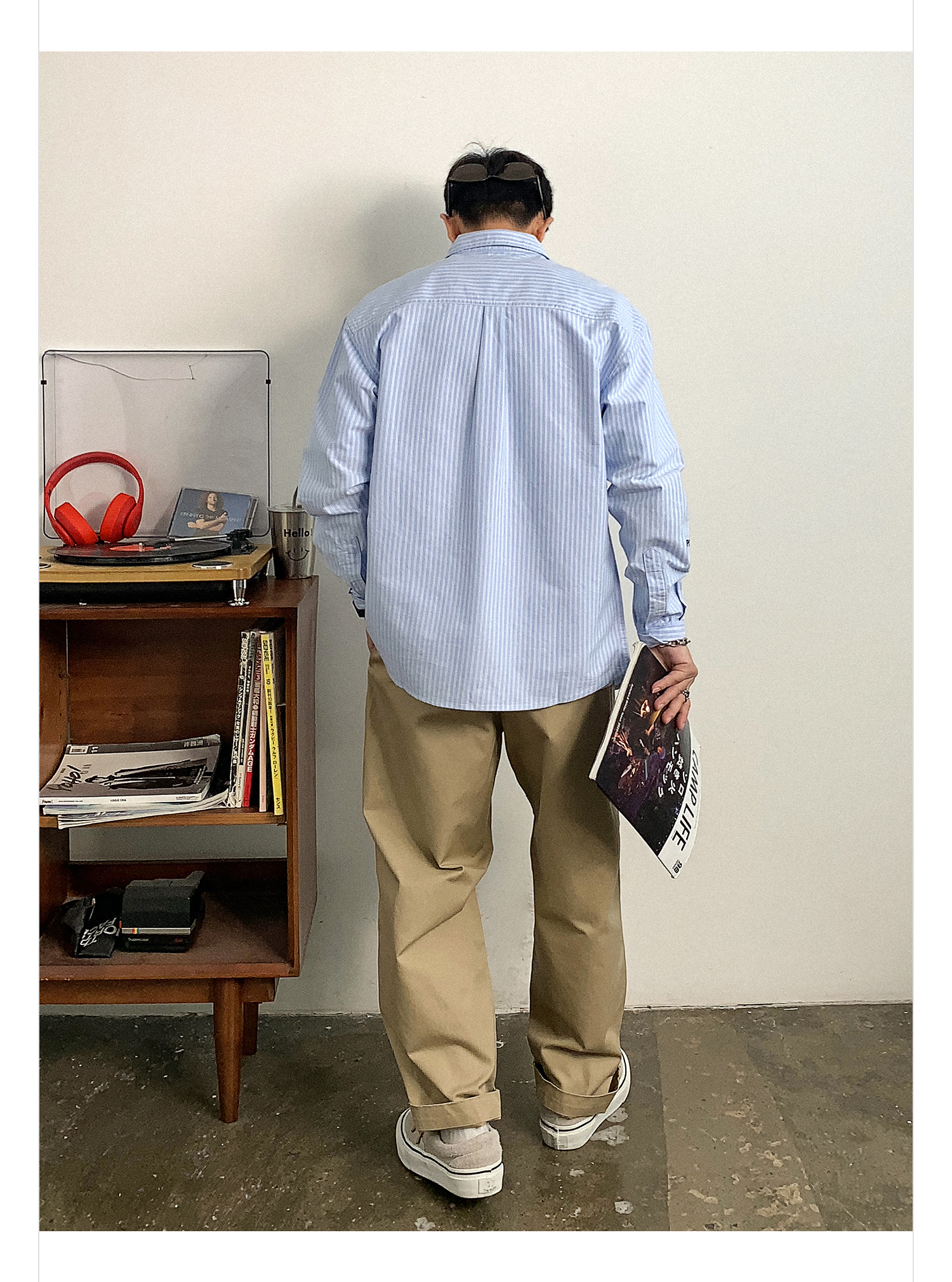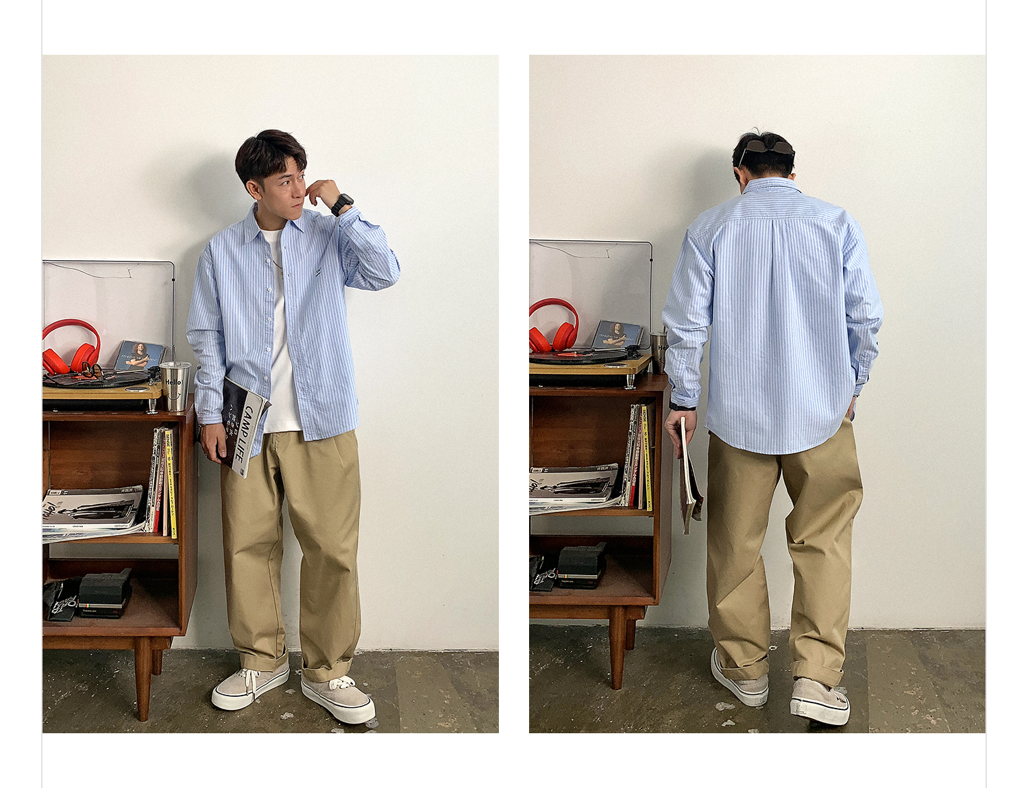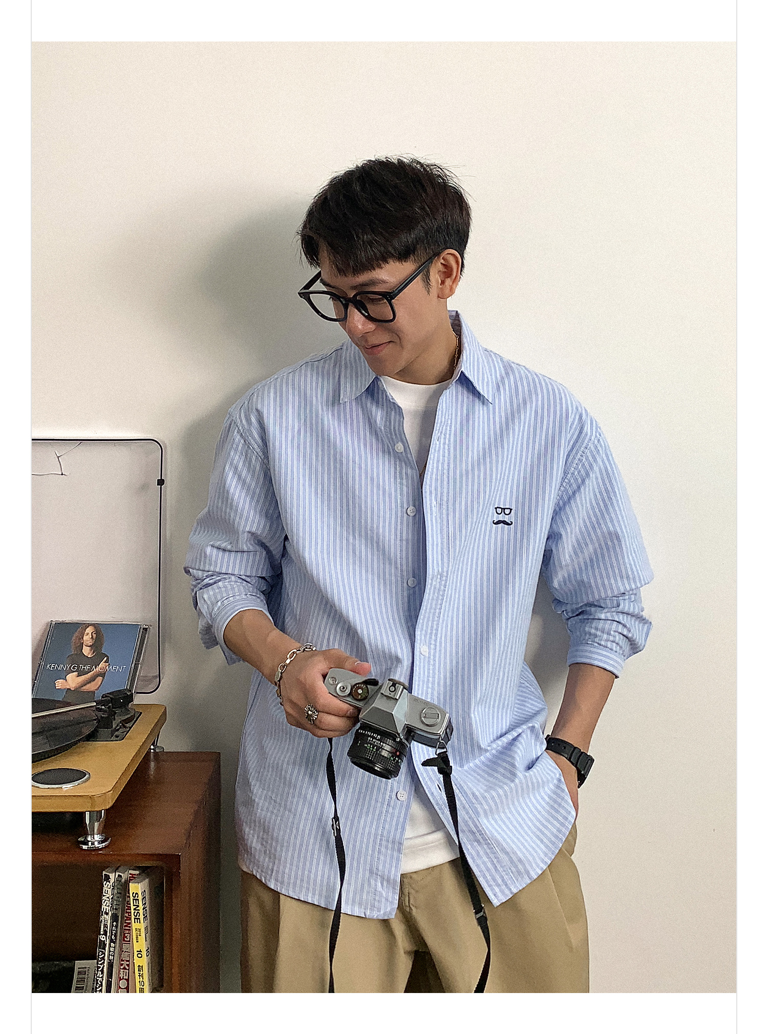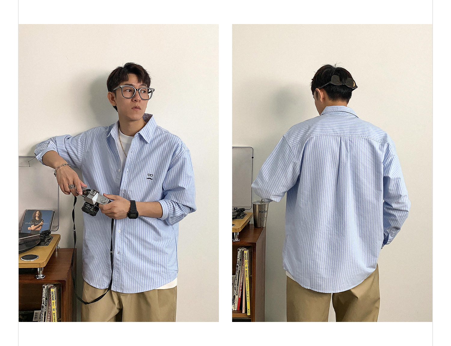 徐太浪蓝色修身条纹长袖衬衫男春秋新款潮牌男装宽松休闲衬衣外套