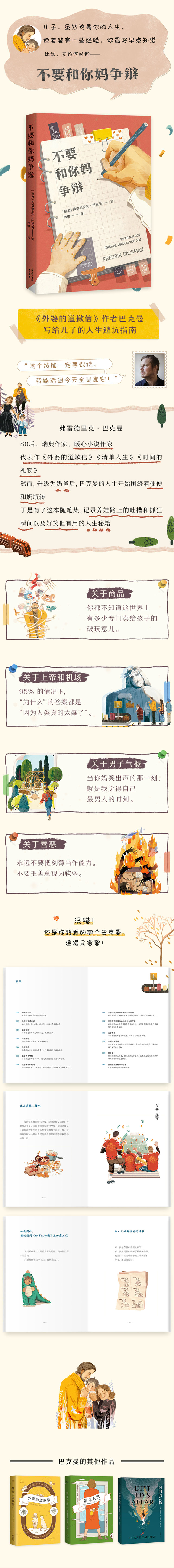 《不要和你妈争辩》是巴克曼的非虚构随笔集,记录了一个新手奶爸在育儿路上经历的种种抓狂瞬间,比如整天围着便便和奶瓶打转;追在孩子后面收拾一地鸡毛;牺牲个人时间甚至睡眠;同时还要不断追赶现代社会对父母提出的苛刻要求。这些文章本是巴克曼写给自己的儿子,但字里行间展现出巴克曼特有的世界观和人生观,十分睿智也非常温暖。比如“女性值得拥有和男性同等的权利、自由和机遇”;“语言的分寸很重要”;“不要把刻薄当作能力,不要把善意视为软弱”。每一篇文章都流淌着亲切、幽默和满满的爱。