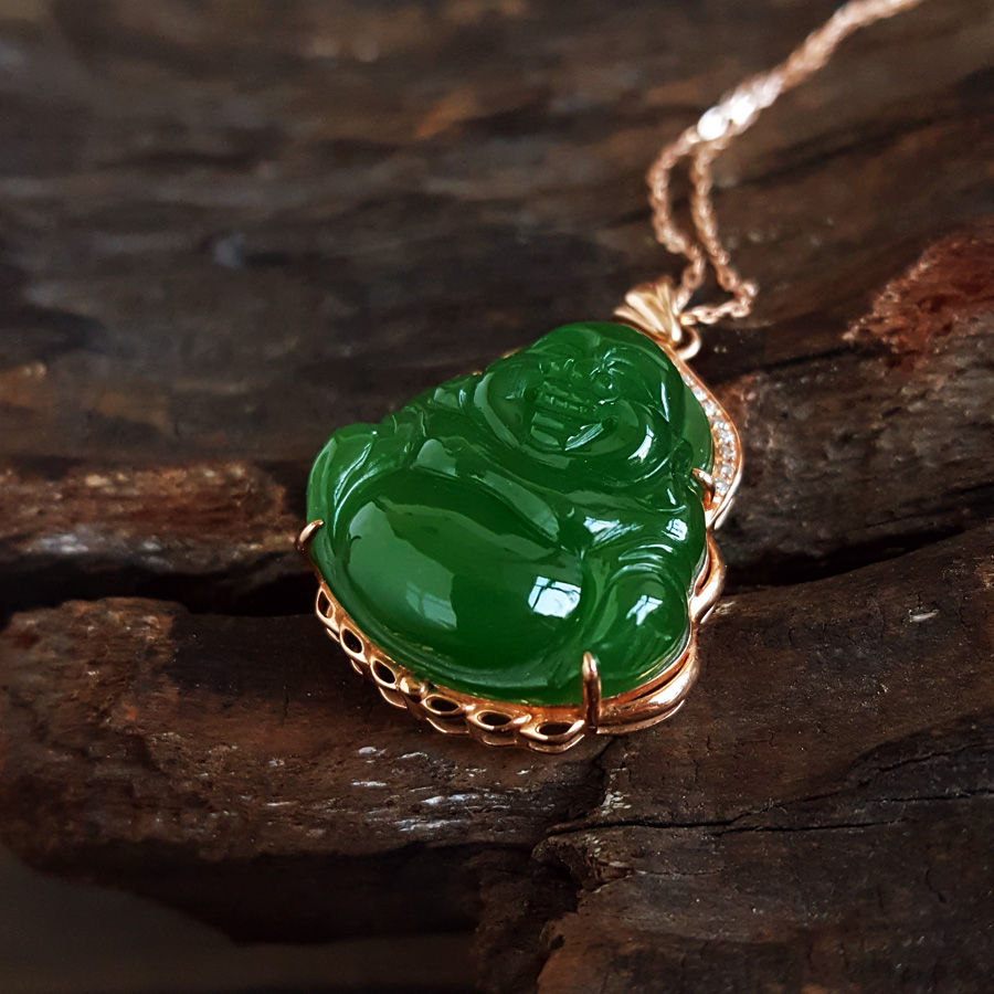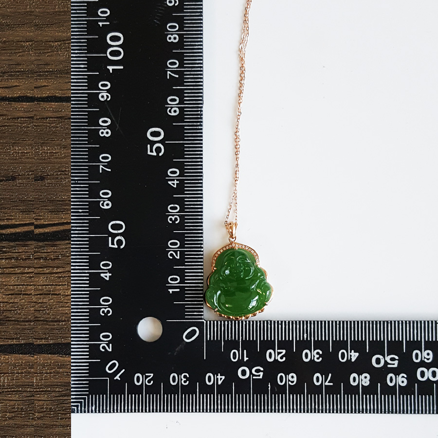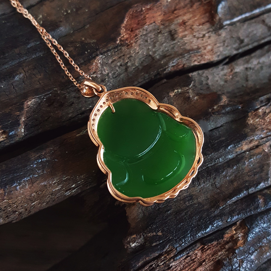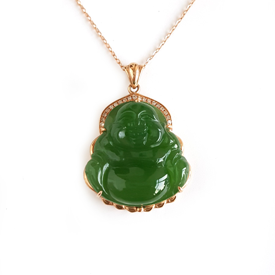名称 | AU750玫瑰金镶钻镶天然细腻菠菜绿无黑点佛公造型碧玉吊坠项链 |