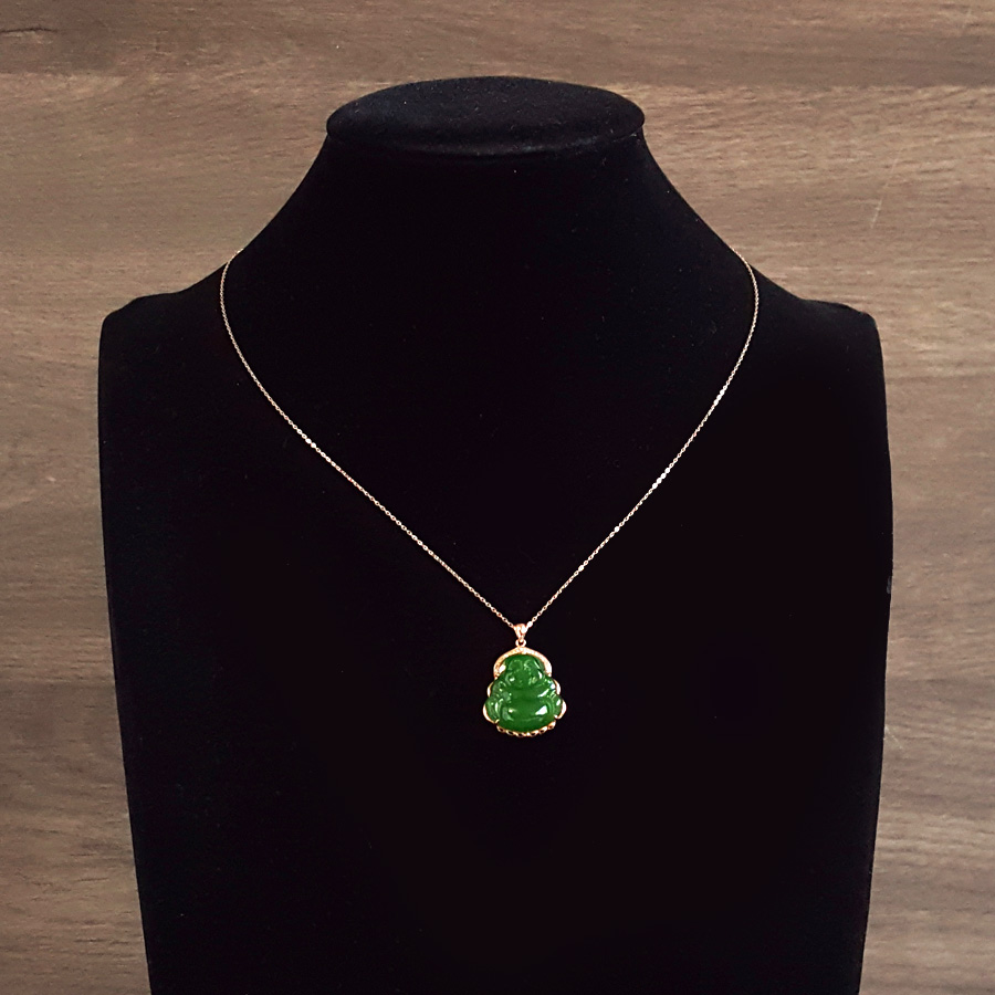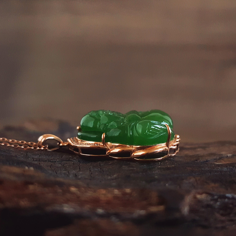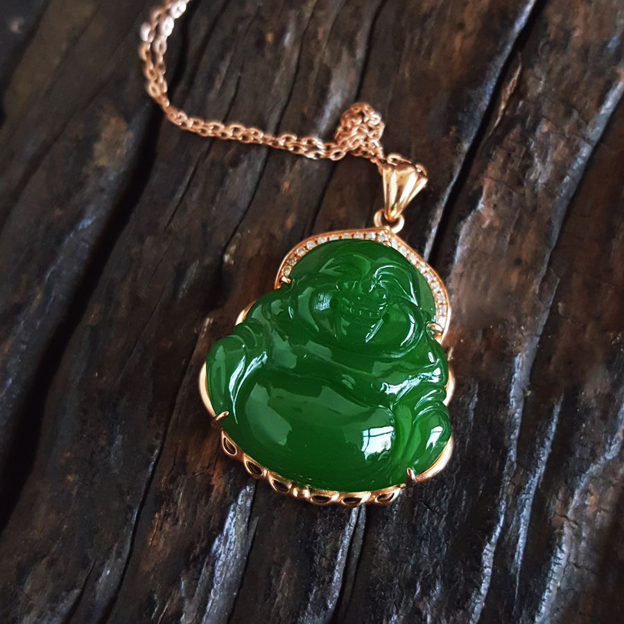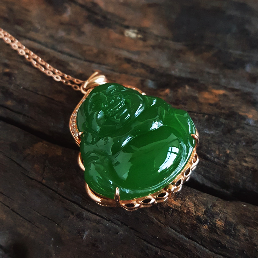 名称 | AU750玫瑰金镶钻镶天然细腻菠菜绿无黑点佛公造型碧玉吊坠项链 |