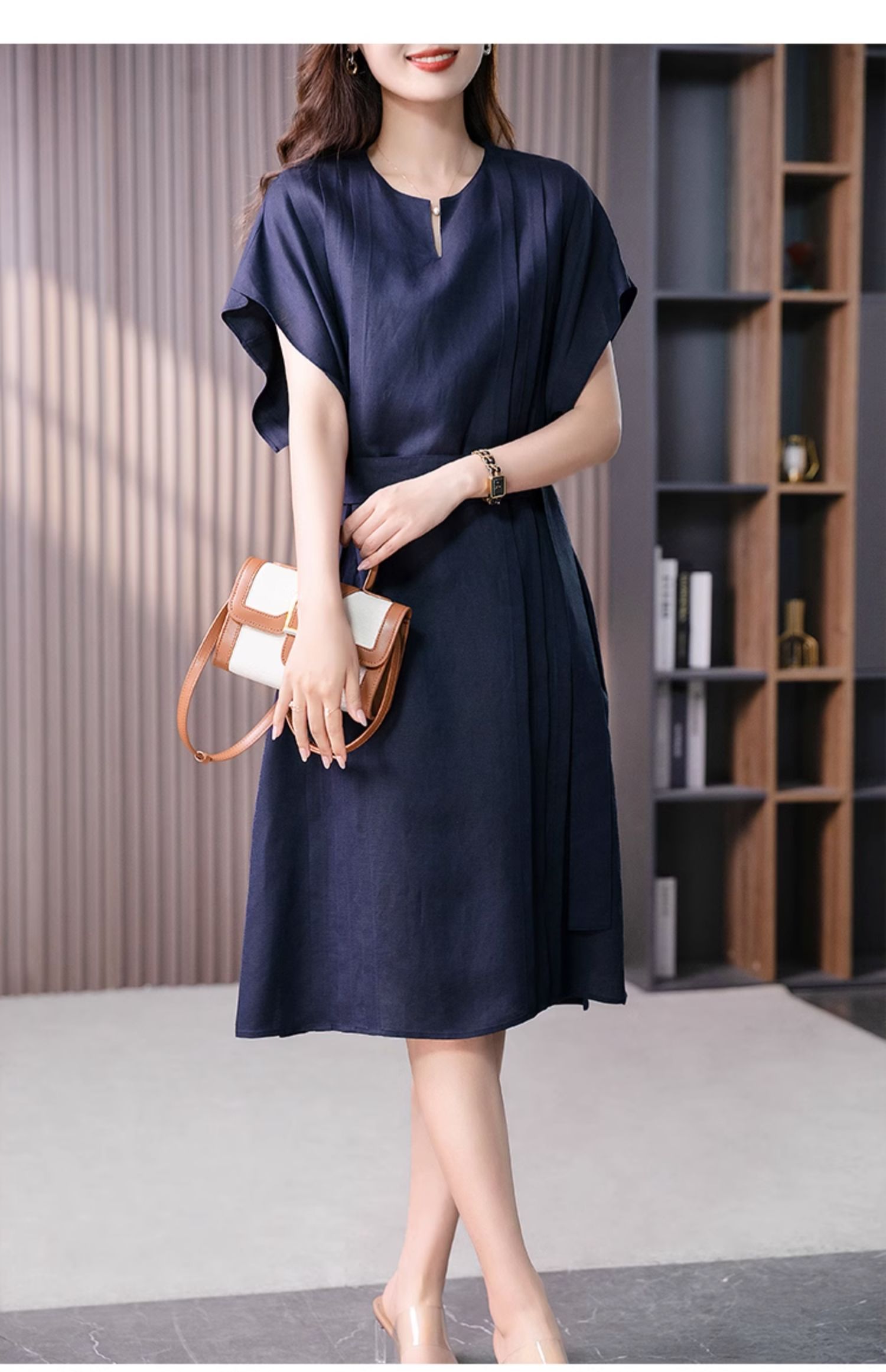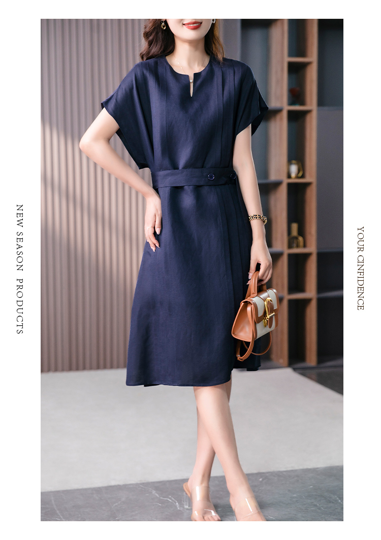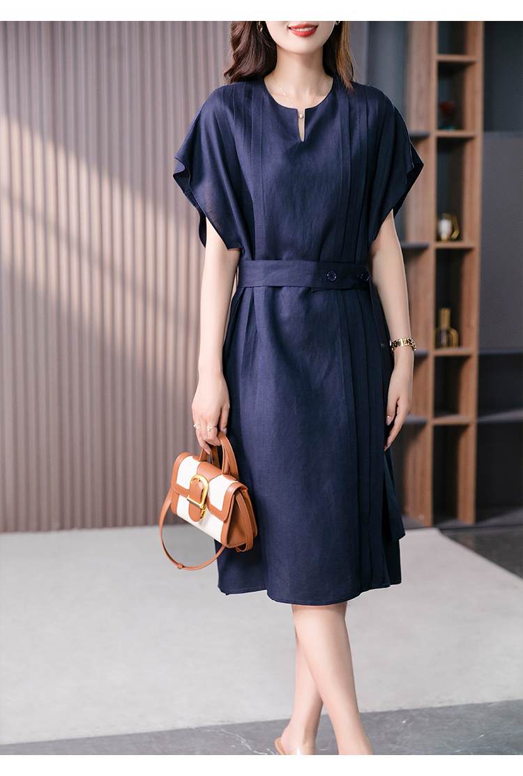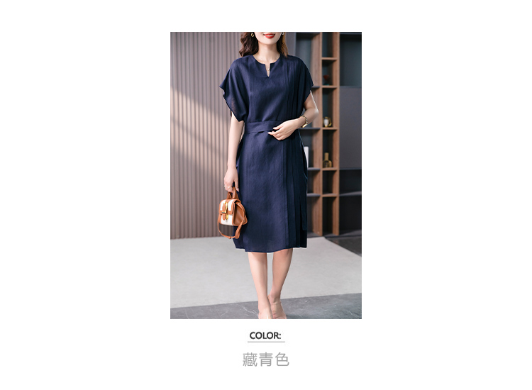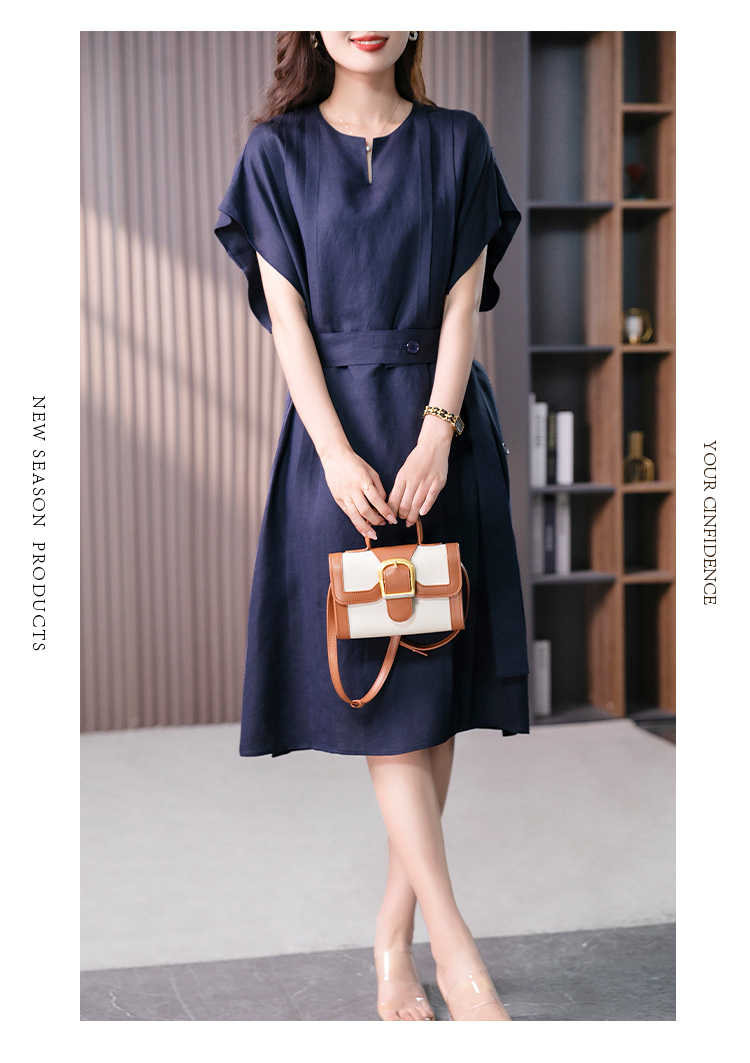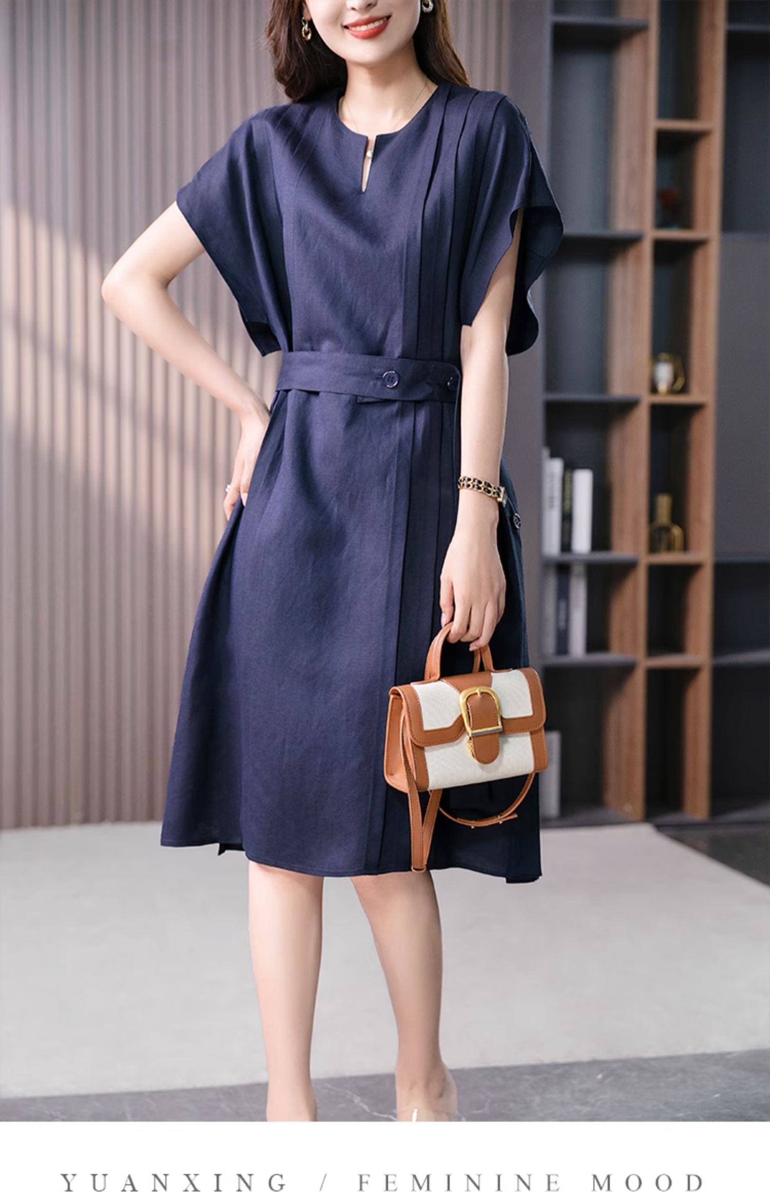 YX【定制17天】FSW气质收腰亚麻连衣裙女2023夏季新款设计感小众蝙蝠袖中长裙