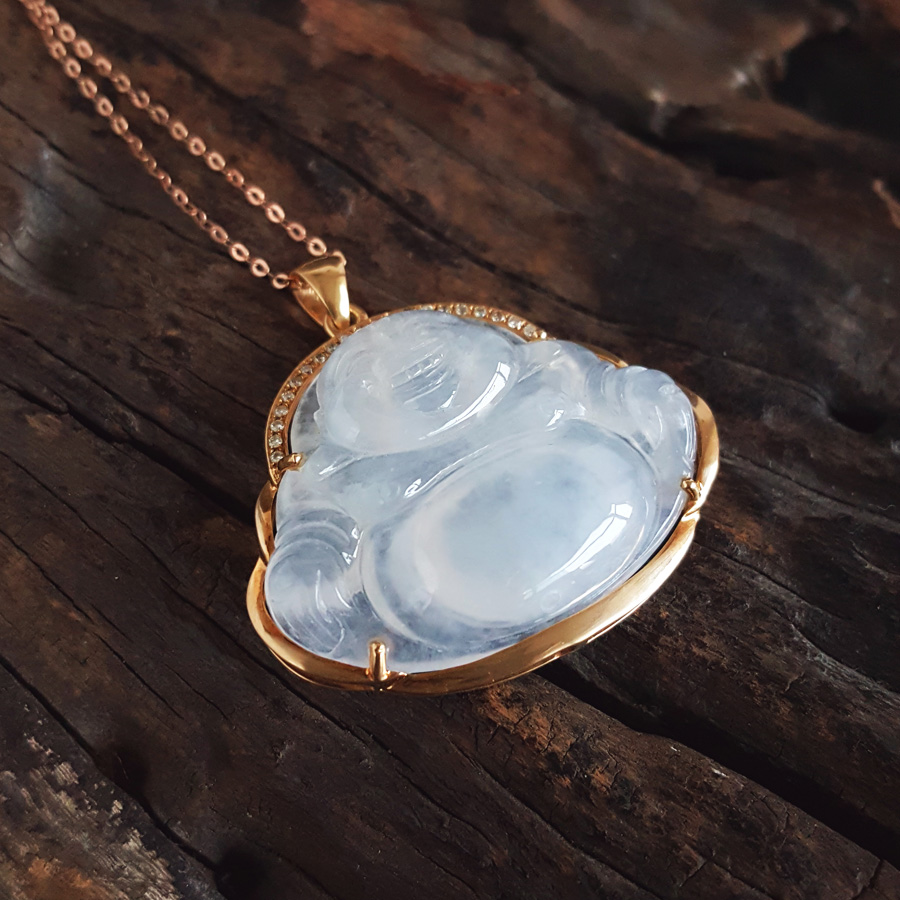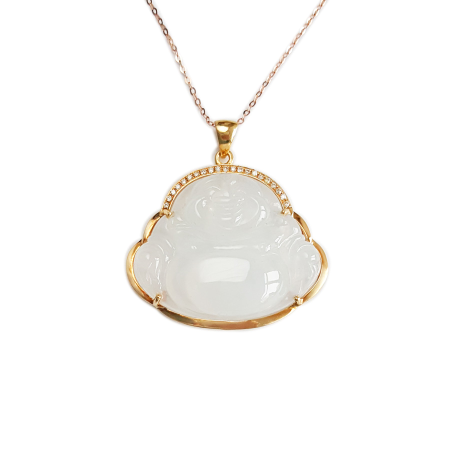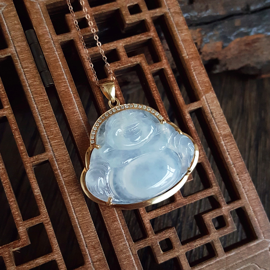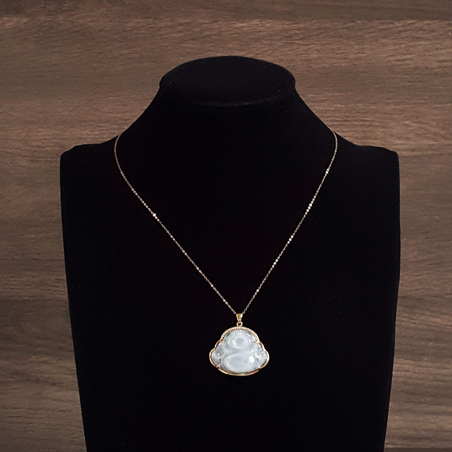 名称 | AU750黄金镶钻镶天然细腻白色冰种佛公翡翠吊坠项链 |