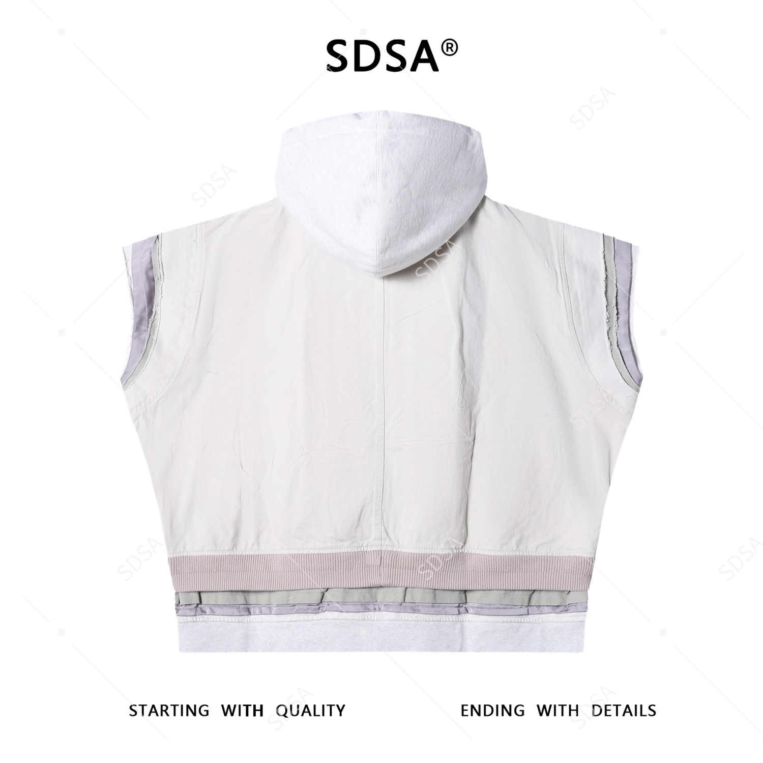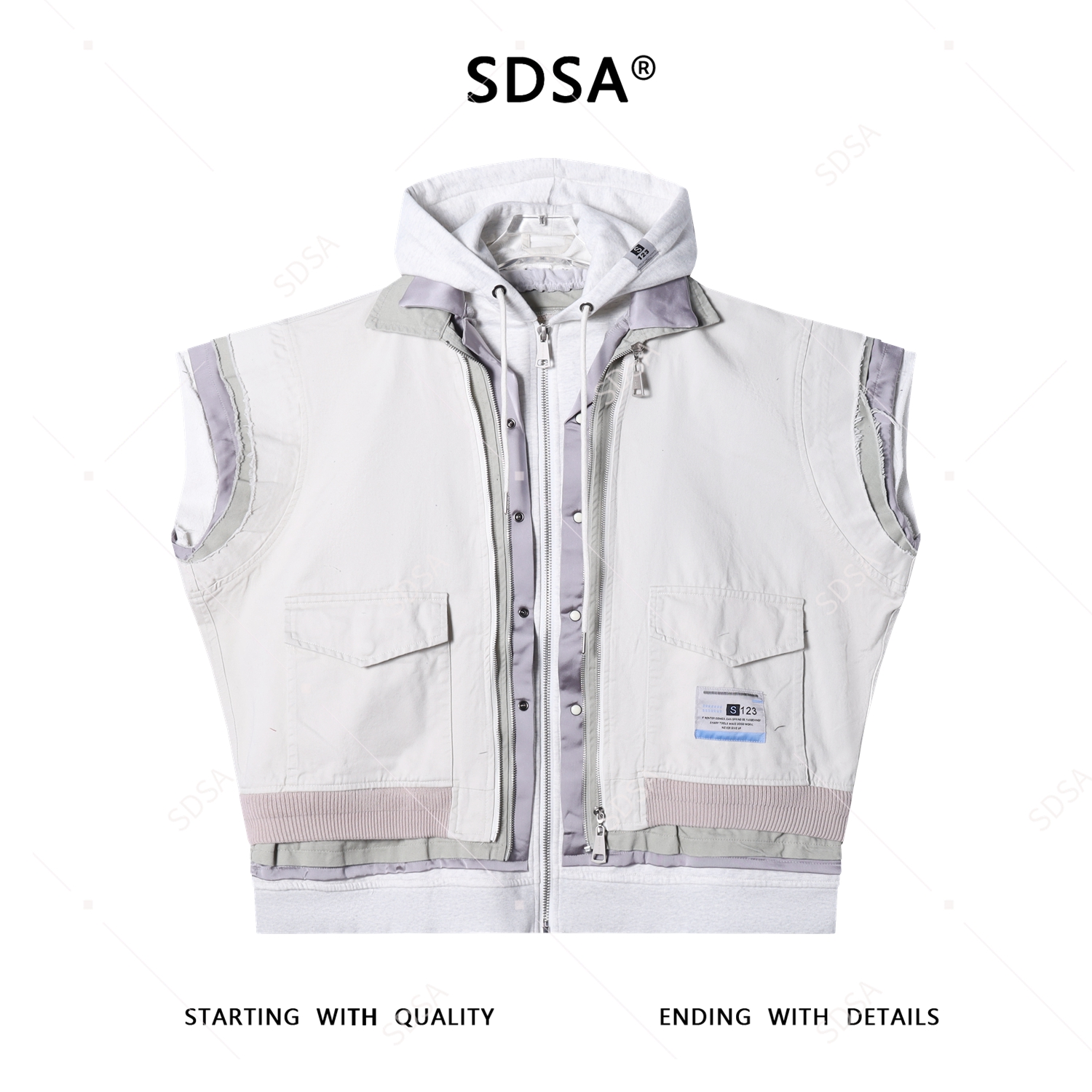 SDSA秋冬新款痞帅男装嘻哈高街拼接假两件抽绳连帽马甲百搭时尚