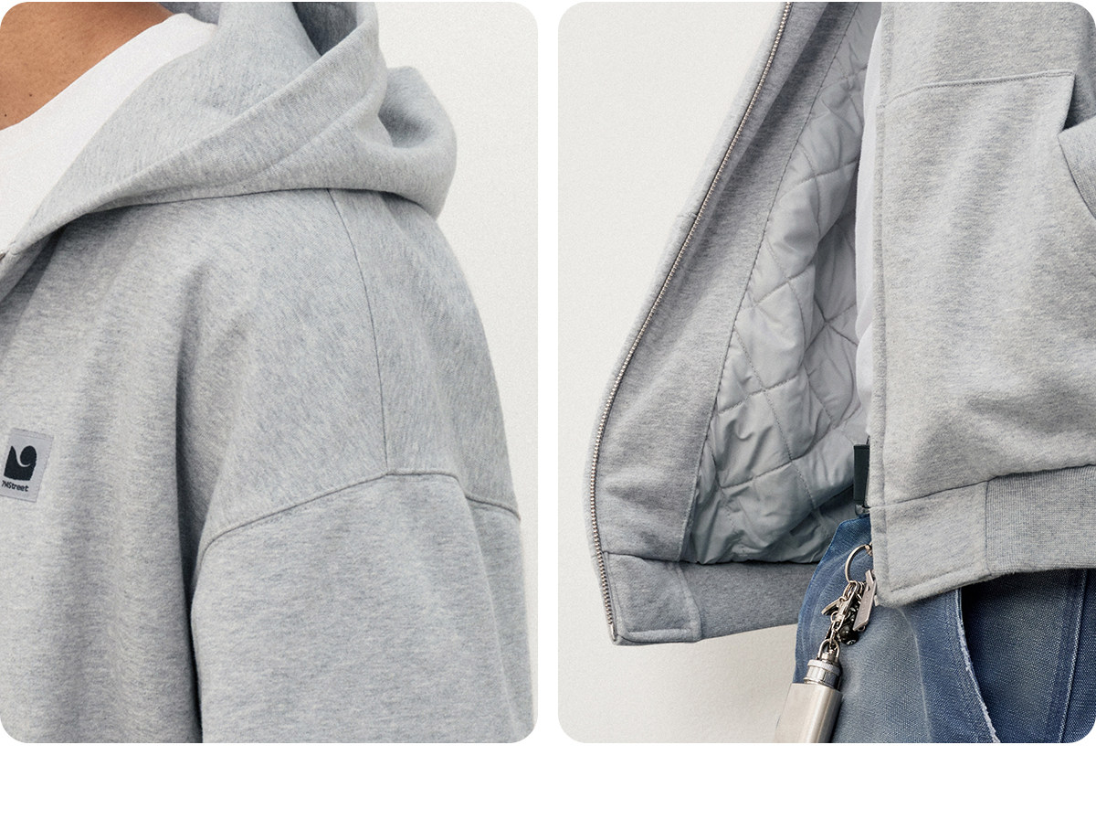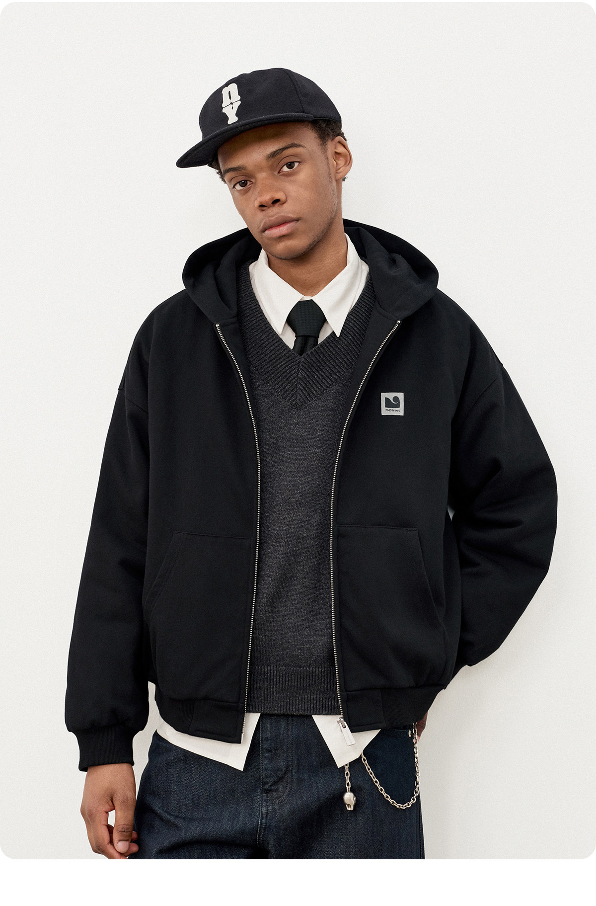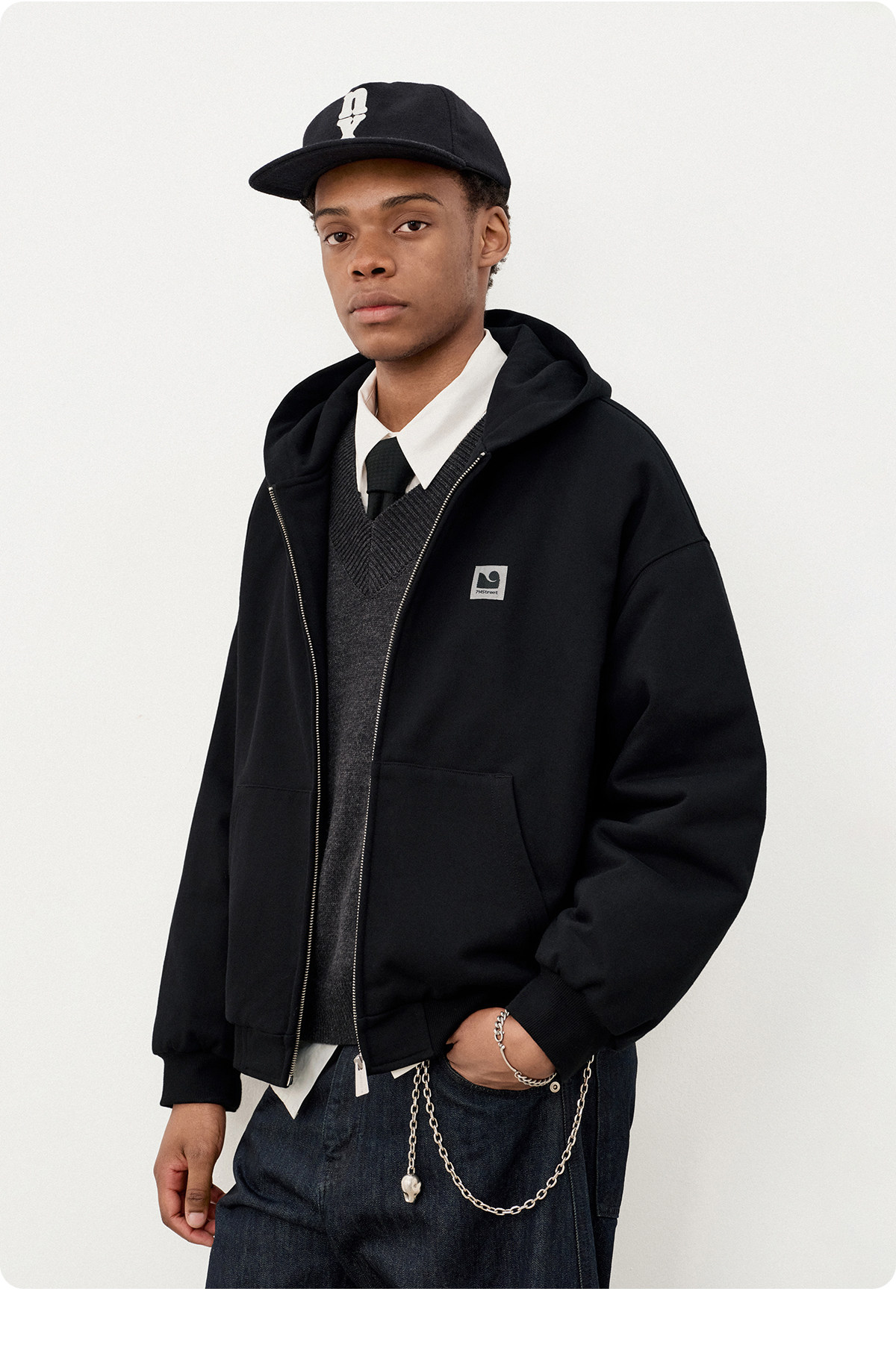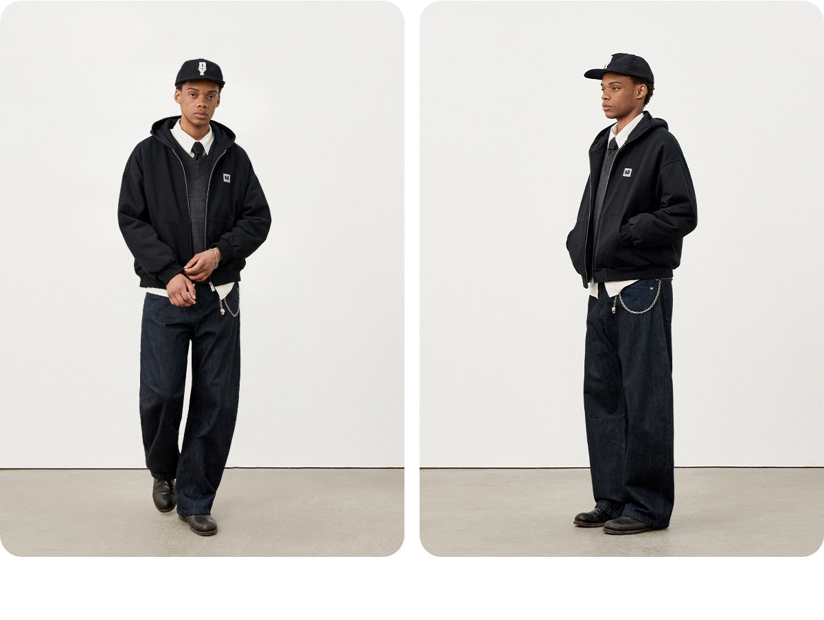714street日系连帽卫衣开衫2025冬季潮牌夹棉外套宽松针织棉服男