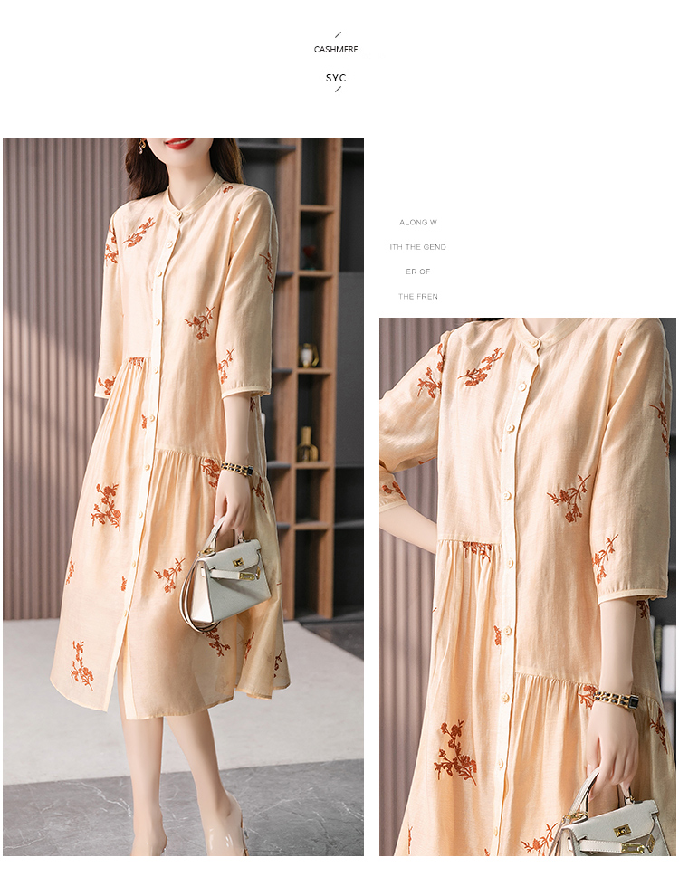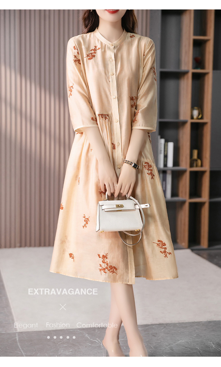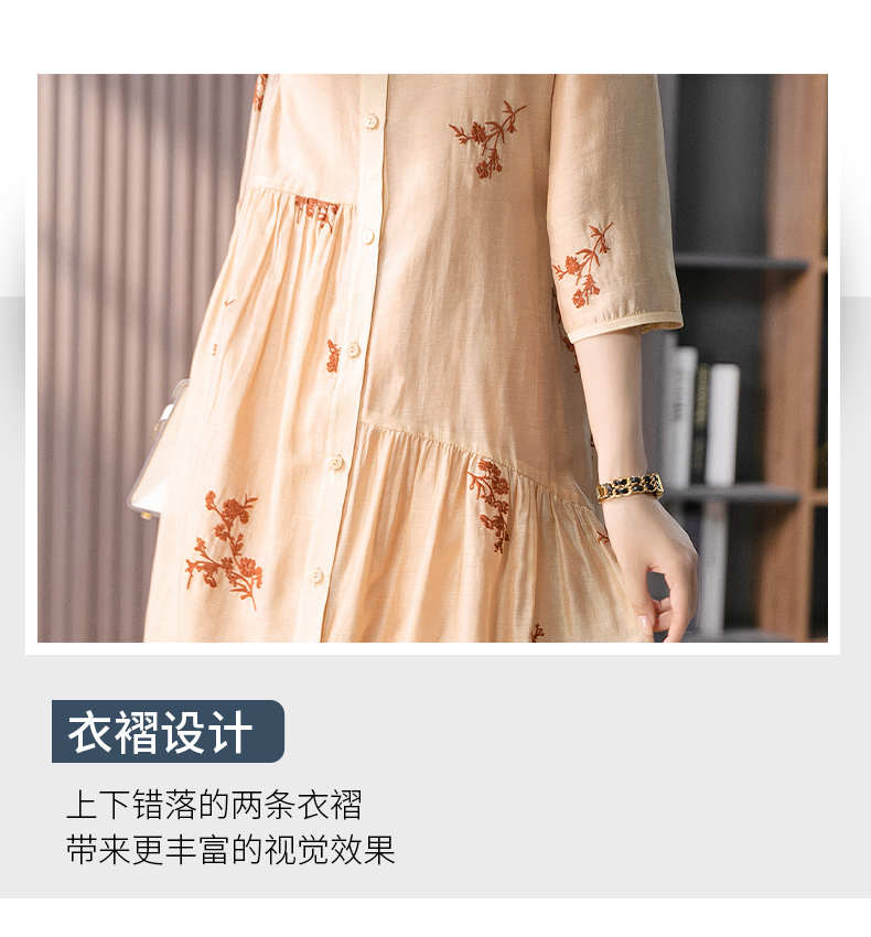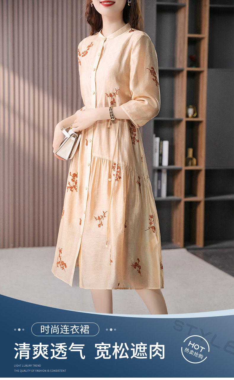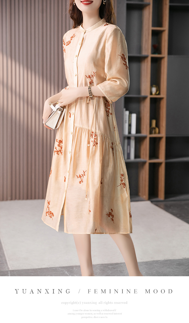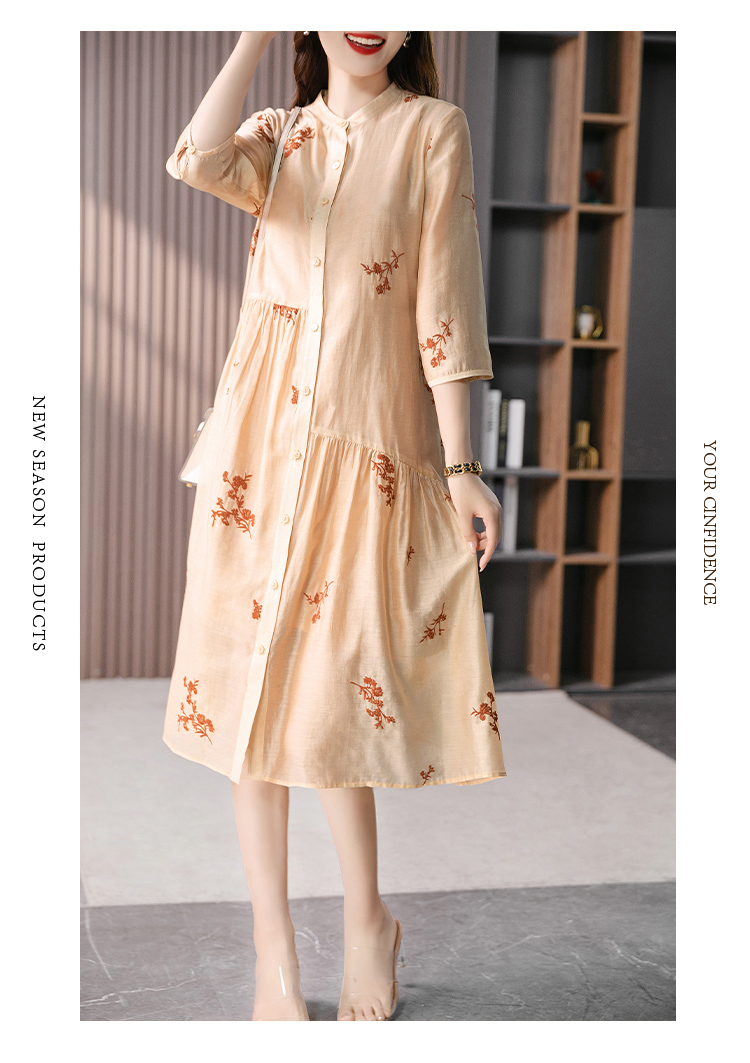 YX【现货7天】设计感立领刺绣绣花连衣裙女2023夏季新款韩版长款衬衫裙子