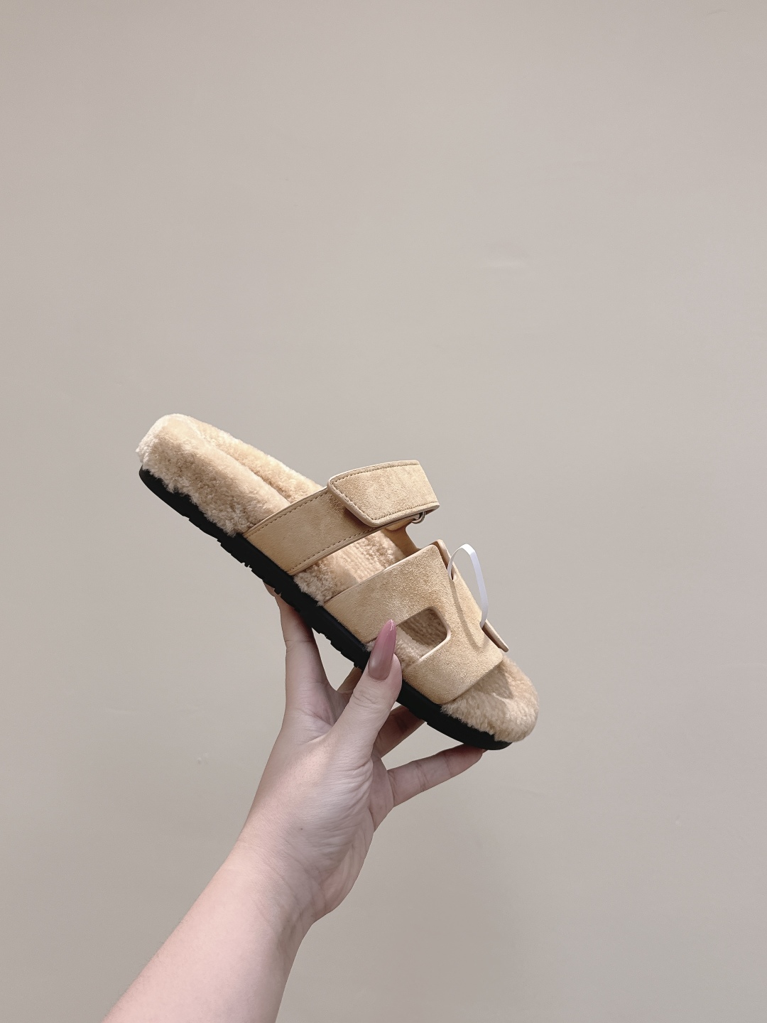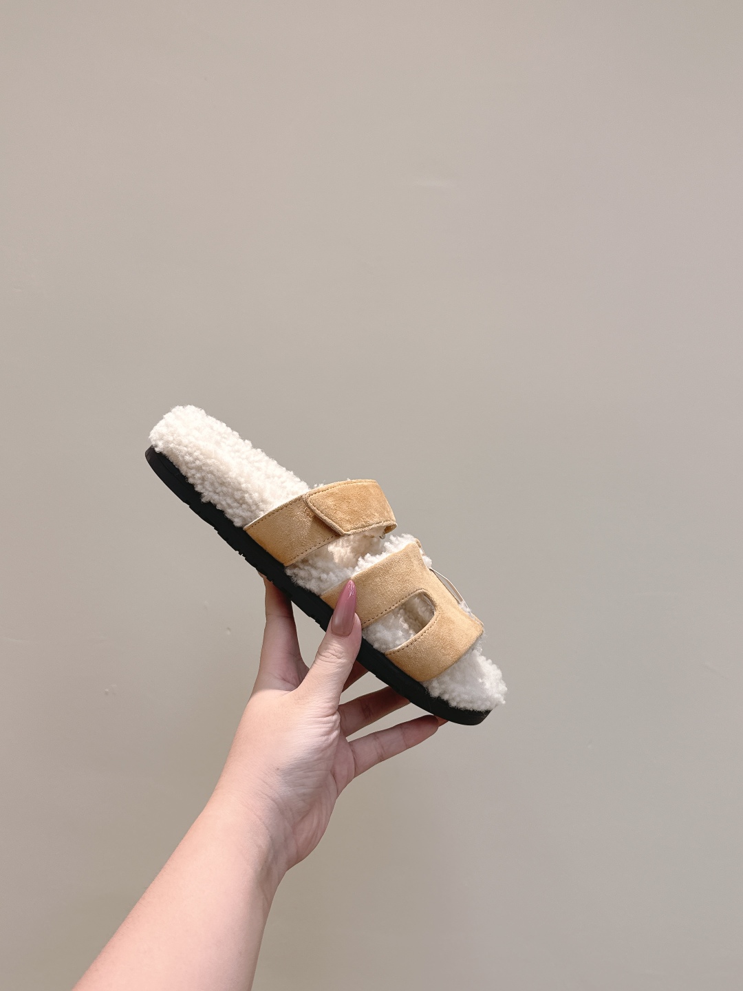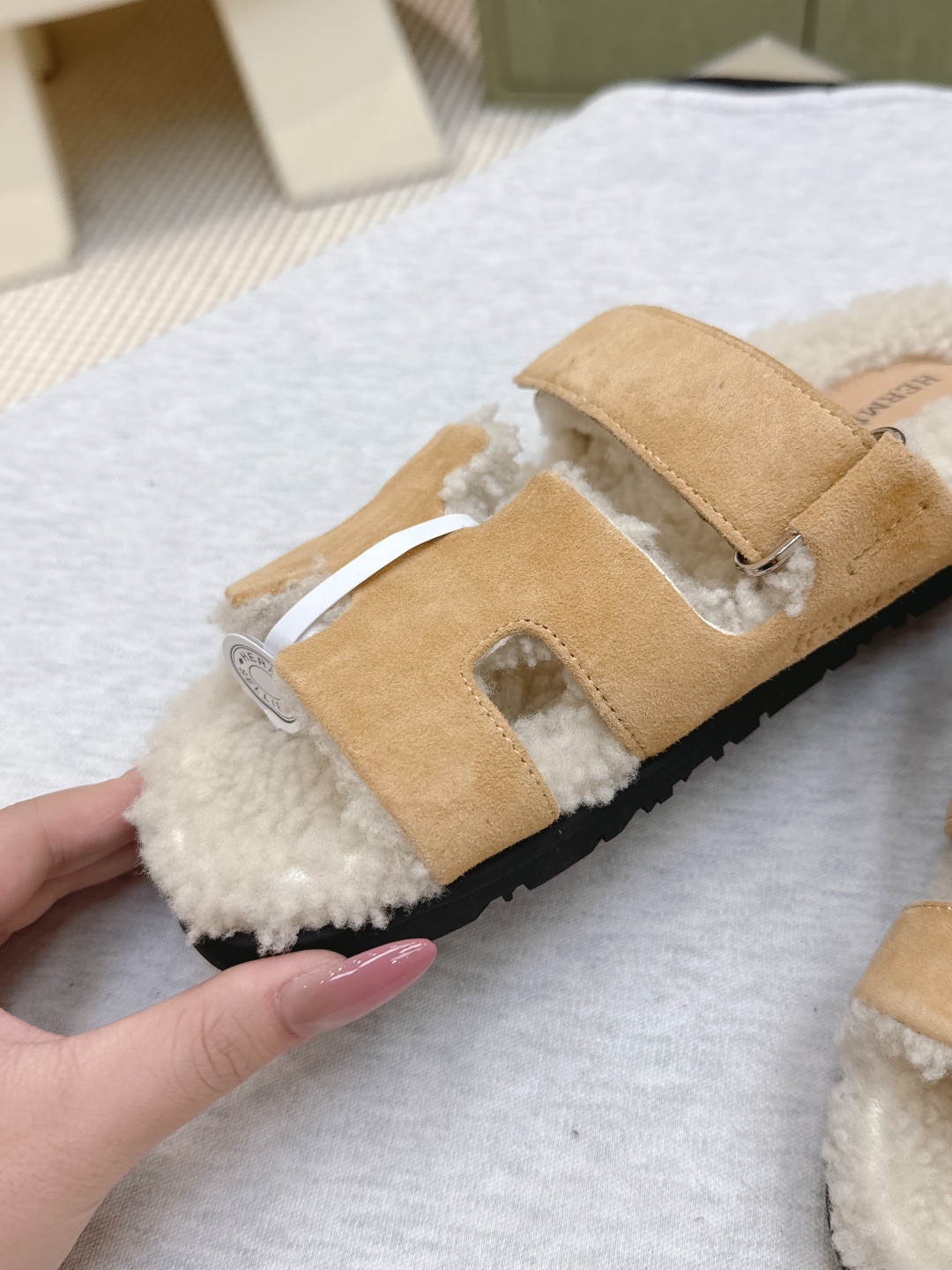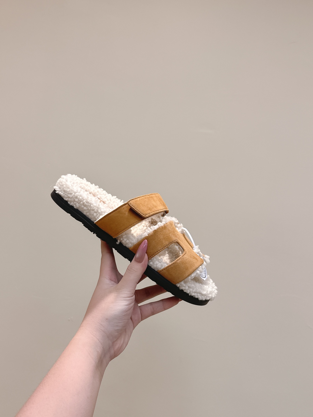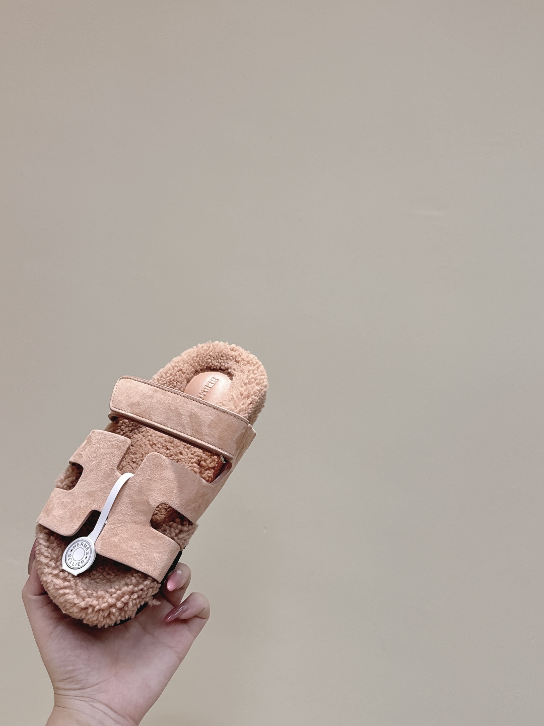 Hermes 一波惊喜爱马仕毛拖妥妥的时尚款顶级出品轻奢 hermes泰迪毛拖真的软软糯糯超美....... 初冬的第一双毛拖,真的穿起太舒服了,像踩在地毯上完全不想脱下来,俗称二舅拖鞋它来啦 带来极度舒适的一天.... 材质:进口麂皮 进口牛皮 内里:进口羊羔毛 Tpu防滑大底 Size:#35-40(40订做不退换)