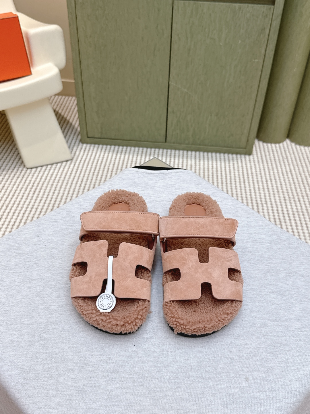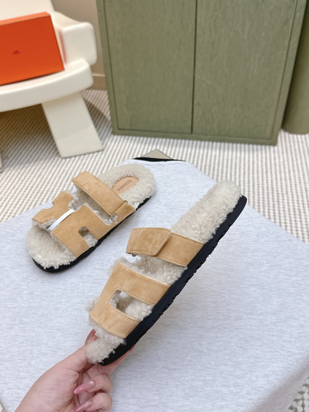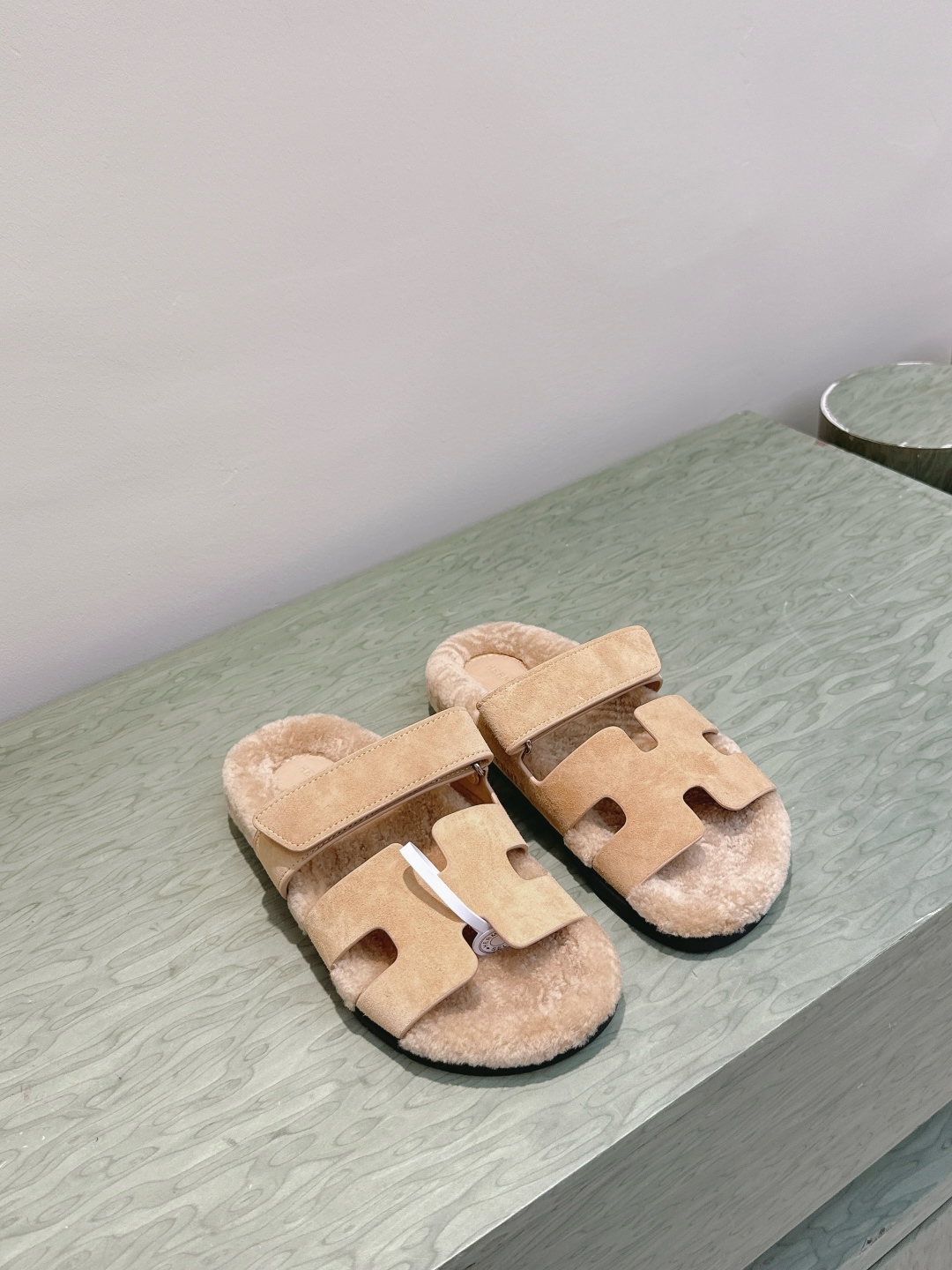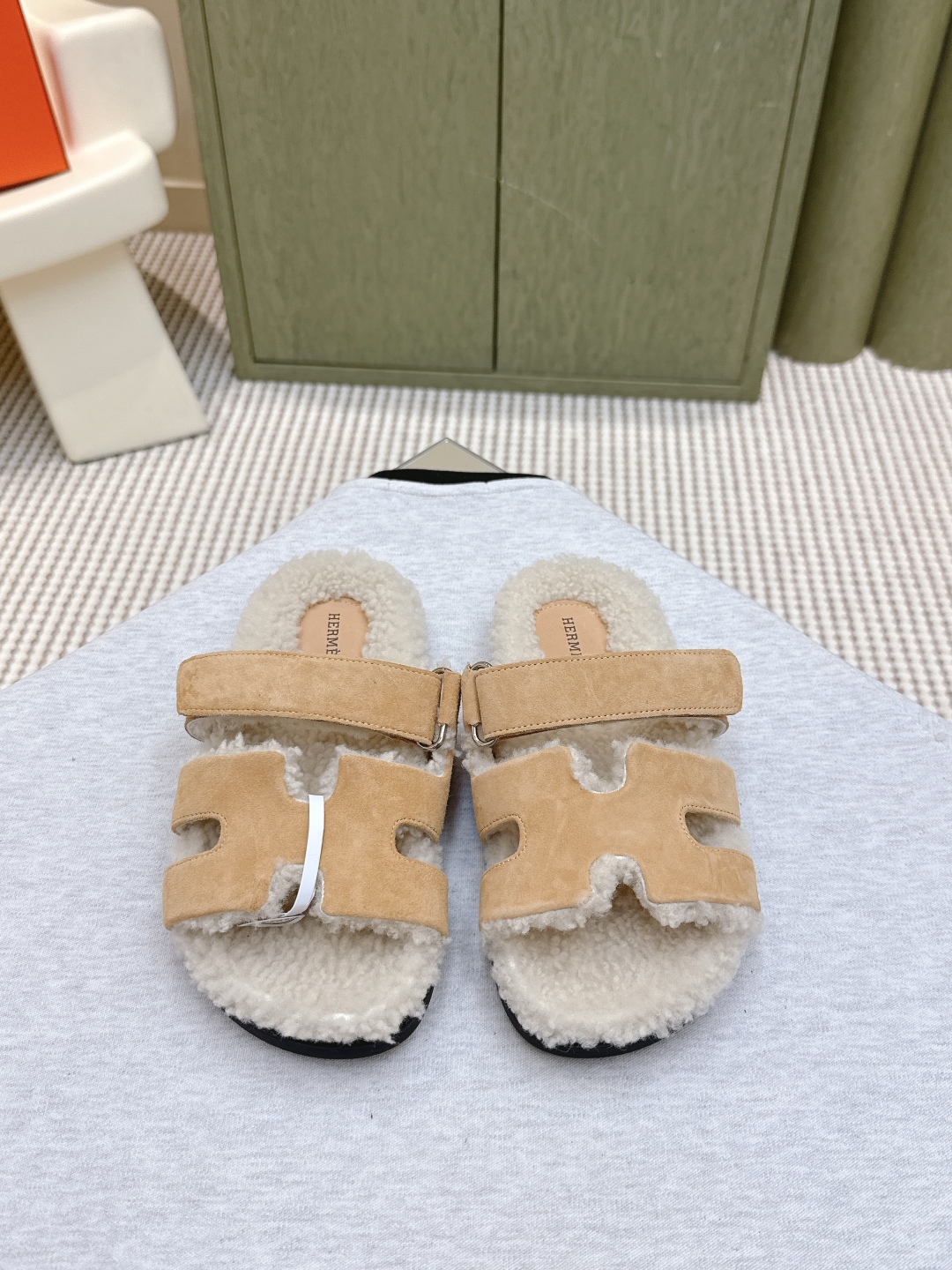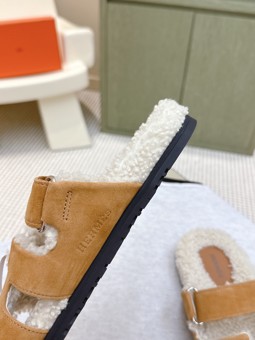 Hermes 一波惊喜爱马仕毛拖妥妥的时尚款顶级出品轻奢 hermes泰迪毛拖真的软软糯糯超美....... 初冬的第一双毛拖,真的穿起太舒服了,像踩在地毯上完全不想脱下来,俗称二舅拖鞋它来啦 带来极度舒适的一天.... 材质:进口麂皮 进口牛皮 内里:进口羊羔毛 Tpu防滑大底 Size:#35-40(40订做不退换)