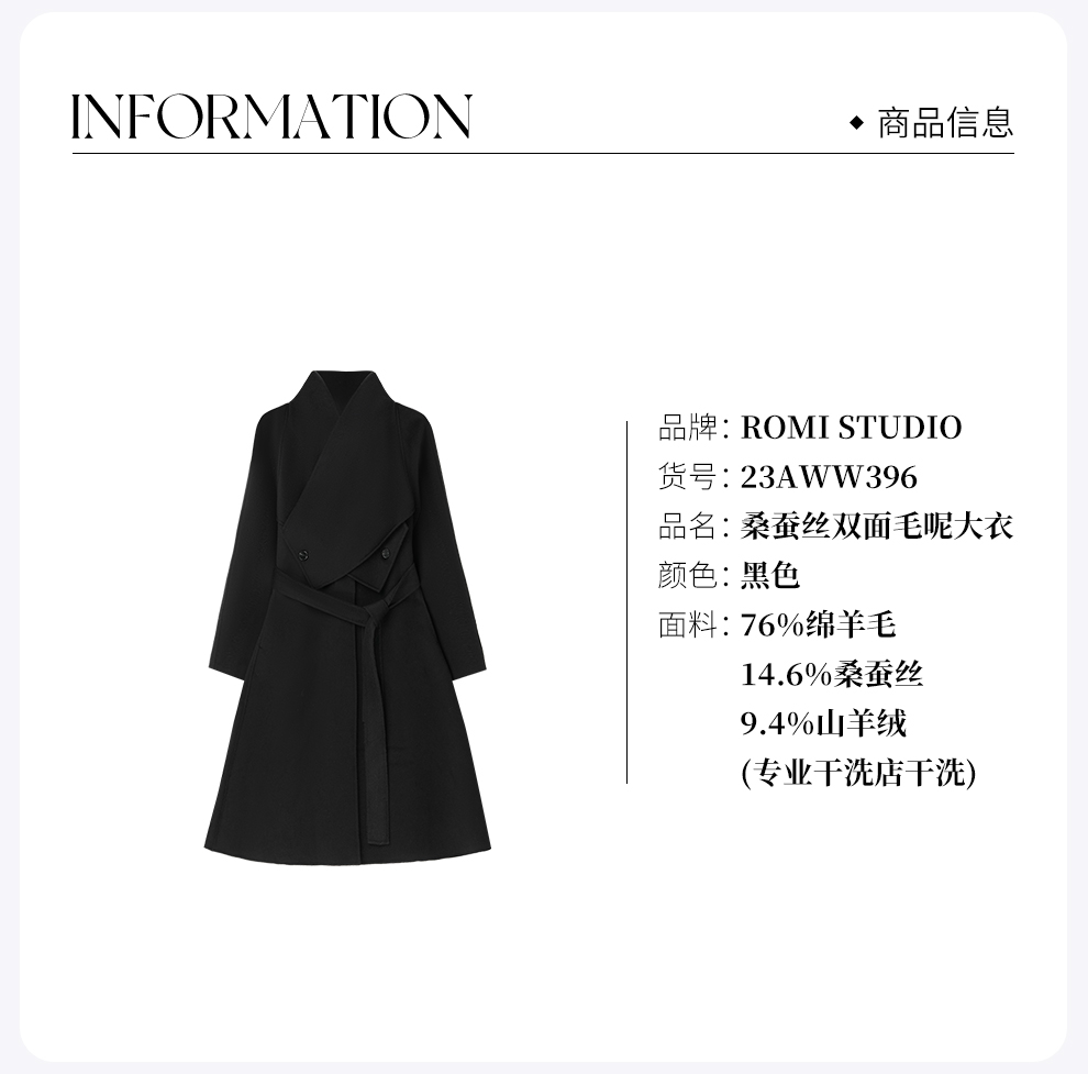 ROMI STUDIO780G羊绒桑蚕丝混纺大翻领双面毛呢大衣23AWW396