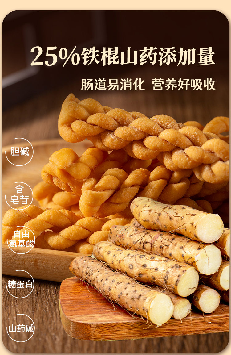 【配料表】小麦粉、铁棍山药粉(含量≥25%)、食用玉米淀粉、饮用水、鸡内金3%、精炼植物油、食用盐、香辛料、小苏打