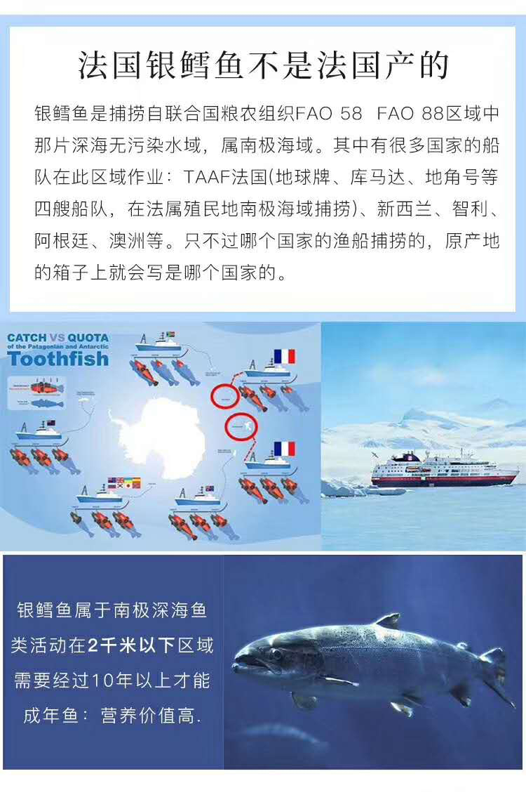 在南印度洋有两个岛屿(Kerguelen Islands和Crozet Islands),它们属法属南方和南极领地(Terres Australes et Antarctiques Françaises,简称TAAF),这两个岛屿附近的捕捞权,归法籍渔船所有,因此在此处捕捞的南极小鳞犬牙鱼被称为法国银鳕鱼,法国SAPMER集团是南极犬牙鱼合法捕捞联盟组织成员之一,捕捞区域是法国南方领土的Kerguelen Islands和Crozet Islands,采用延绳钓的方式进行捕捞,符合TAAF的每年限额捕捞管理要求,保护生态作业,同时最大程度保障鱼体的完整。每一条银鳕鱼捕捞上船后,立即去头去脏,并将尾部吊挂急冻保存,在-40℃的温度下进行保存和运输,保证每条法国银鳕鱼到达消费者手中时鲜嫩美味,如同新鲜捕捞一般。