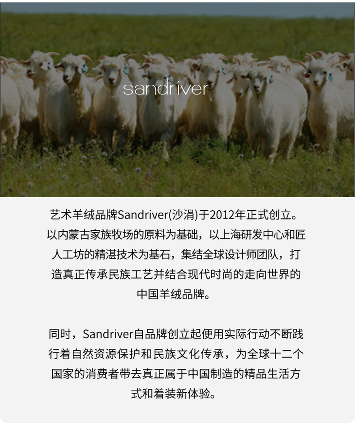 历年在巴黎时装周亮相,享誉世界的艺术羊绒品牌[Sandriver 沙涓]由羊绒布道者郭秀玲女士创立。阿拉善自有牧场纯种羔羊绒,日本国宝设计师小筱顺子,上海自有基地精工细作。承载羊绒情怀,坚持匠人品质。