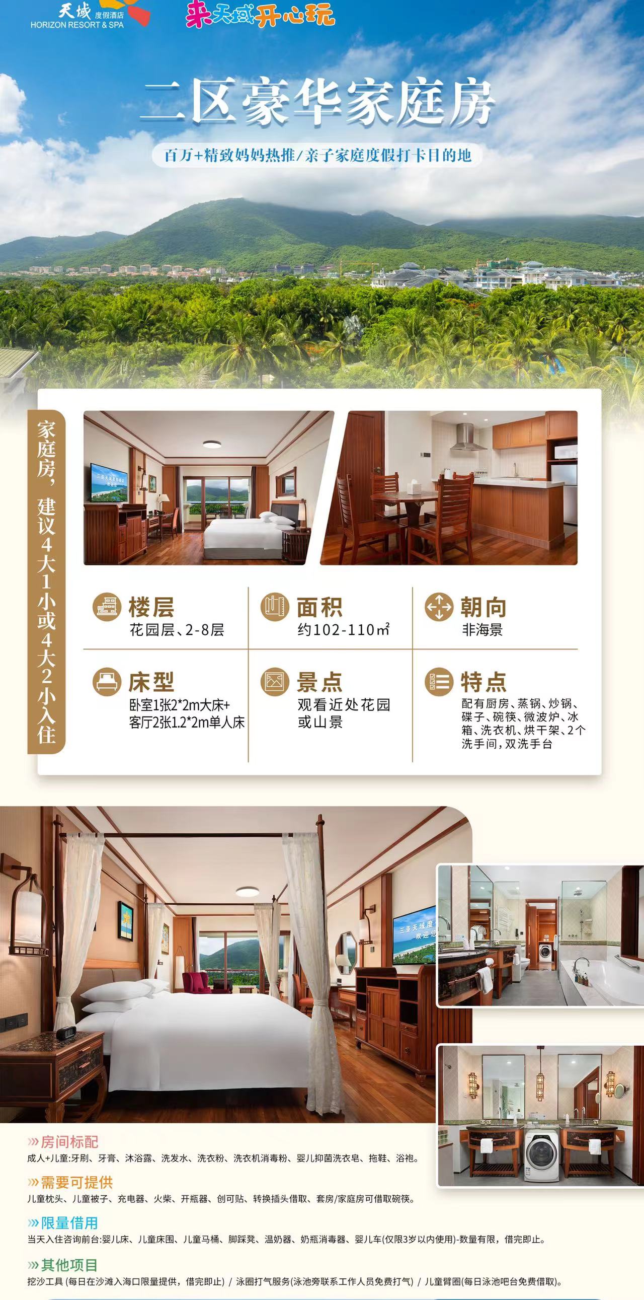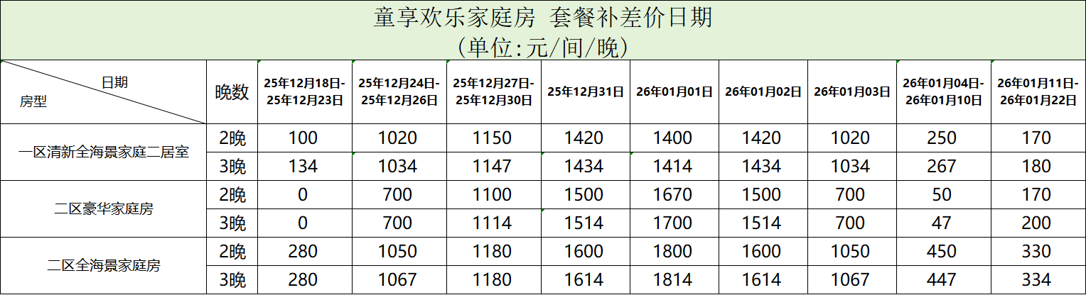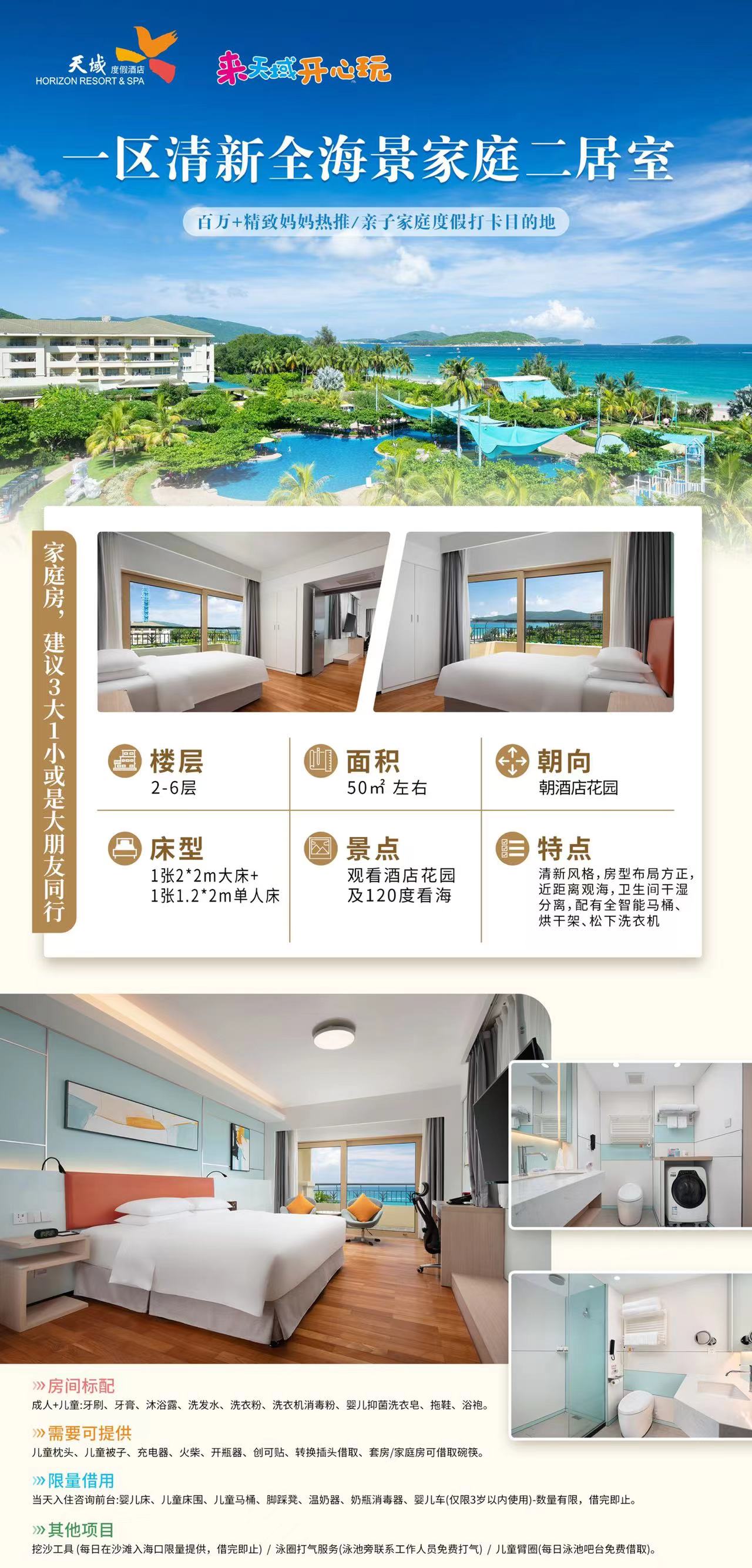 1、家庭二居室含3份中西式自助早餐、家庭房含4份中西式自助早餐(儿童1.2米以下由成人陪同免费用早餐);