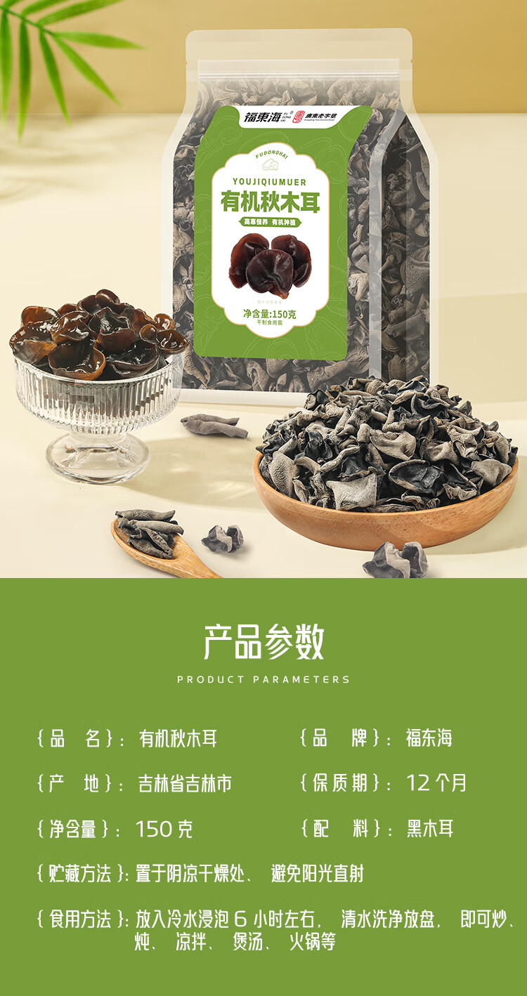 福东海 有机秋木耳150g 干木耳肉厚无根 火锅炒菜凉拌食材干货