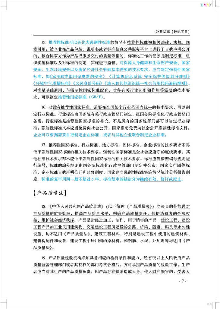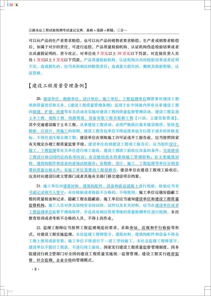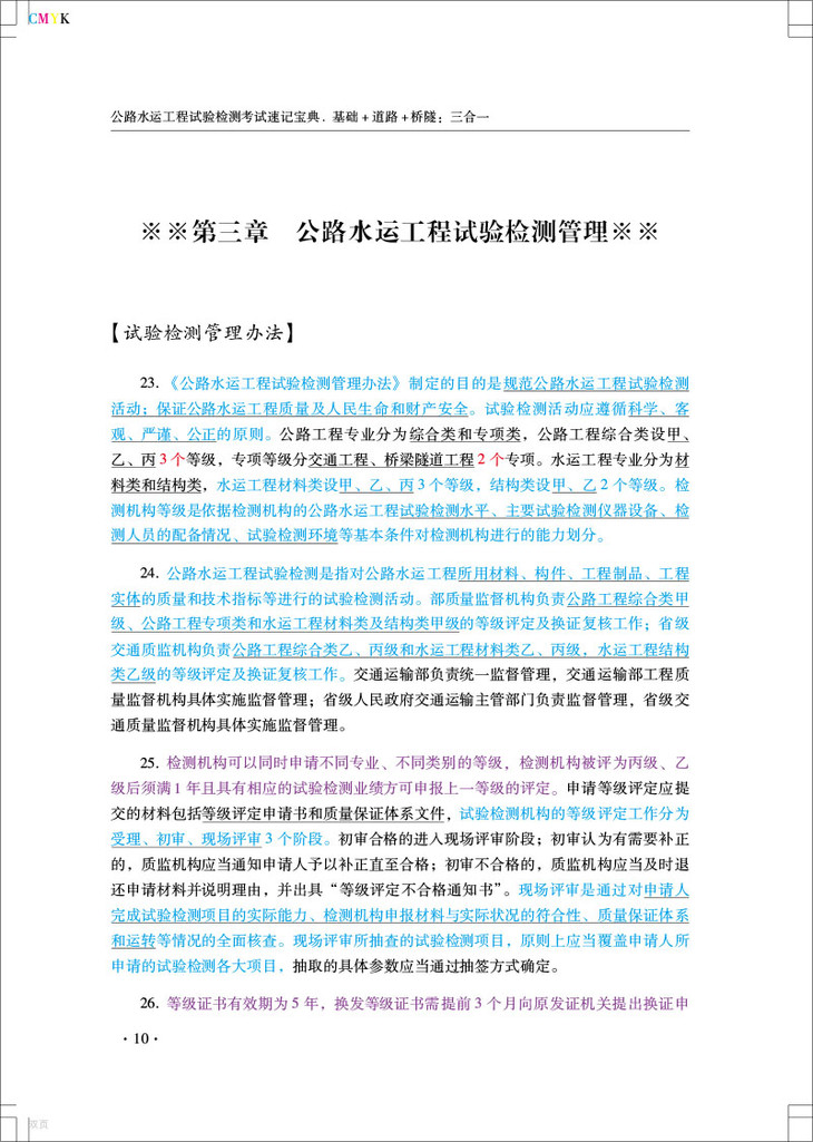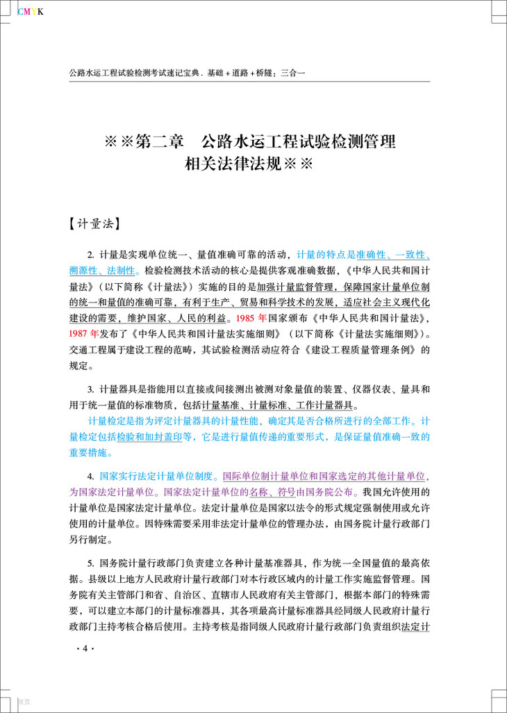 为满足广大考生的备考需要,根据2020年度(公路水运工程试验检测专业技术人员职业资格考试大纲(简称(考试大纲)的相关要求,桔心编写了本速i己宝典,桔 炼教材以帮助考生快速熟悉教材的带点,提髙复习效率。本书包含《公共基础》《道路工程>《桥梁隧道工程》,后期会增加《交通工程>、 《水运材料》和《水运结构》专业。本书对教材知识点进行了认真梳理,为方便大家记忆,采用了对比记忆和联想记忆方法,根据历年考试要点对知识点使用不同颜色进行标注,对多选题考点采用下両线标注.对数字知识点采用红色字体,对高频考点采用蓝色 字体,对超高频考点采用紫色字体,使考生在复习过程中更清楚知识点的市:要性和题型 设置本书以最新的标准规范为编写依据,(考试大纲》中明确当教材与现行标准规范不 —致时,应以现行存效的标准规范为准。所以时间充裕的考生还是要多学习规范,多进 行试验操作,提高自身试验检测的理论知识和操作技能,保证能够胜任所从事的公路水运工程试验检测工作的实际需要。