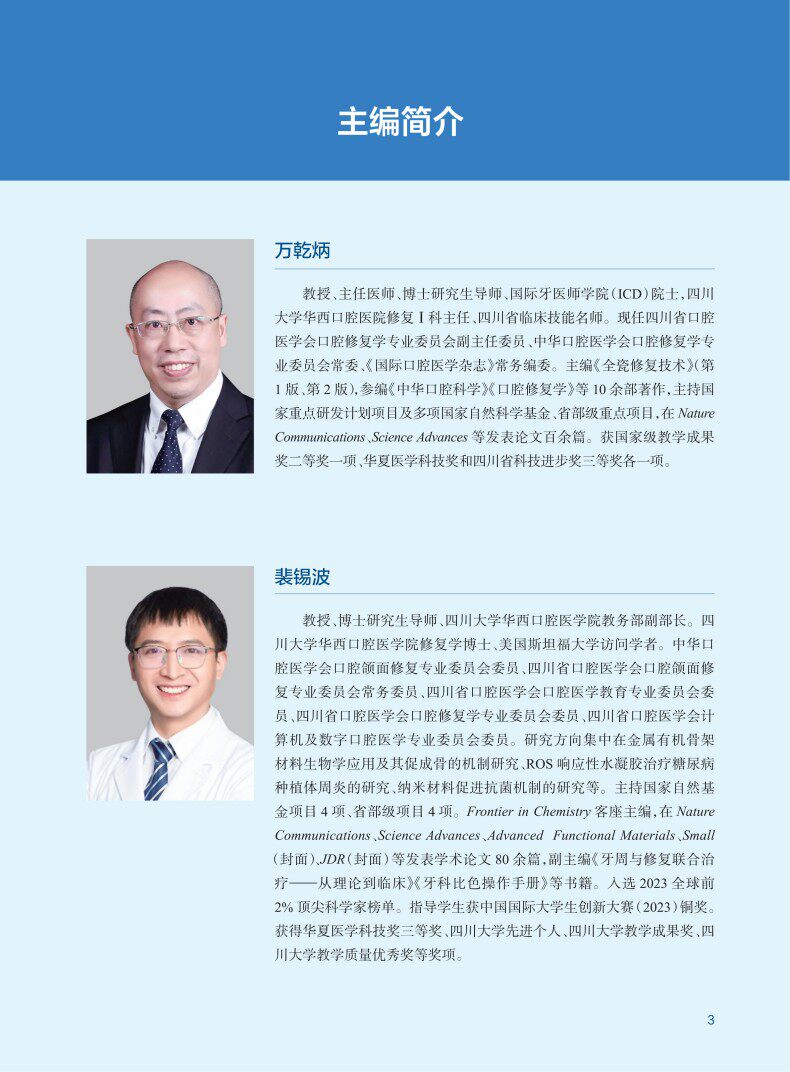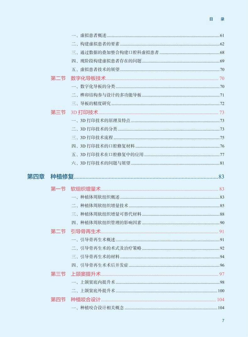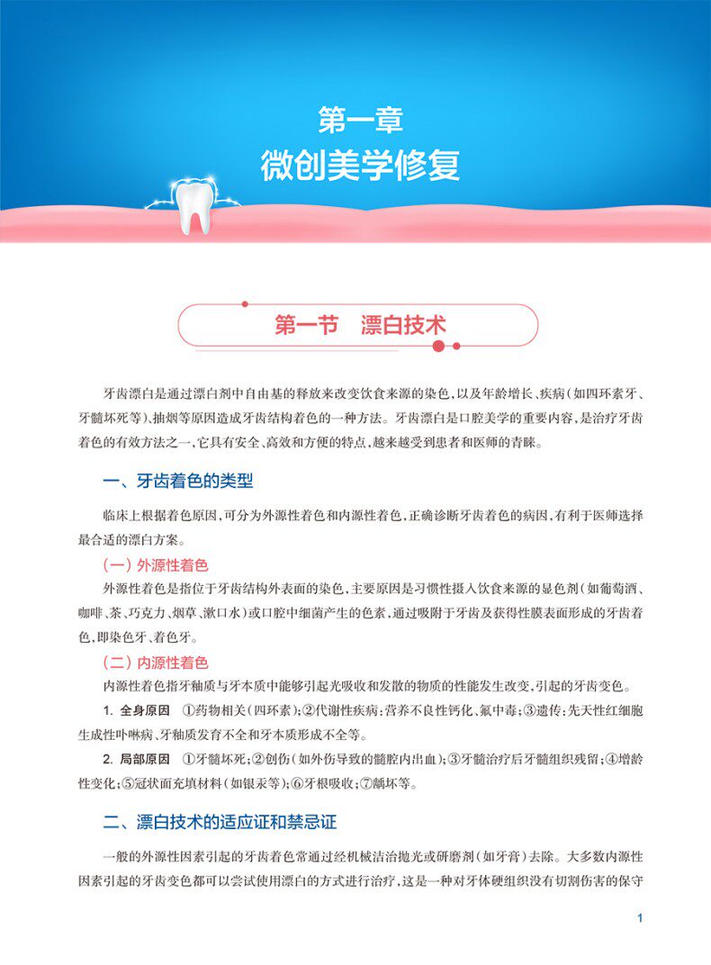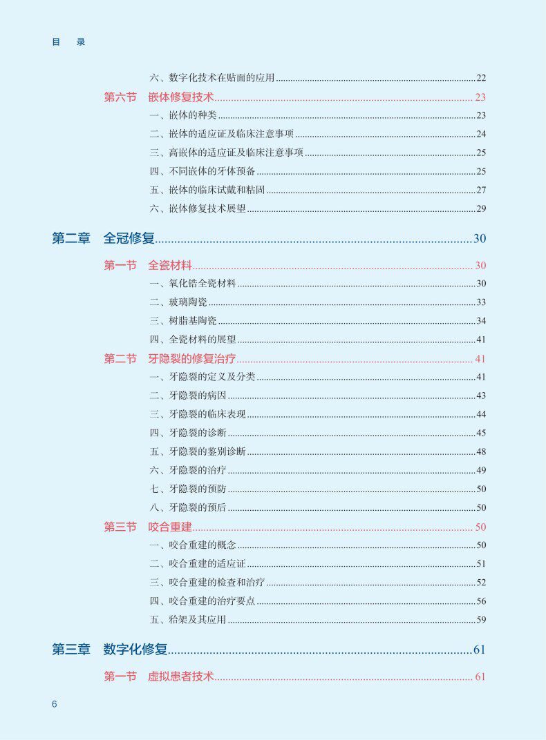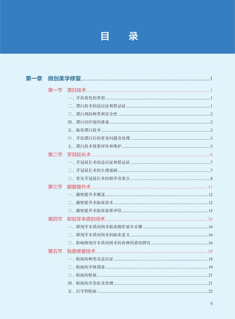 本书共四章,第一章 微创美学修复,第一节 漂白,第二节 牙冠延长术,第三节 龈壁提升术,第四节 即刻牙本质小管封闭技术,第五节 贴面,第六节 嵌体;第二章 全冠修复,第一节 全瓷技术,第二节 牙隐裂的修复治疗,第三节 咬合重建;第三章 数字化修复,第一节 虚拟患者,第二节 数字化导板,第三节 3D打印在口腔修复领域的应用进展;第四章 种植修复,第一节 软组织增量,第二节 引导骨再生,第三节 上颌窦提升术,第四节 种植咬合设计,第五节 种植体周围炎管理,第六节 颌骨肿瘤术后种植修复。