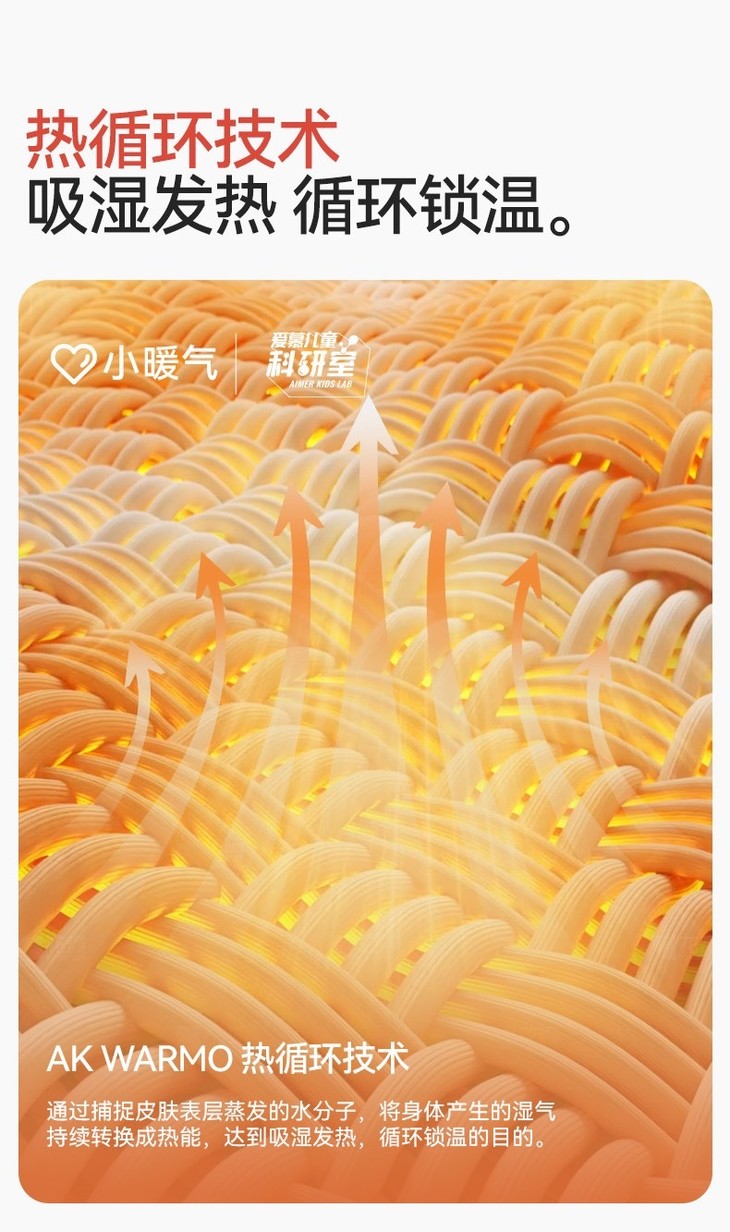 采用𝟎.𝟗𝐃超细旦纤维 细腻柔软 蓬松轻盈 好暖衣面料最为重要 独有的AK WARMO热循环黑科技 可以通过捕捉皮肤表层蒸发的水分子 将身体产生的湿气持续转换成热能 从而达到吸湿发热 循环锁温的目的