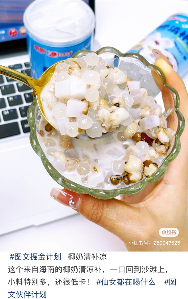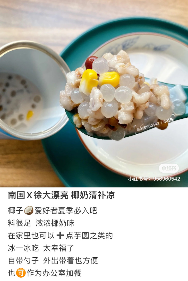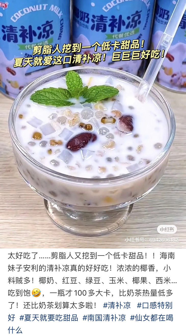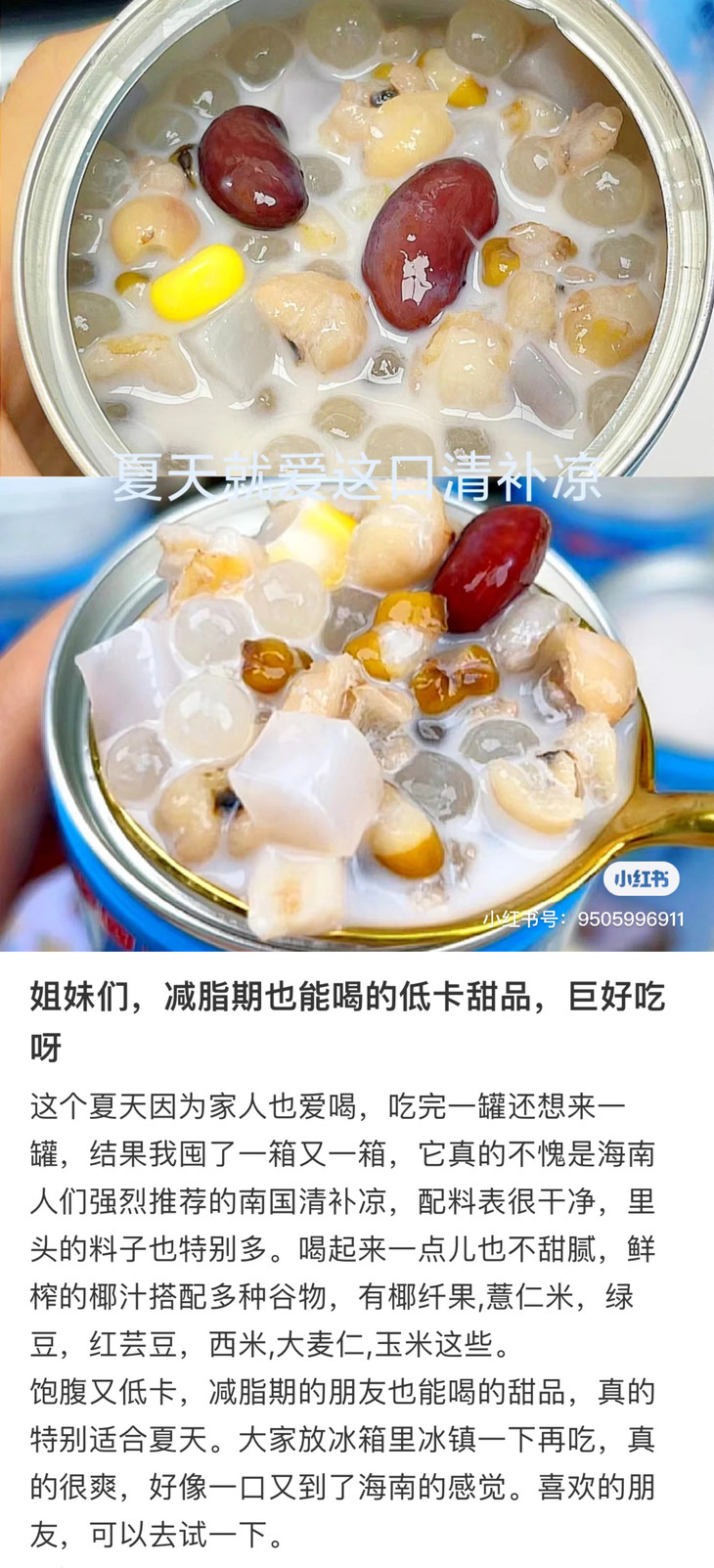 清补凉不仅正宗好吃,做代餐也非常合适,椰奶中富含满满植物蛋白,其他配料也都低卡低脂,重点是真的蛮饱腹的,卡路里比一根香蕉都低!价格也不错,一罐才不到6块,大人小孩都合适哦!