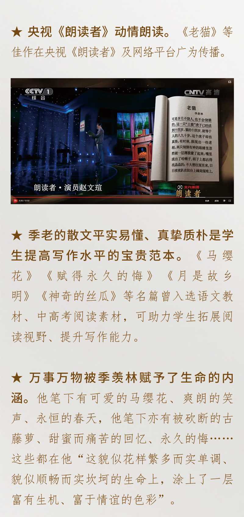 ★本书特点※季老的作品多次选入教材,其散文平实易懂、真挚质朴,是学生提高写作水平的宝贵范本。《马缨花》《夹竹桃》《赋得永久的悔》《月是故乡明》《幽径悲剧》《神奇的丝瓜》等名篇曾入选语文教材、中高考阅读素材,为名师推荐读物,可助力学生拓展阅读视野、提升写作能力。《老猫》等佳作在央视《朗读者》及网络平台广为传播。