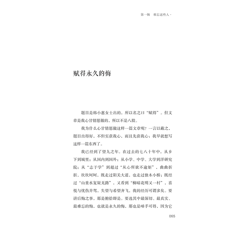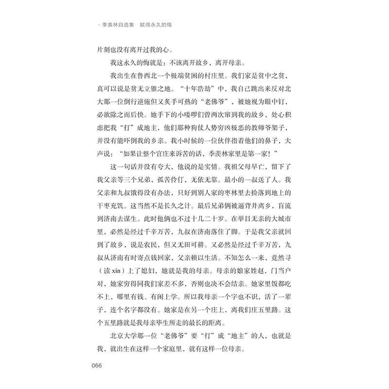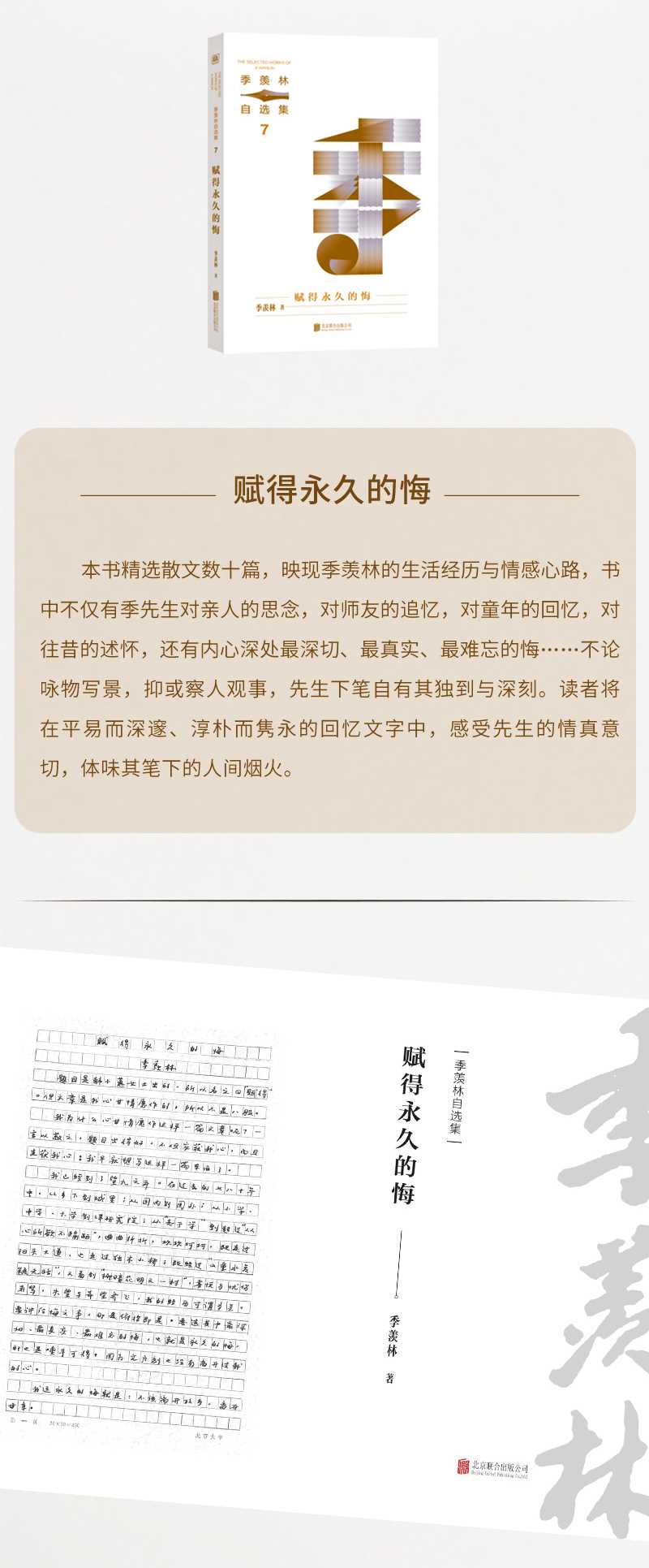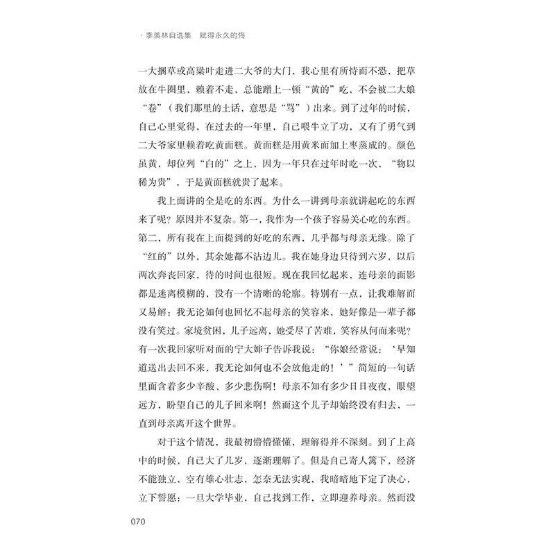 本书简介:《赋得永久的悔》精选散文数十篇,映现季羡林的生活经历与情感心路,书中不仅有季先生对亲人的思念,对师友的追忆,对童年的回忆,对往昔的述怀,还有内心深处最深切、最真实、最难忘的悔不论咏物写景,抑或察人观事,先生下笔自有其独到与深刻。读者将在平易而深邃、淳朴而隽永的回忆文字中,感受先生的情真意切,体味其笔下的人间烟火。套系简介:;季羡林自选集是季羡林先生在自己全部著作中选出的、面向大众读者的篇目之合集,是季老文章的普及文本。季羡林先生为人可敬,学问专深而文风晓畅朴实,散文优美。本套丛书充分体现了先生的治学之志、文章之风、人格之美,适合学界研究者、大众读者,尤其是青少年读之,学之。
