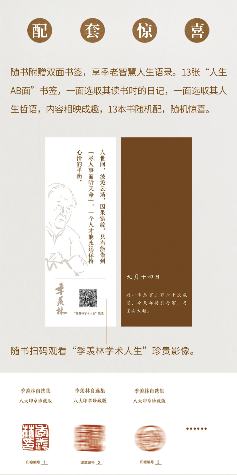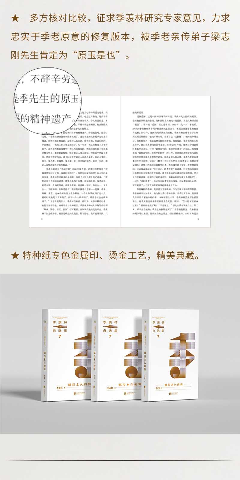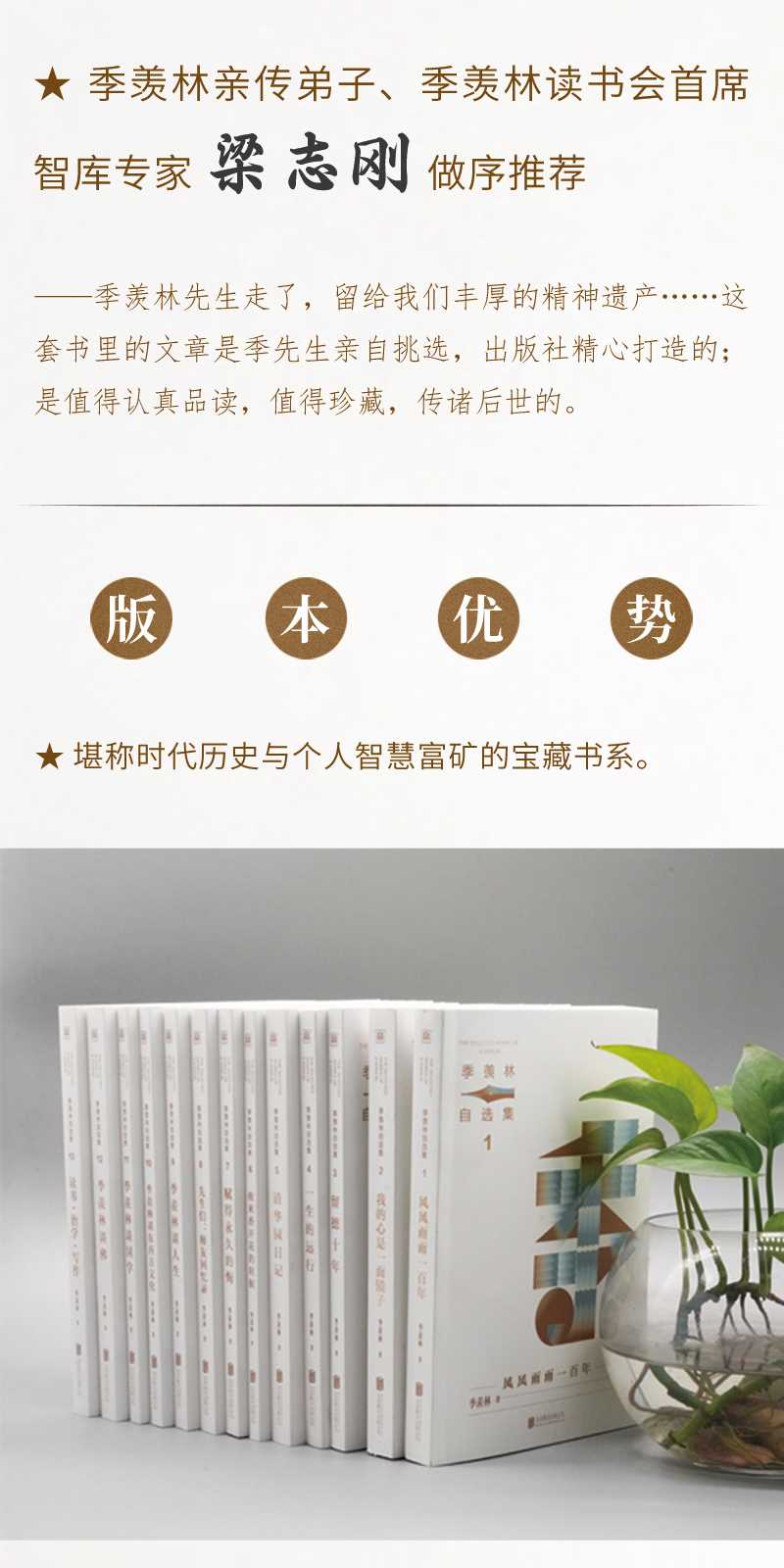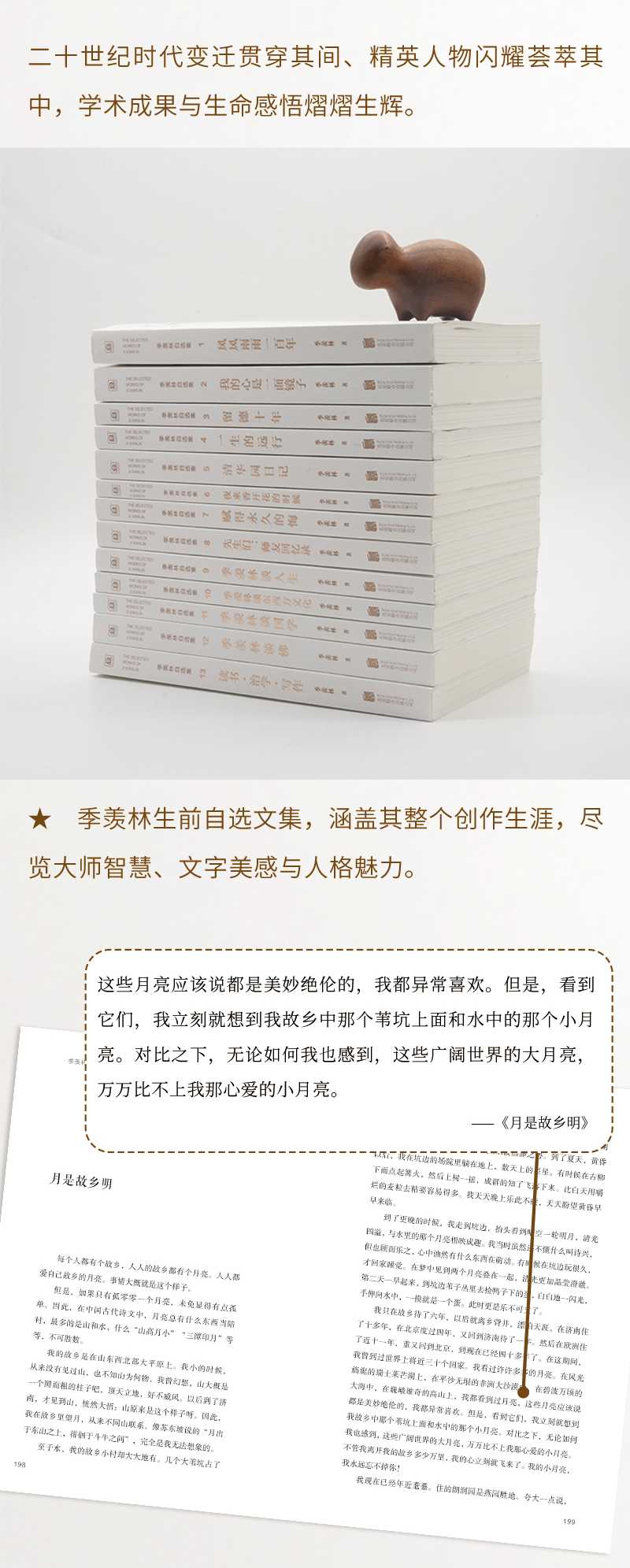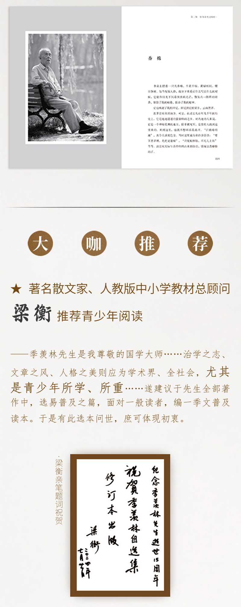【媒体评论】季羡林先生走了,留给我们丰厚的精神遗产这套书里的文章是季先生亲自挑选,出版社精心打造的;是值得认真品读,值得珍藏,传诸后世的。季羡林亲传弟子、季羡林读书会首席智库专家 梁志刚季羡林先生是我尊敬的国学大师治学之志、文章之风、人格之美则应为学术界、全社会,尤其是青少年所学、所重遂建议于先生全部著作中,选易普及之篇,面对一般读者,编一季文普及读本。于是有此选本问世,庶可体现初衷。著名散文家 梁衡季先生散文的特点是:在朴实中蕴含着优美,在静穆中饱含着热情,在飘逸秀丽中不失遒劲和锋刃,在淳朴亲切的娓娓道来中给人以强烈的震撼,在诙谐隽永的语言中蕴含着深刻的人生哲理,在行云流水般的字里行间凸显先生的人格魅力。北京女美术家联谊会理事、中国女画家协会会员 林江东