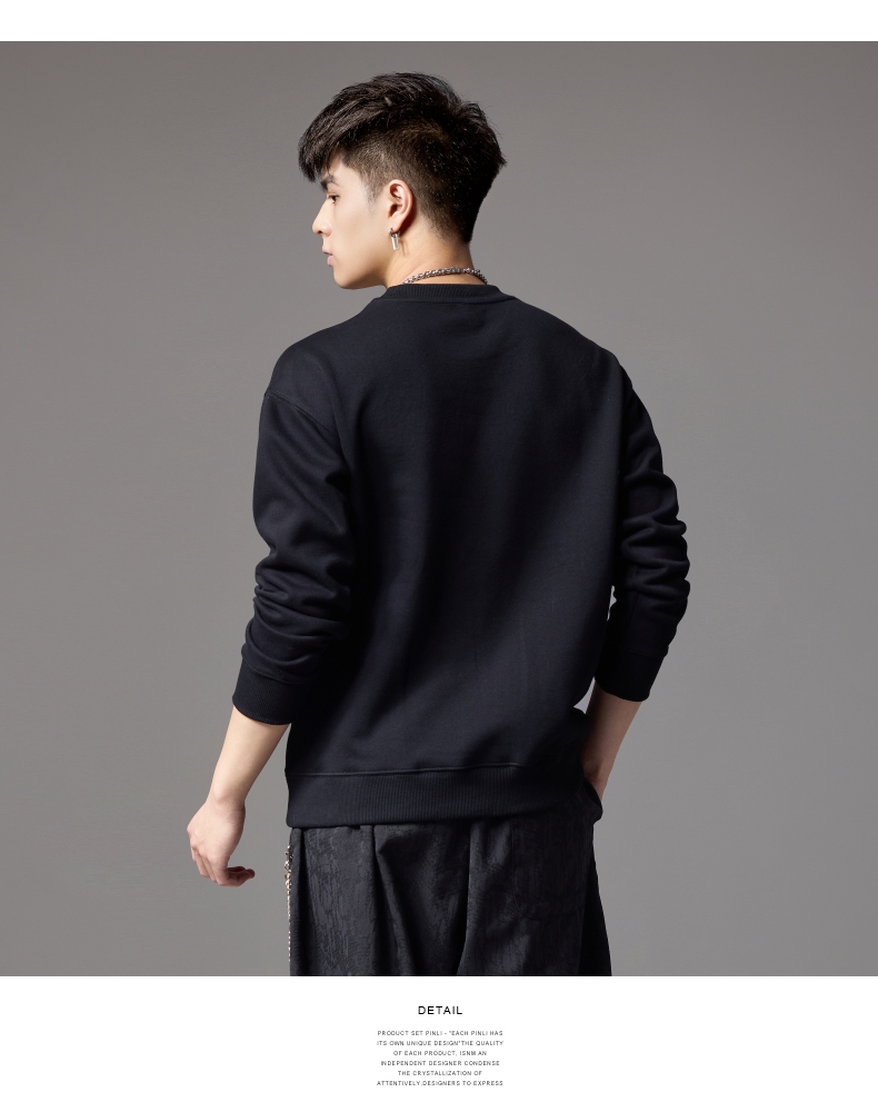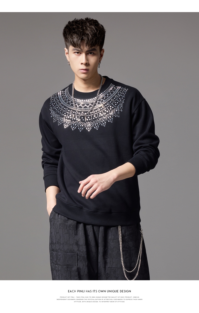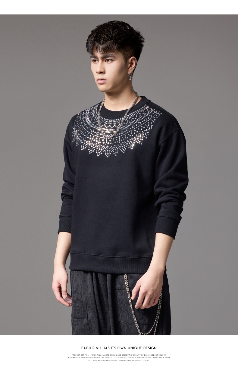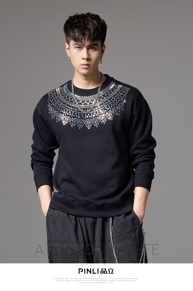 PINLI品立秋季新款男士圆领宽松金属烫片套头卫衣BG243109035
