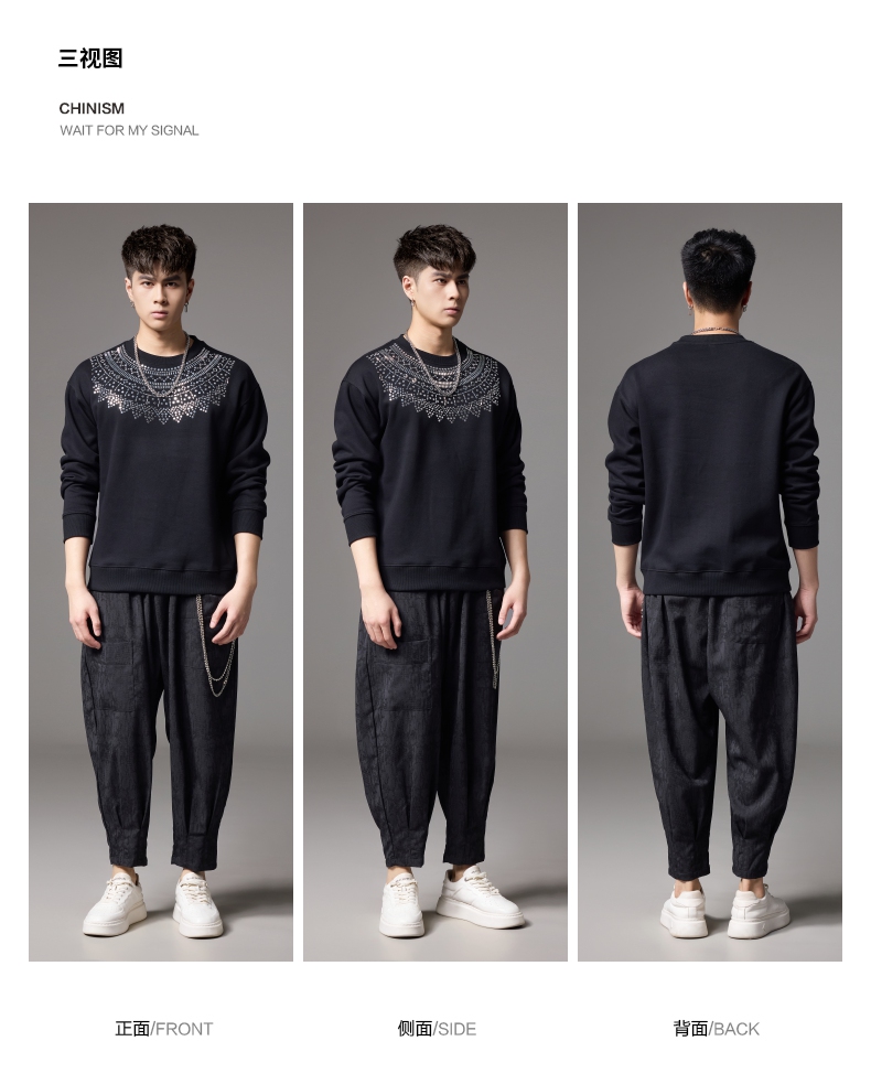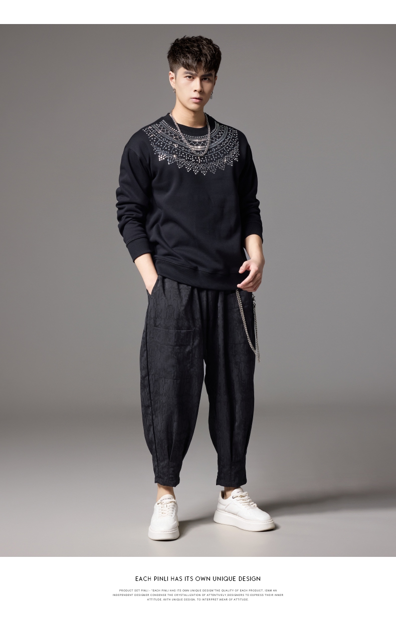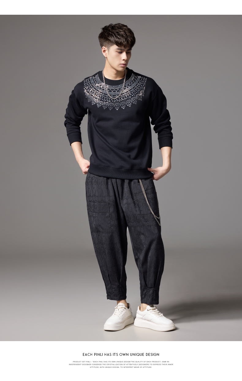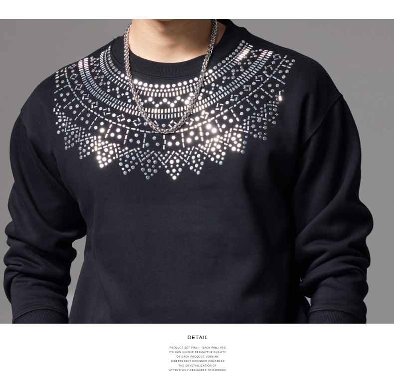 PINLI品立秋季新款男士圆领宽松金属烫片套头卫衣BG243109035