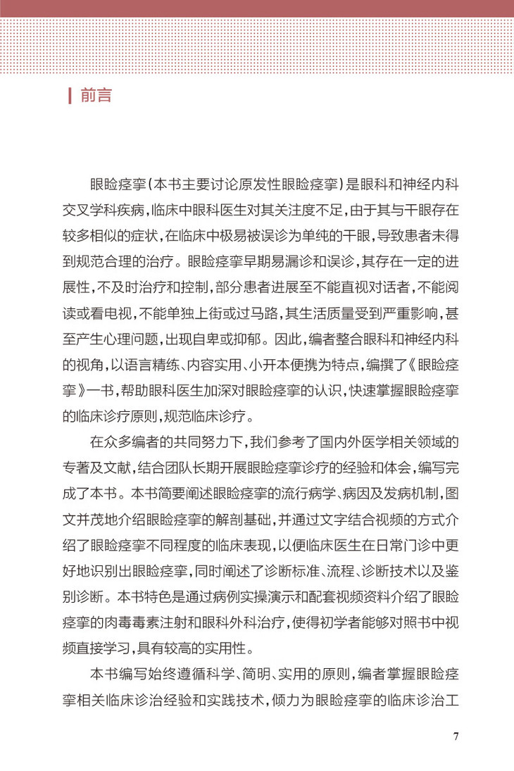1.本书介绍了特发性眼睑痉挛的流行病学、解剖基础、发病机制,着重介绍眼科临床中特发性眼睑痉挛的临床表现、诊断、鉴别诊断、其与干眼的关联,并通过病例实操演示和配套视频资料特色阐述特发性眼睑痉挛肉毒素注射、眼科外科治疗,使得临床医生能够得到更为实用性的学习和培训。